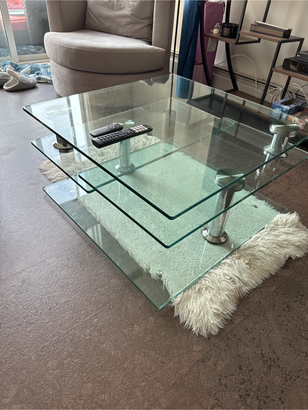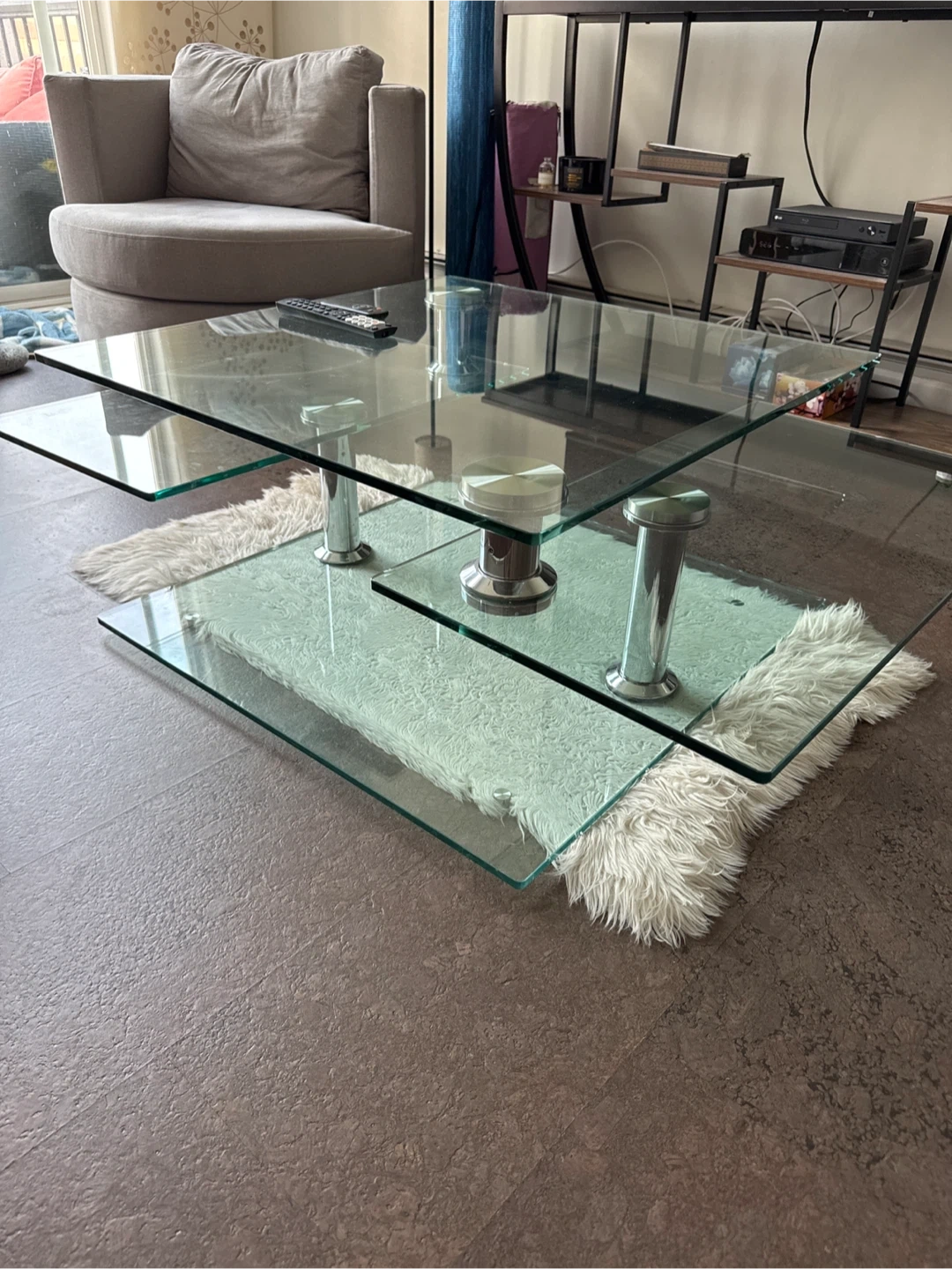Selling a glass coffee table, multi-tiered design with clear glass shelves. It’s an infinity table, so it can be moved continuously without the shelves fabricating, and can be placed in multiple configurations. 30.5 X 30.5 in tucked in configuration 30.5 X 50 in shelves out configuration