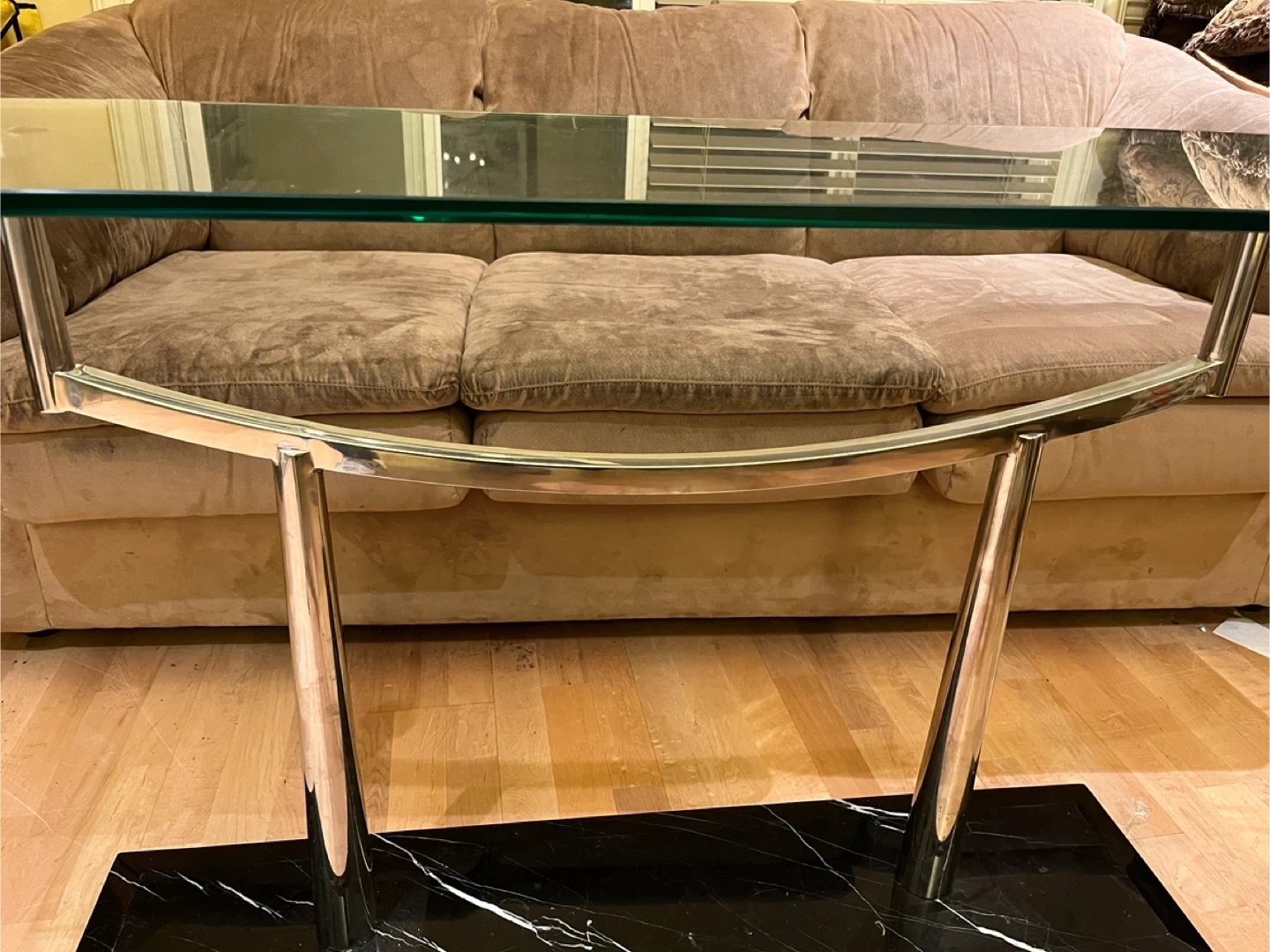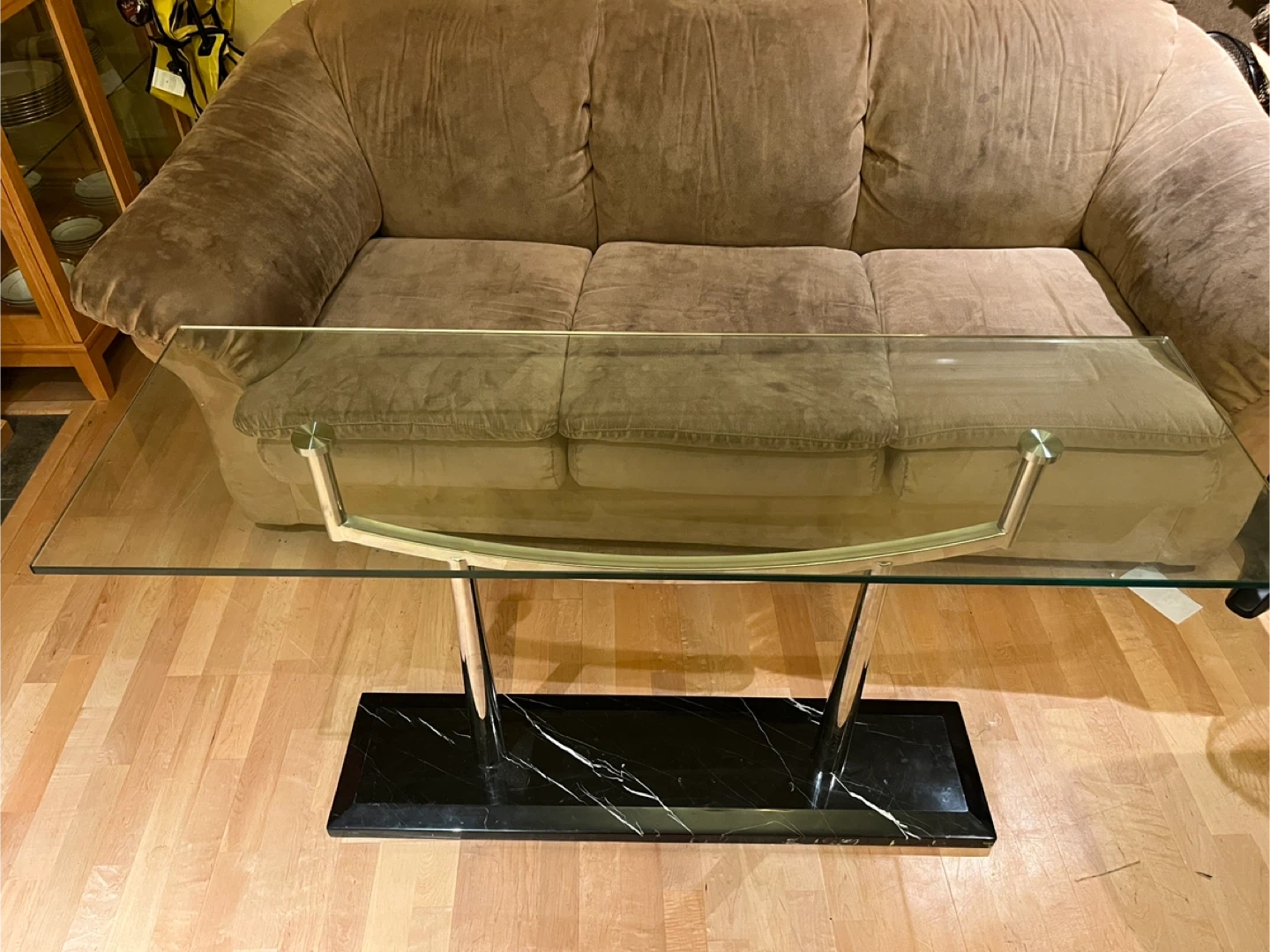 Selling a stylish coffee table featuring a glass top, chrome legs, and a black marble base with white veining. It's in great condition and would make a lovely addition to any living room!