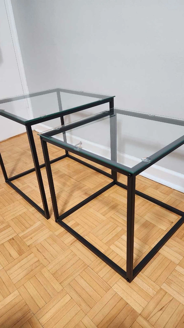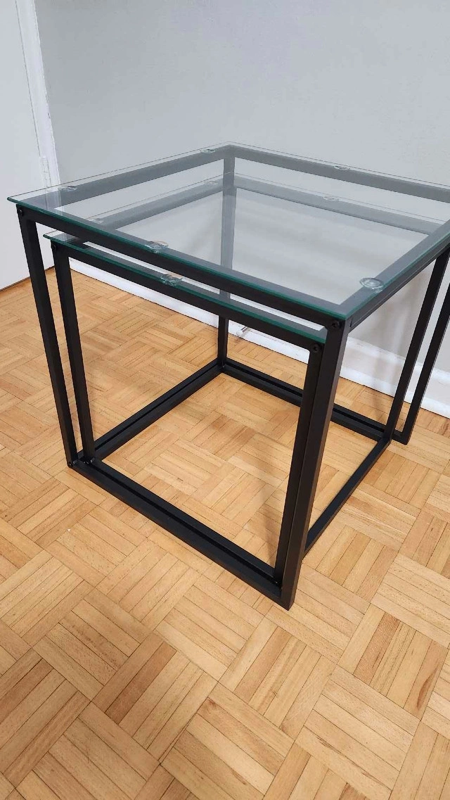 This coffee or side table set is brand new and still in box. Pictures are mine if an assembled set. Glass top with black steel frames can be spread out or nested together to save space. The original price was $316, so save $$. Price is not negotiable, so please don't ask for a lower price. See dimensions in one of the pics. Ready for pickup in Mississauga, near Dundas & Hurontario. Check address: 3041 Jaguar Valley Drive