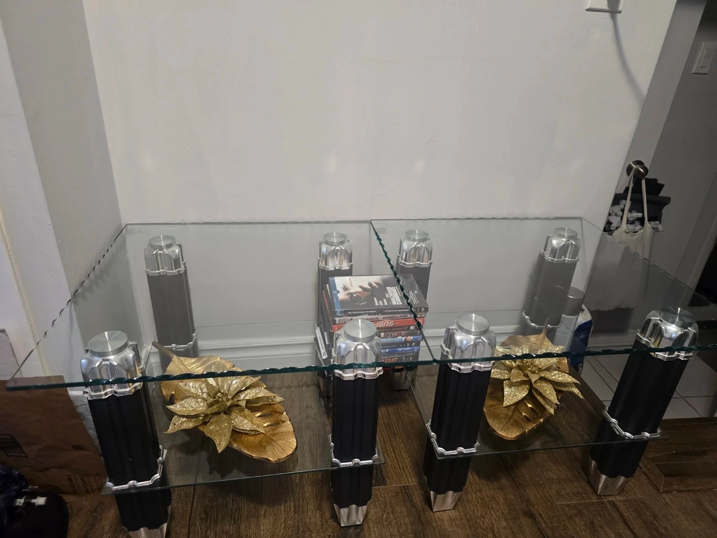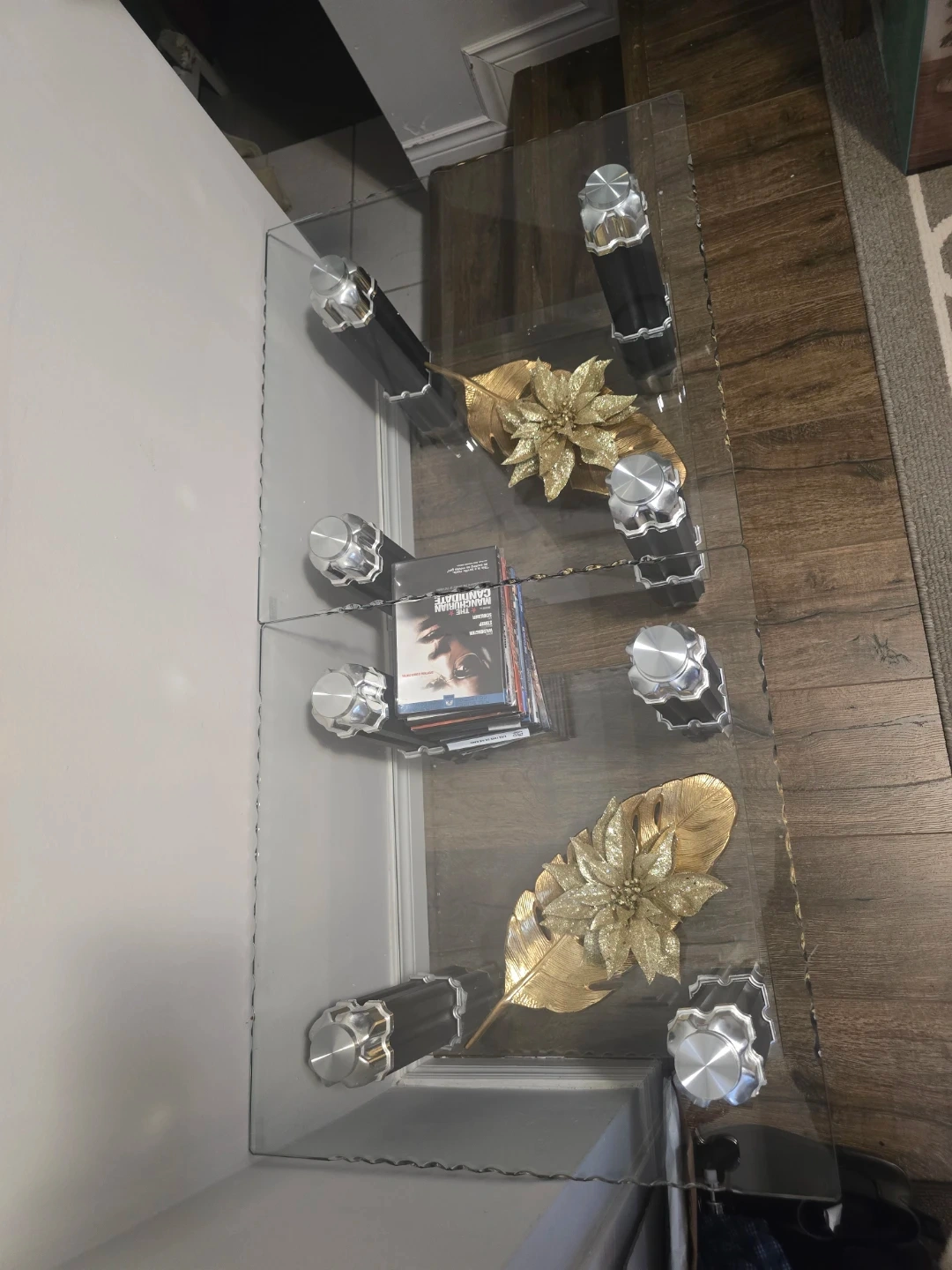 10MOVING SALE: Selling a glass coffee table in good condition. It's a stylish piece that would look great in any living room or den. If you are interested, send me a message! * Gold Leaves and dvds not included* PICK UP ONLY