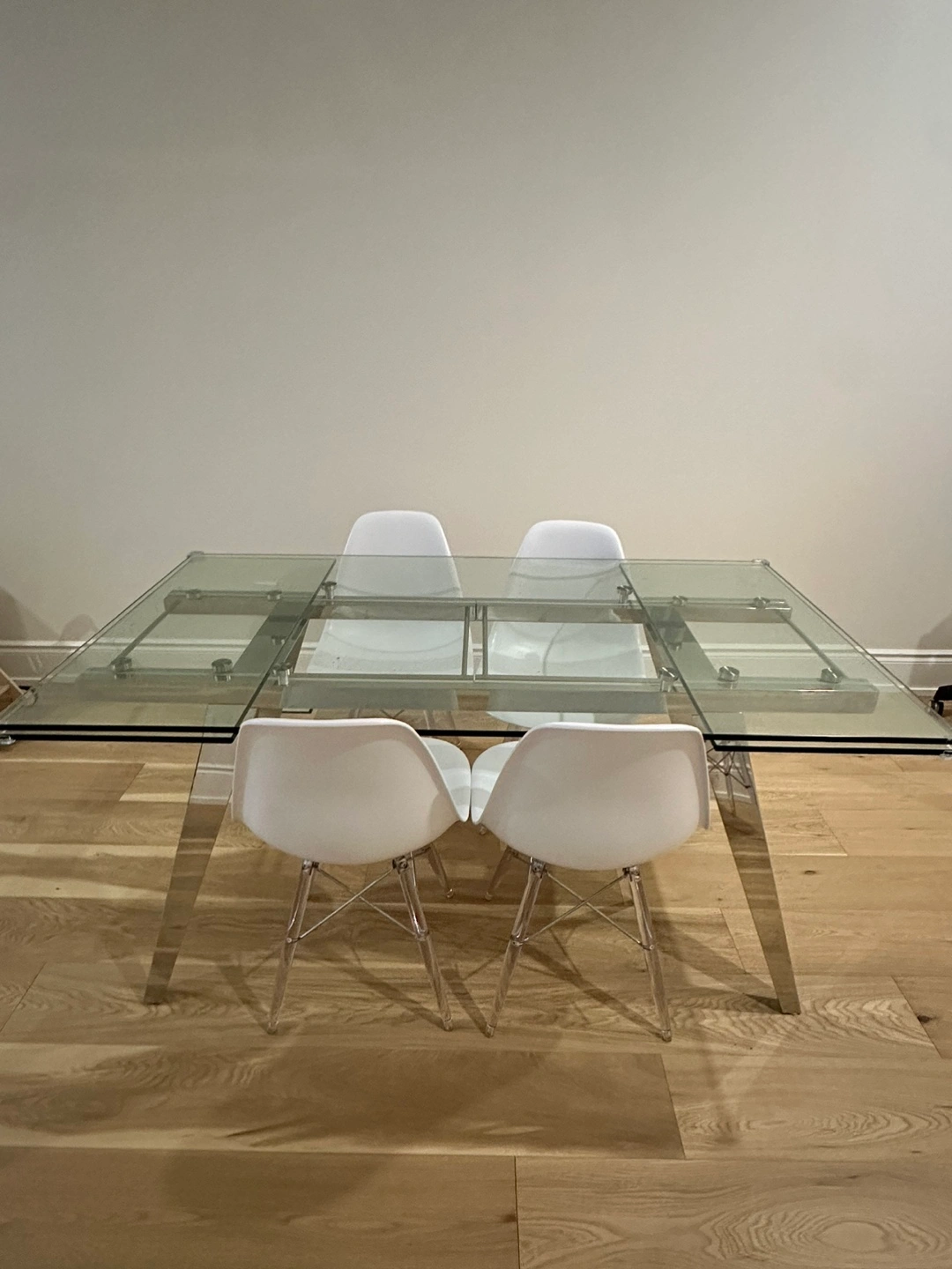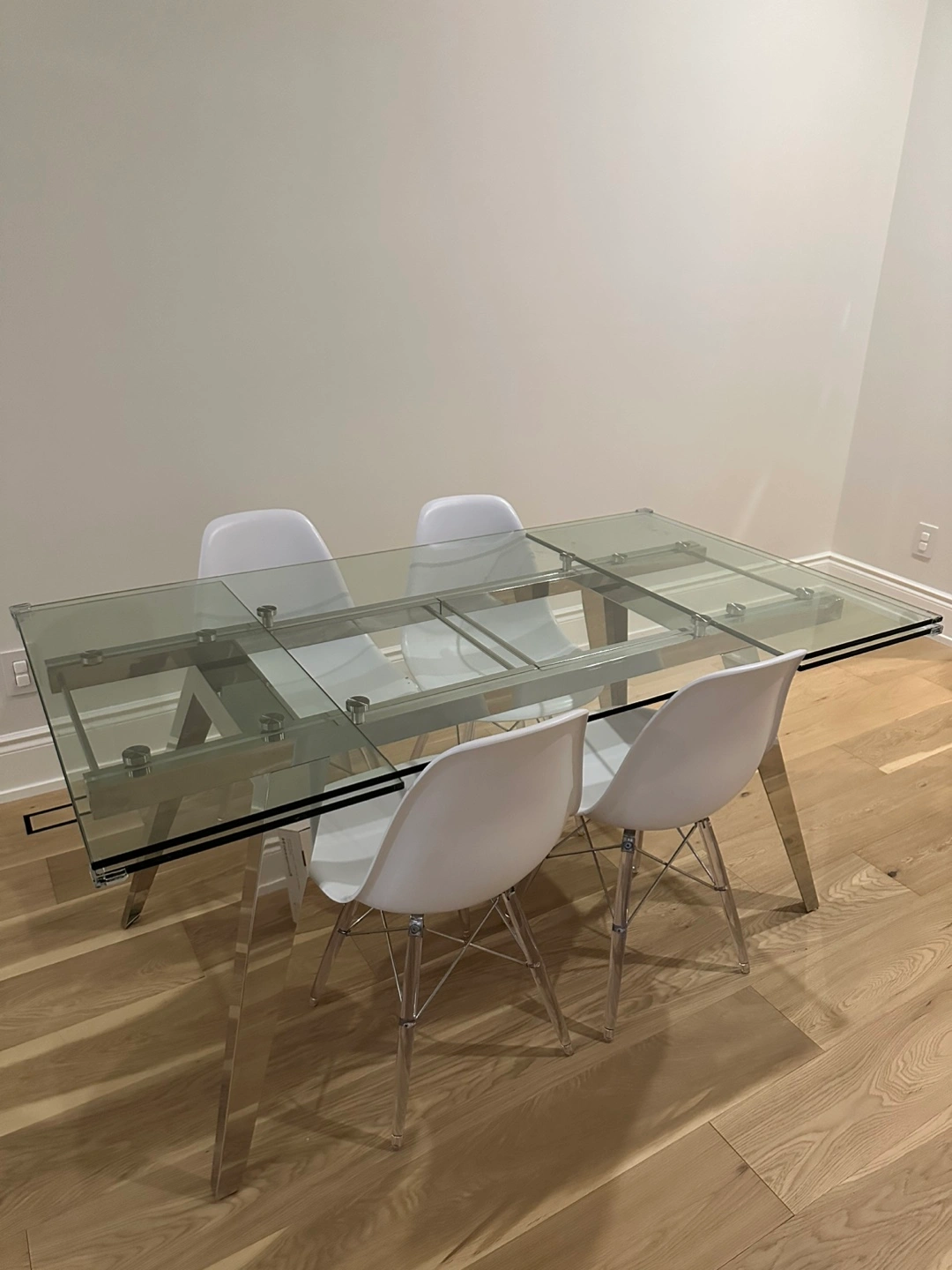 A gorgeous modern glass dining table. Table comfortably seats 6. Previously used with lots of love and care, remains in excellent condition. The table has a chrome mirror-like base. Listing price includes the 4 white chairs with acrylic bases. The 4 chairs can also be purchased separately if interested. The table also extends on either side to a full width of 94.5” to comfortably seat 8-10.