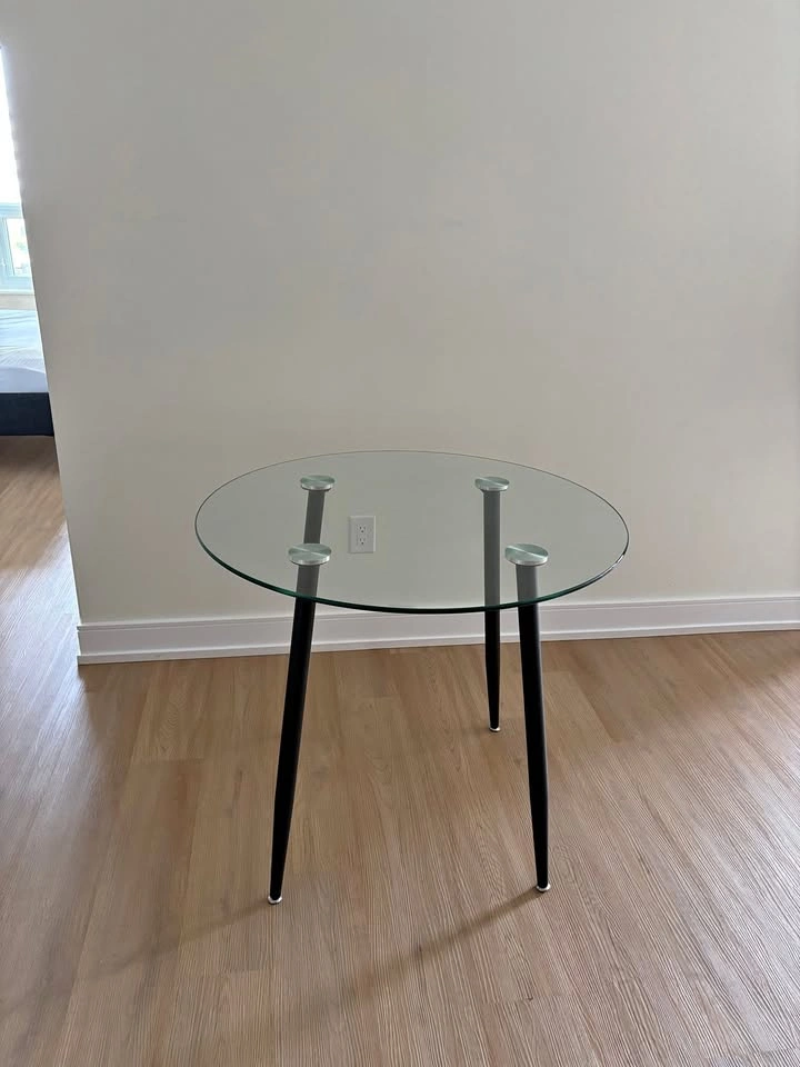 5FINAL PRICE, brand new, never used, used for only staging Dimensions: https://www.wayfair.ca/furniture/pdp/george-oliver-wrought-studio-5-pcs-dining-set-round-tempered-glass-table-4-fabric-chairs-solid-wood-kitchen-c110394457.html