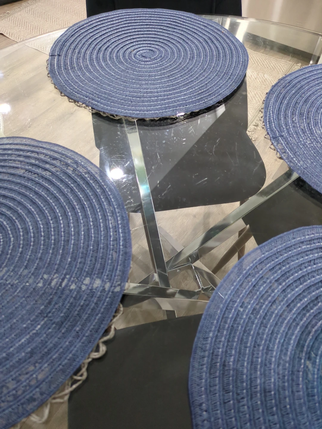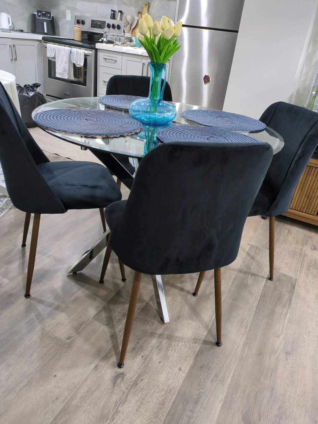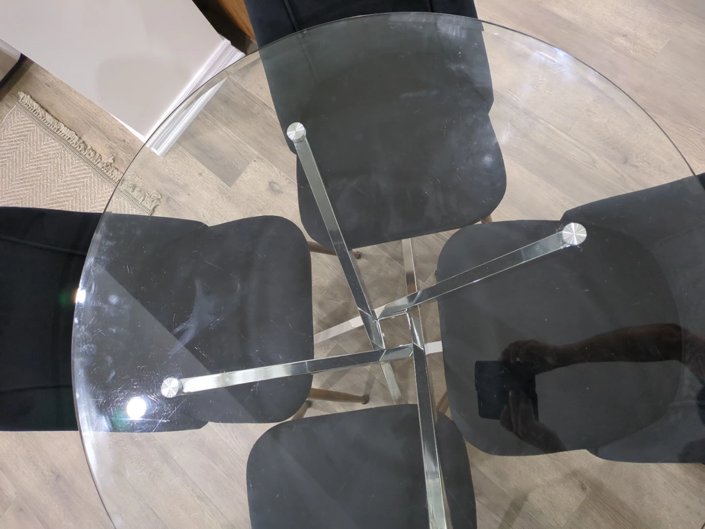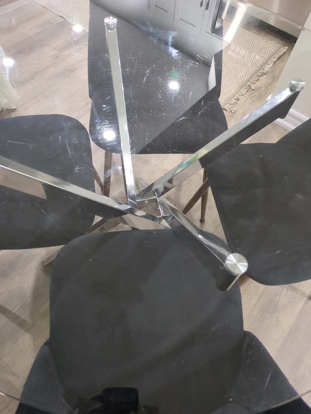 71Selling a stylish glass dining table paired with four elegant black velvet chairs. The table features a modern design with a clear glass top and a unique chrome base. The chairs are upholstered in soft black velvet, adding a touch of luxury to your dining space. Perfect for a contemporary home!