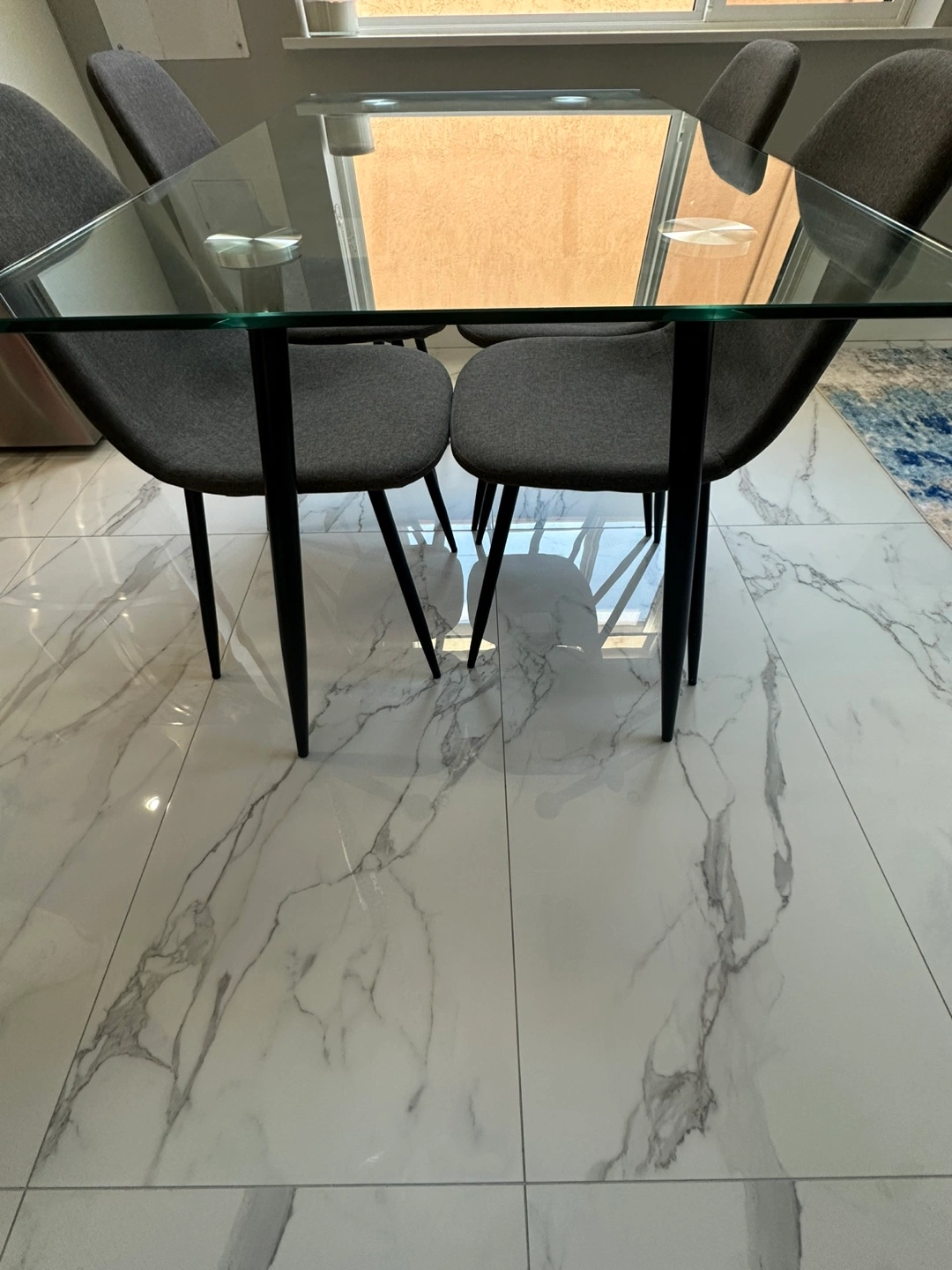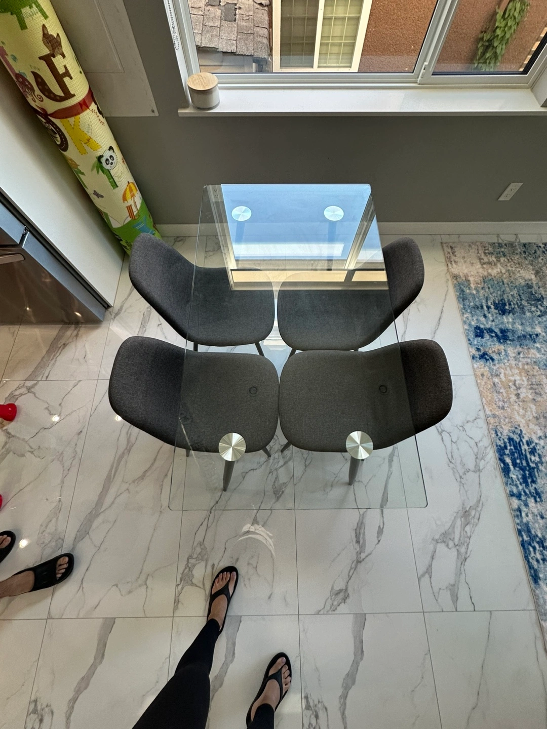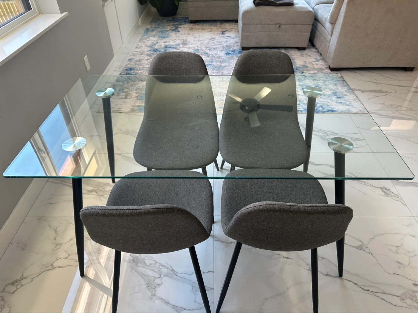 20Selling a modern glass dining table that comes with four stylish grey chairs. The table features a sleek glass top and black legs, perfect for a contemporary dining space. The chairs are upholstered in a comfortable grey fabric and have matching black legs. This set is in great condition and ready to be enjoyed in your home