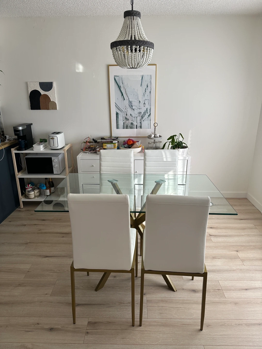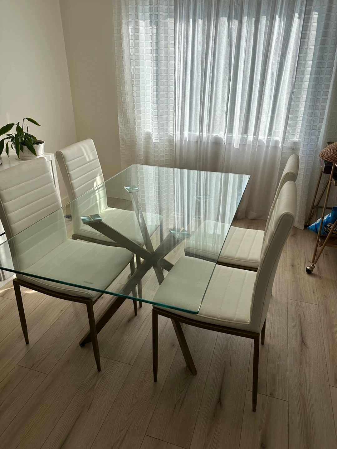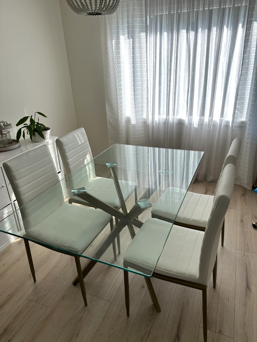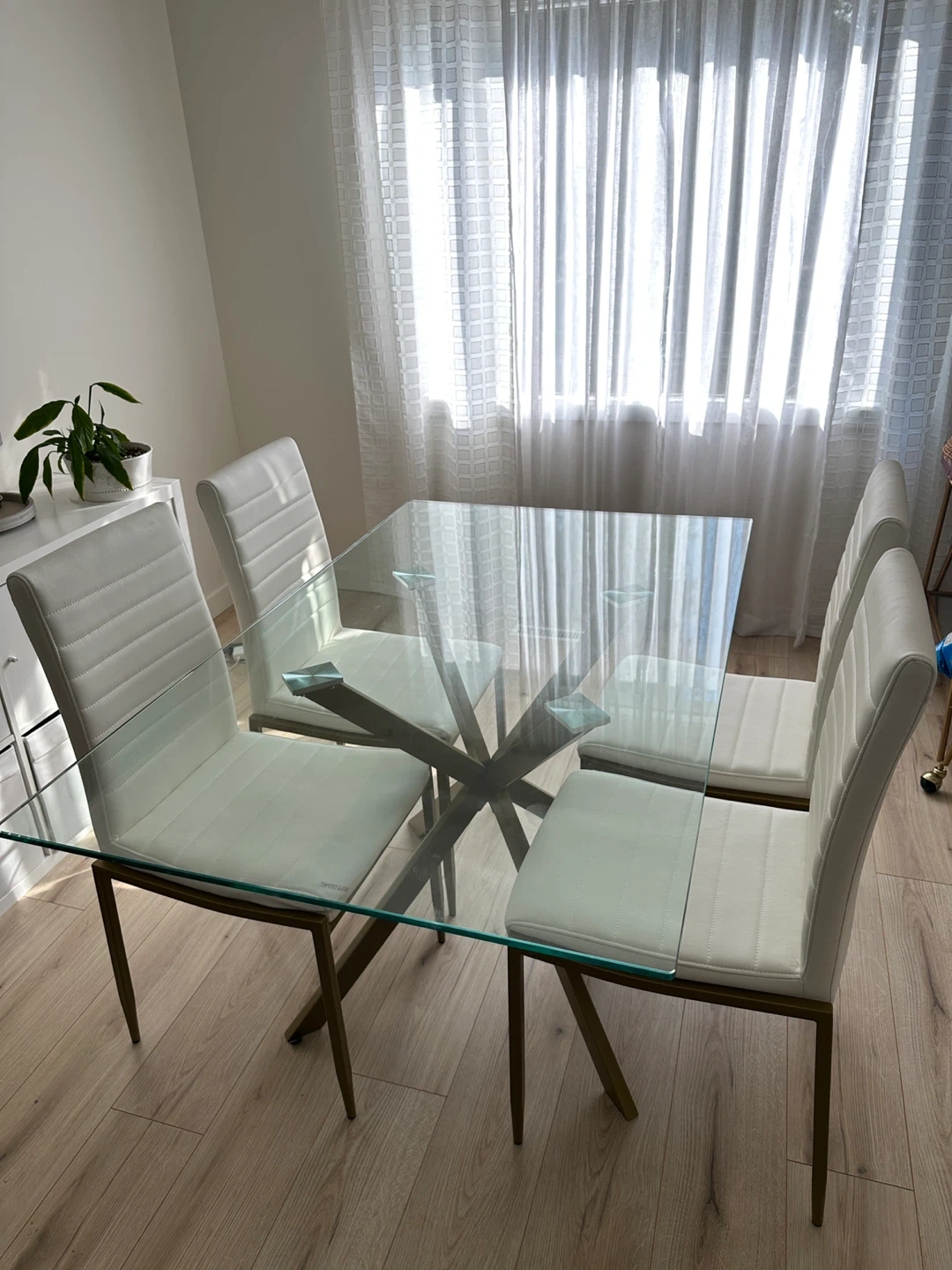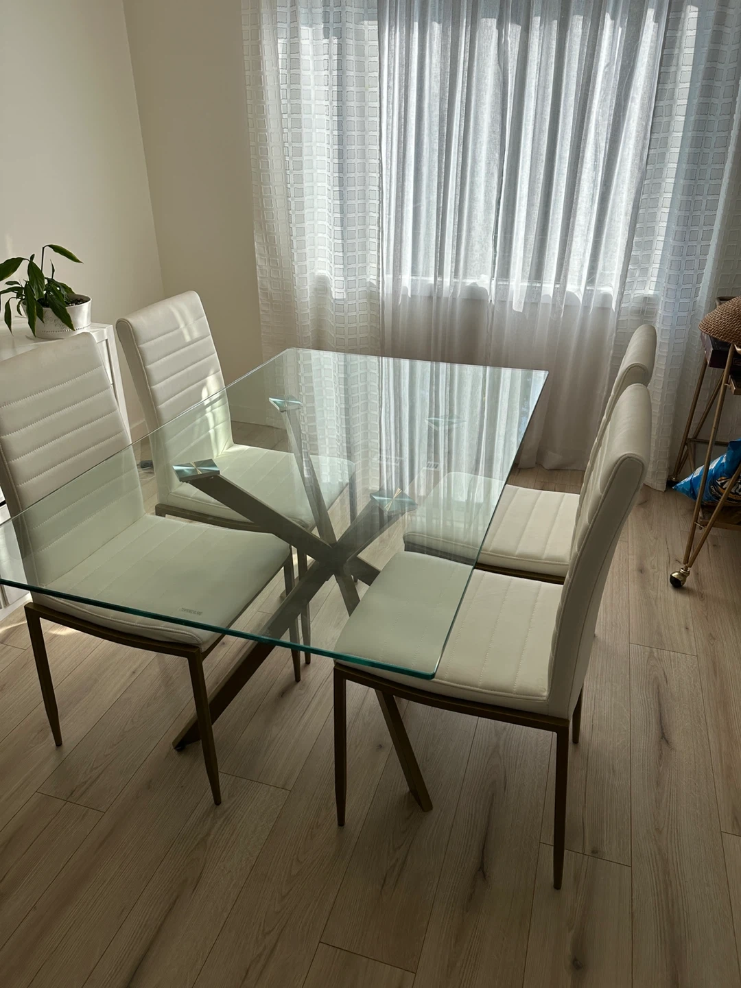 Selling a glass dining table with four matching chairs. The chairs are white with a unique stitched design on the back. The table features a clear glass top and a stylish, star-shaped base. It's a great set for a modern dining space! 2 sets of seat cover included