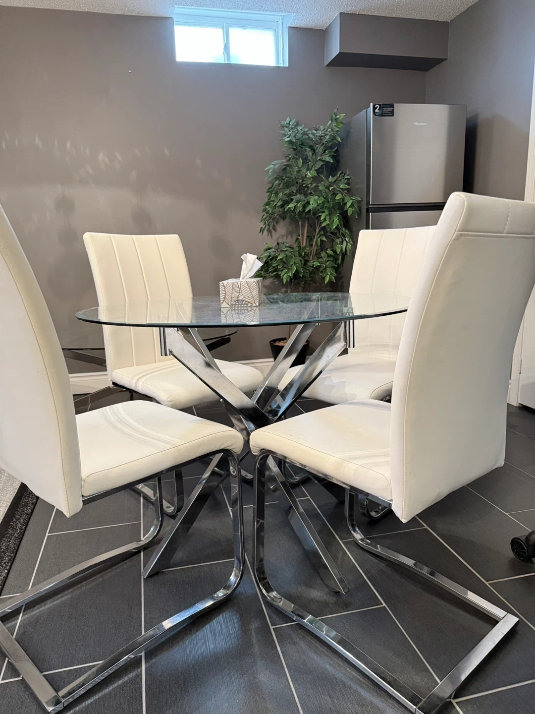 60Selling a stylish glass dining table that comes with four comfortable white chairs. The table features a sleek, modern design with a glass top and a unique, sturdy base. The chairs are upholstered in white, complementing the table perfectly. It's a great set for any dining room!