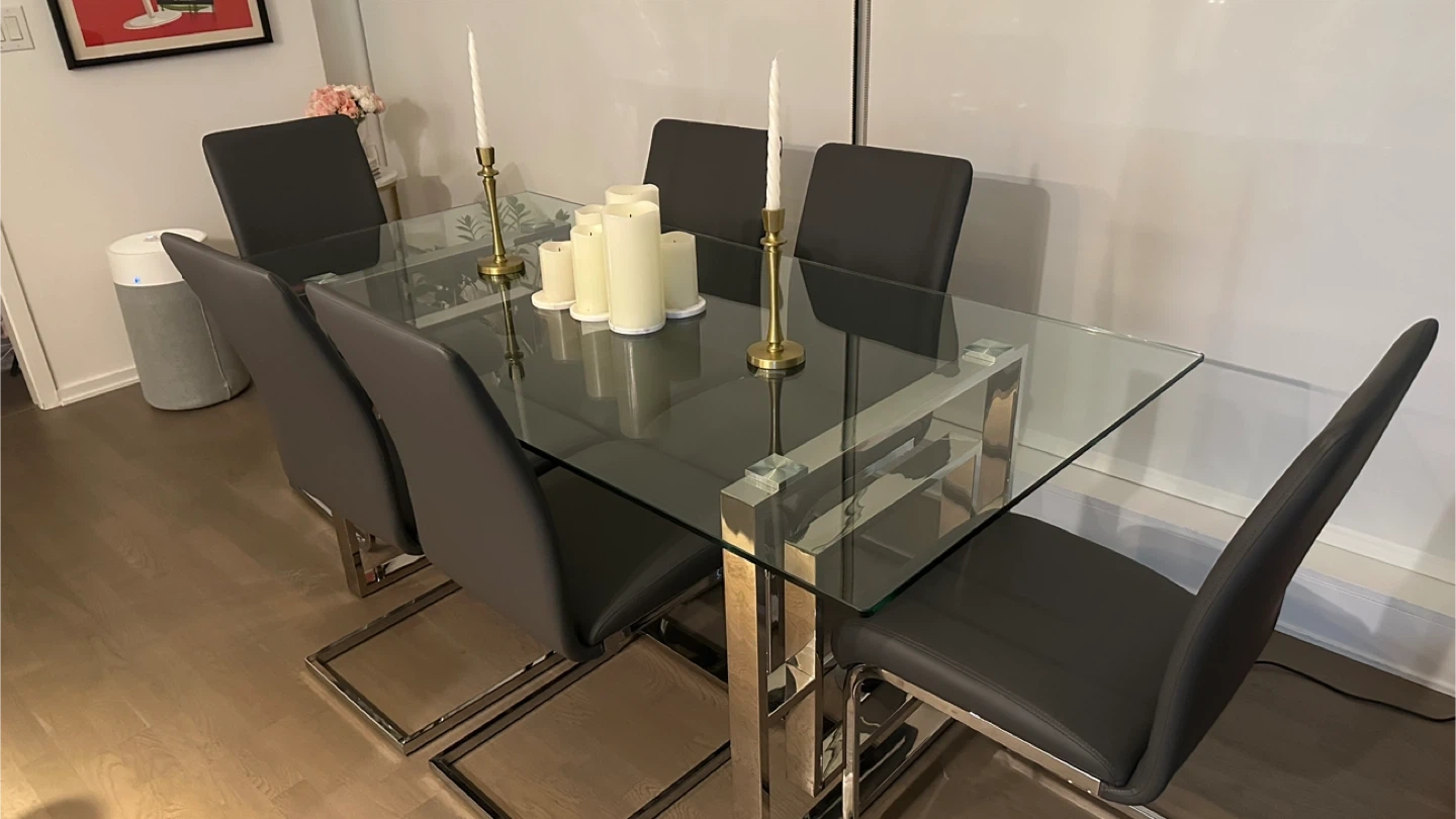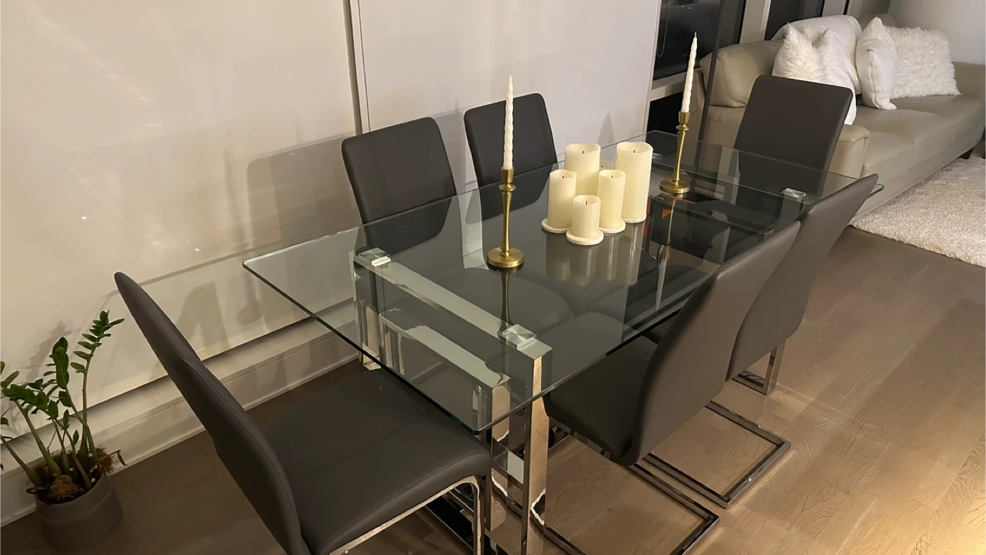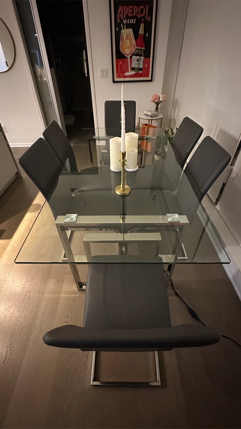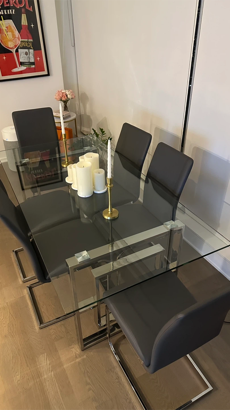 10Selling a modern glass dining table that comes with six chairs. The chairs are upholstered in a sleek, dark grey material and have a stylish, minimalist design with chrome legs. The table itself features a clear glass top and a chrome base, which complements the chairs nicely. It's a great set for any dining room!