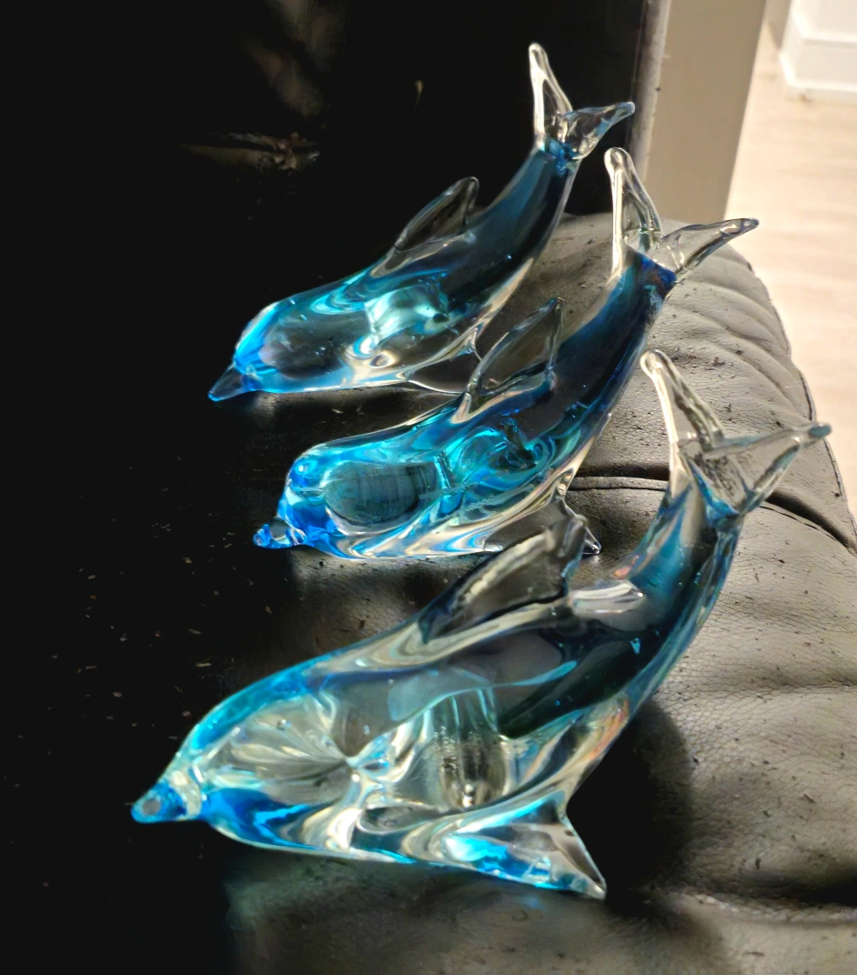 These are gently used glass dolphins with beautiful blue swirls inside the clear glass. Perfect for any collector or ocean lover, these figurines catch the light and add a touch of elegance to any room. There are three in the set. * Hand-blown glass * Blue swirl design * Figurine Set These dolphins are looking for a new home, and if this ad is up, they're still available for adoption!