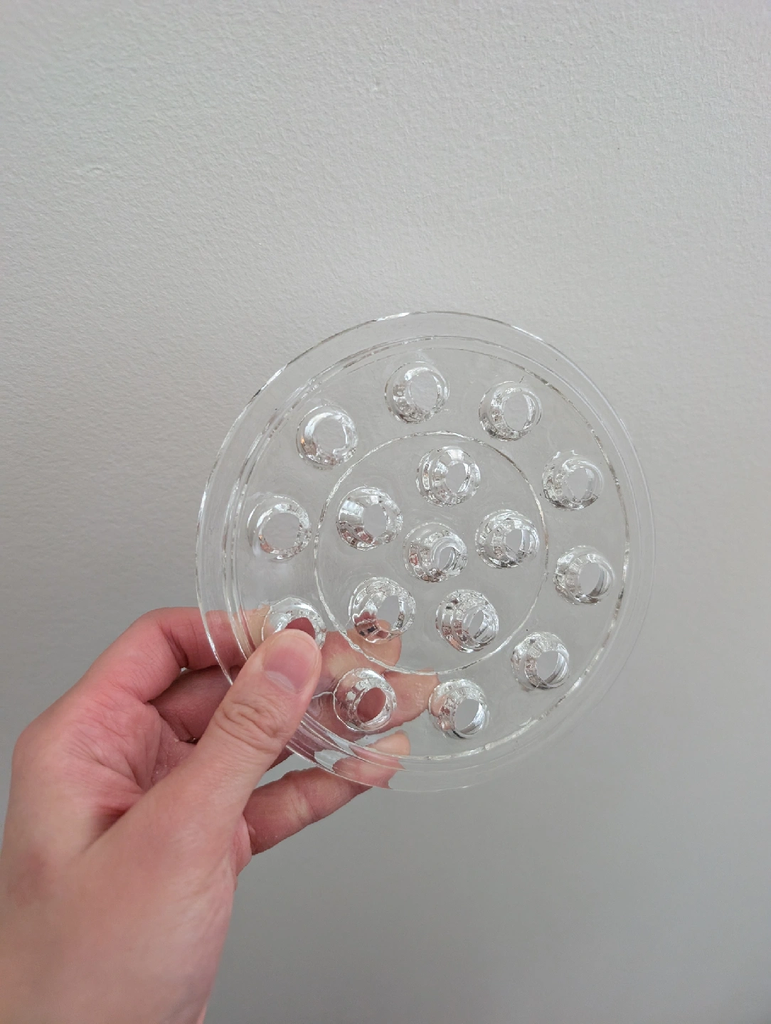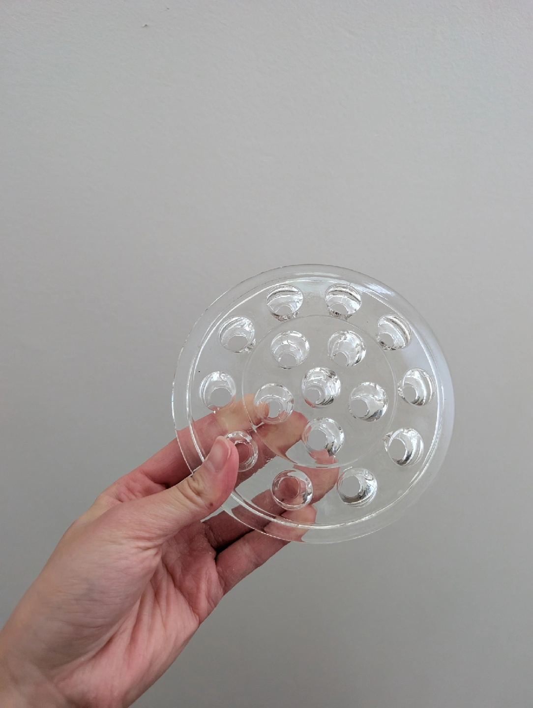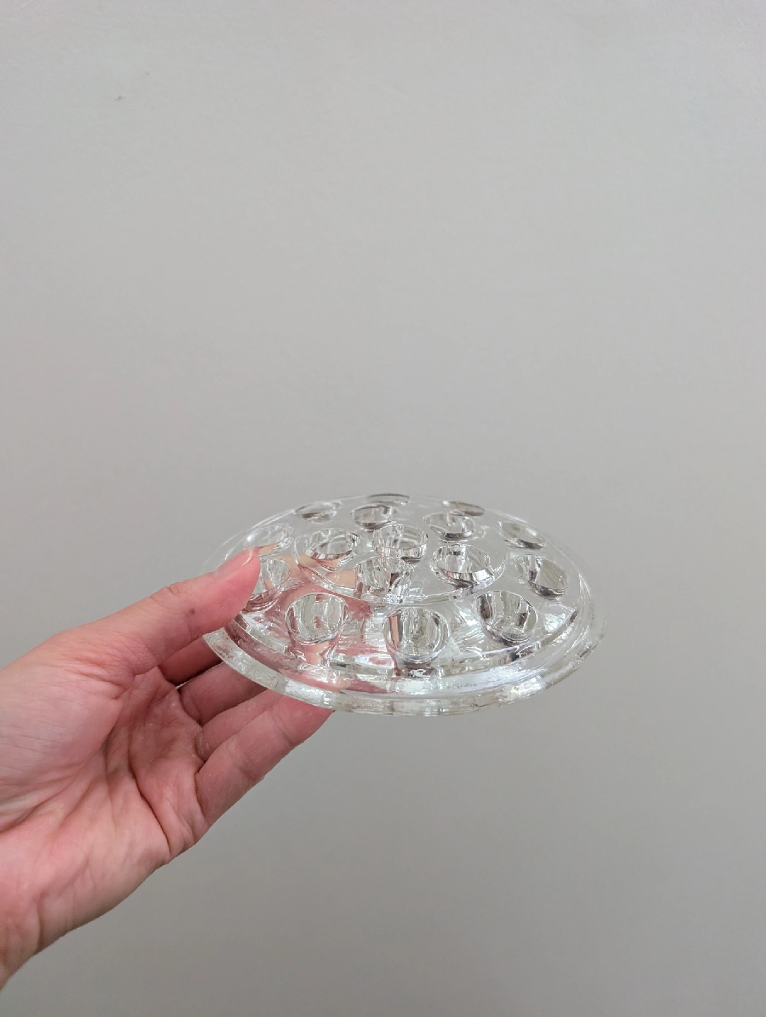 Glass flower frog with 16 slots In excellent condition, no chips Measures approx 5" dia, 0.75" height Pickup in Thornhill near Yonge and 407