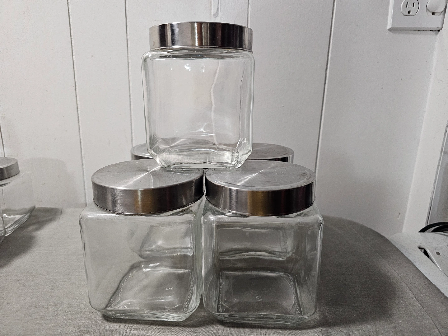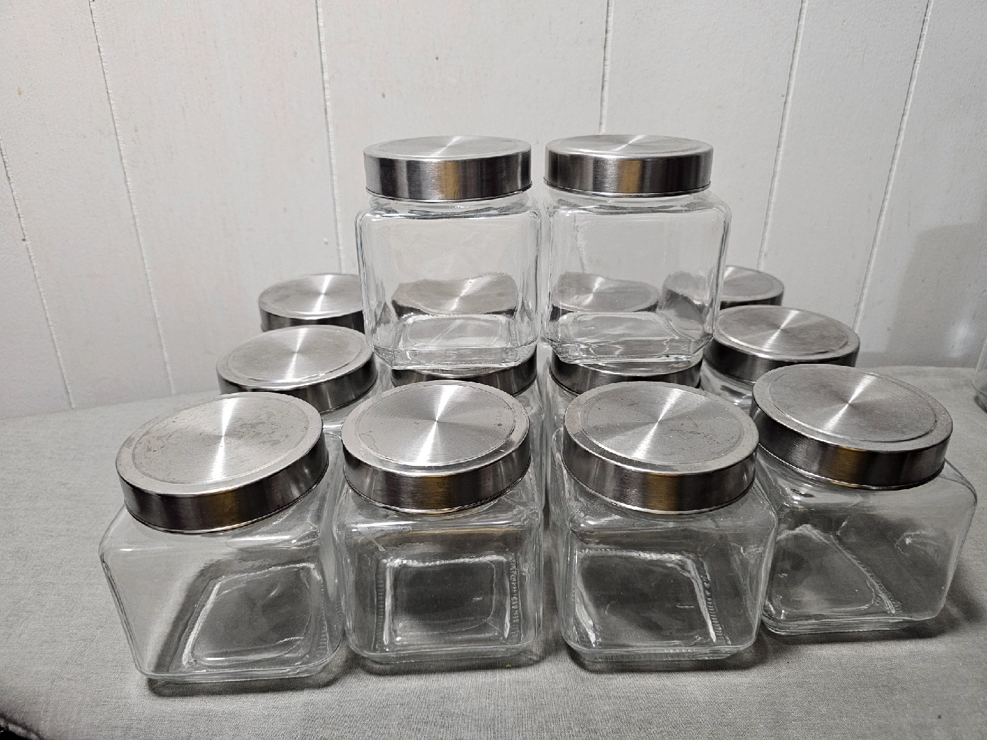 Selling a set of 21 glass jars with stainless steel lids.Come in various sizes i.e 14 small, 5 medium, 1 tall and medium tall Glass Jars and are perfect for storing spices, pantry items, or craft supplies! They're in great shape and ready for a new home