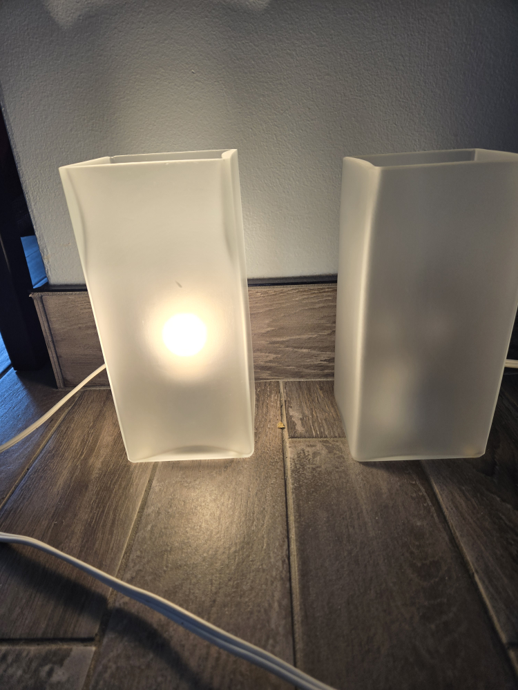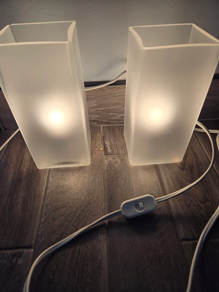 10Glass Night stand lights mint condition sold as a pair only 15$ for both, easy toggle On/ Off switch no delivery. 25 to 40 W bulb required comes with 1 bulb each light.