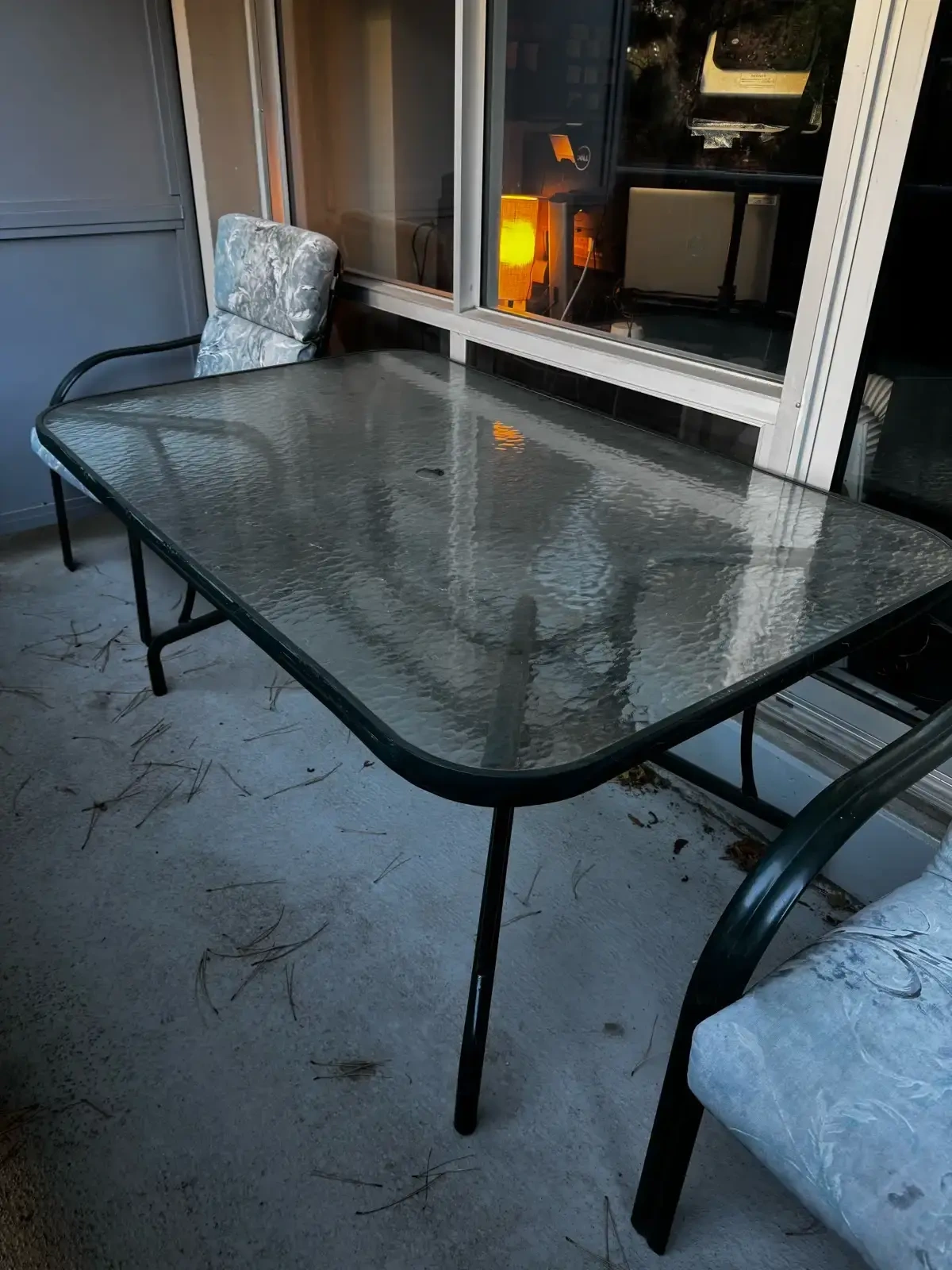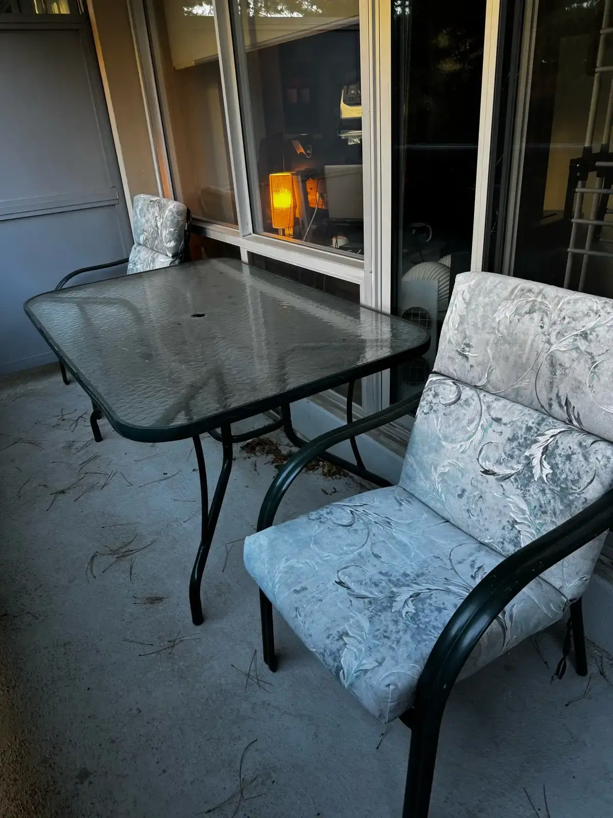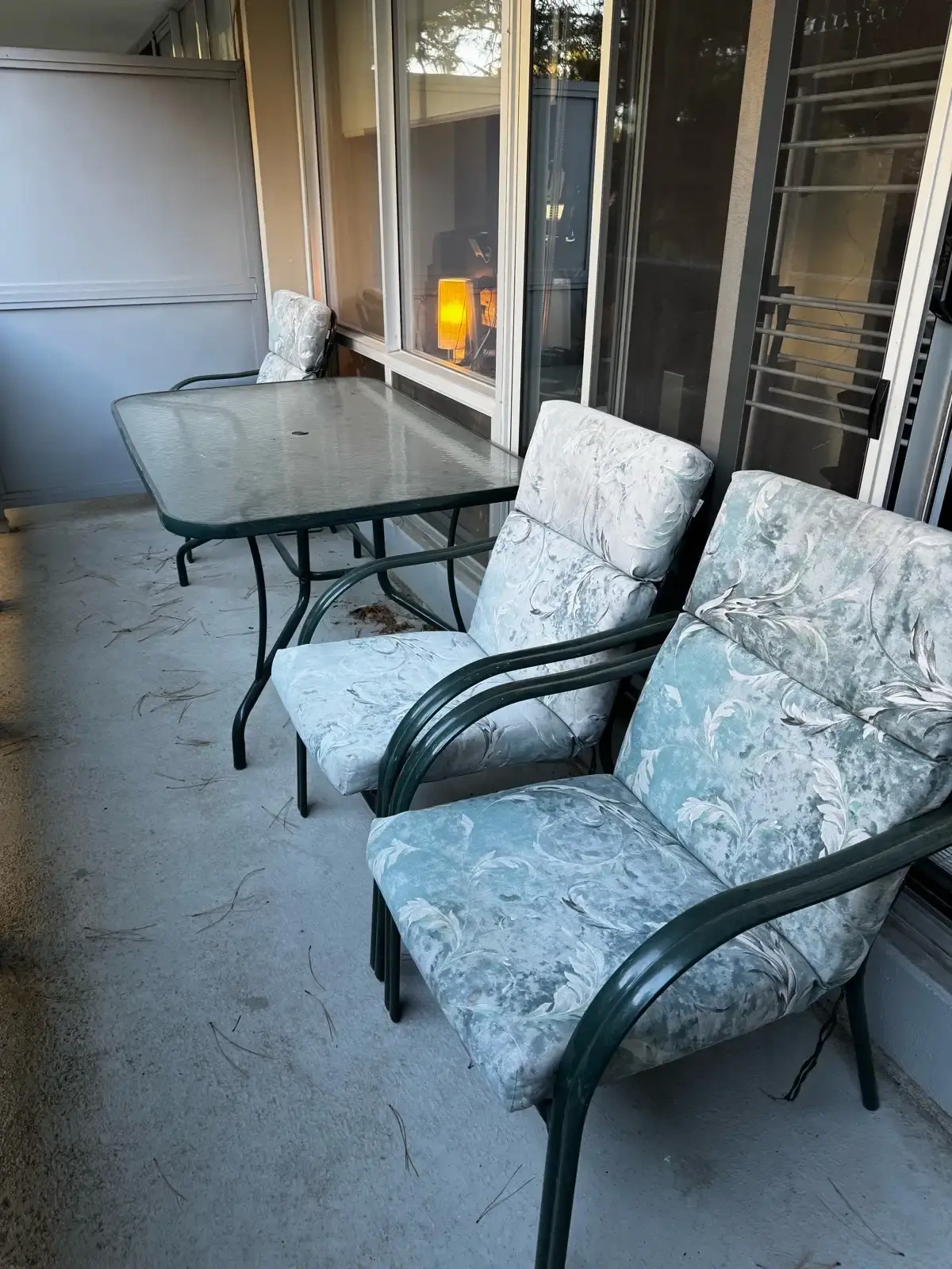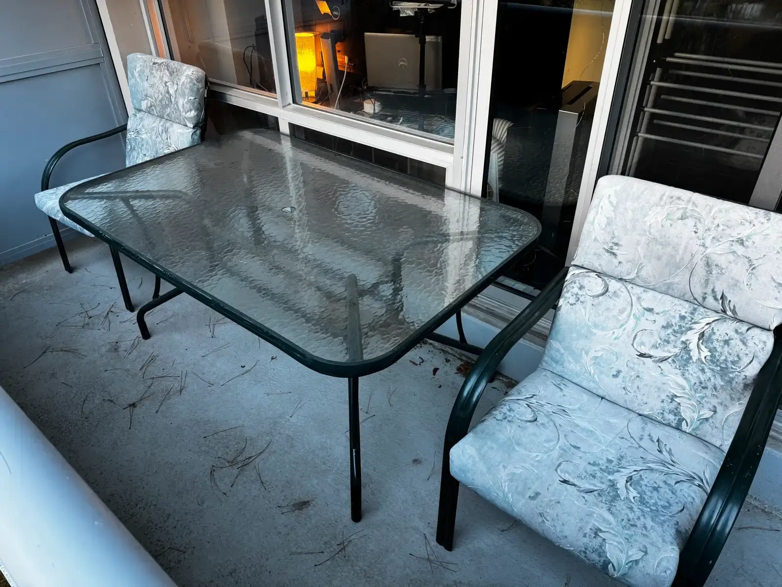 15Set of outdoor patio furniture including a sturdy glass-top table and 3 comfortable cushioned chairs. Perfect for balcony, deck, or backyard use. • Table: glass top with metal frame (hole for umbrella) • Chairs: metal frame with soft, patterned cushions in light grey/blue tones • All pieces are in good condition – no damage, just normal outdoor wear Ideal for morning coffee, evening drinks, or outdoor dining. Pickup: High Park, 66 Oakmount Road If this ad is up, it is still available. Please message me to arrange a pickup time. Moving Sale: I'm moving to a different city, so I'm selling a lot of other furniture and home appliances. Please check my other listings for more items!