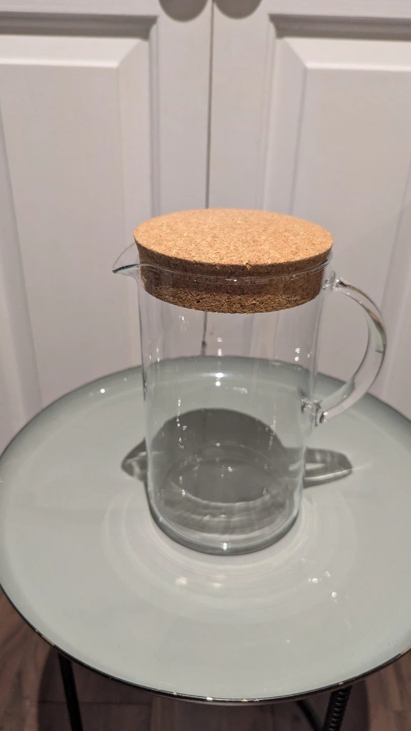 65Selling a clear glass pitcher with a unique cork lid. It’s in great condition and perfect for serving drinks. The pitcher is approximately 10 inches tall and 4.5 inches in diameter. Holds about 1.5L I think. Bundle with any of my other listings for a discounted price.