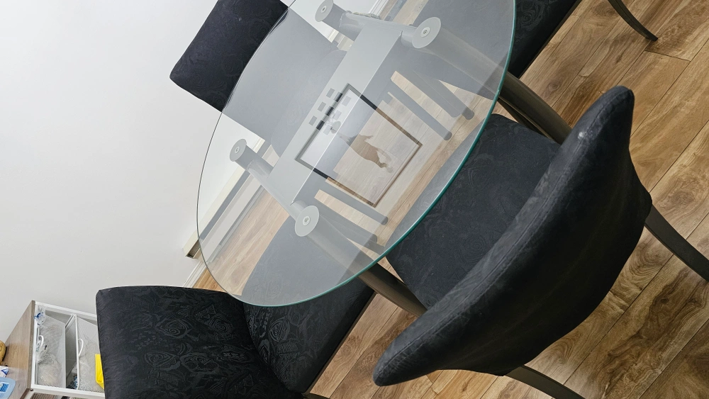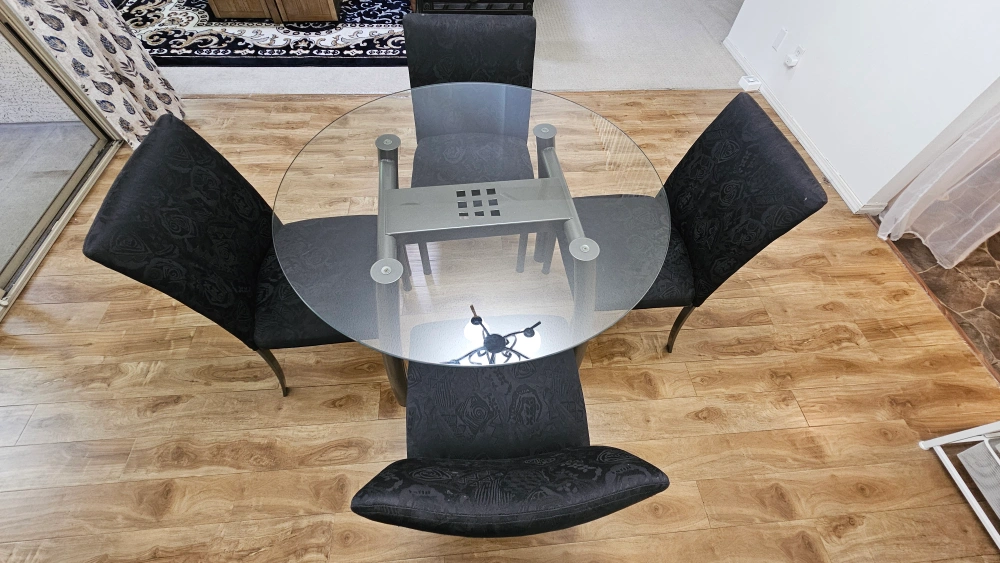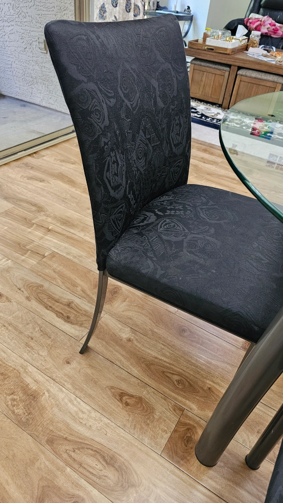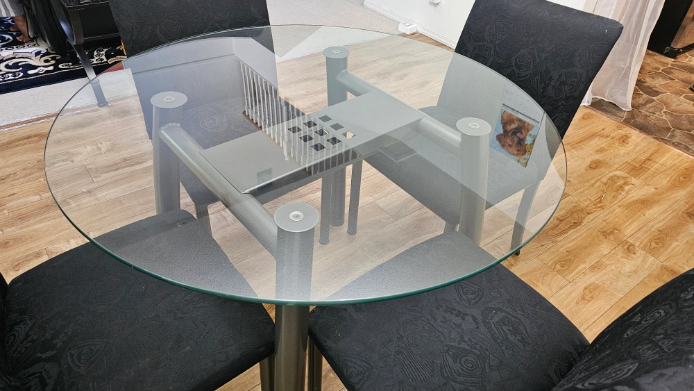 Selling a round glass dining table accompanied by four black chairs. The chairs feature a nice pattern design. This set would be perfect for a smaller dining or kitchen area. Like new condition, selling to get bigger replacement.