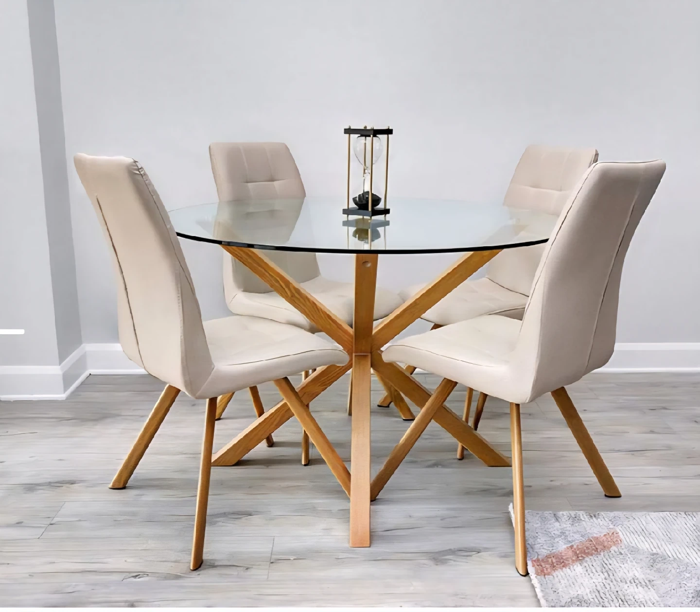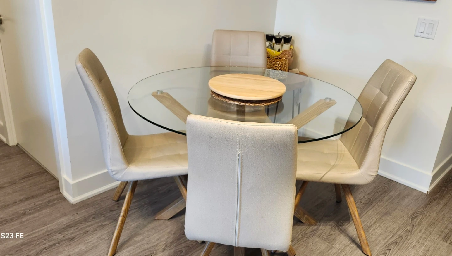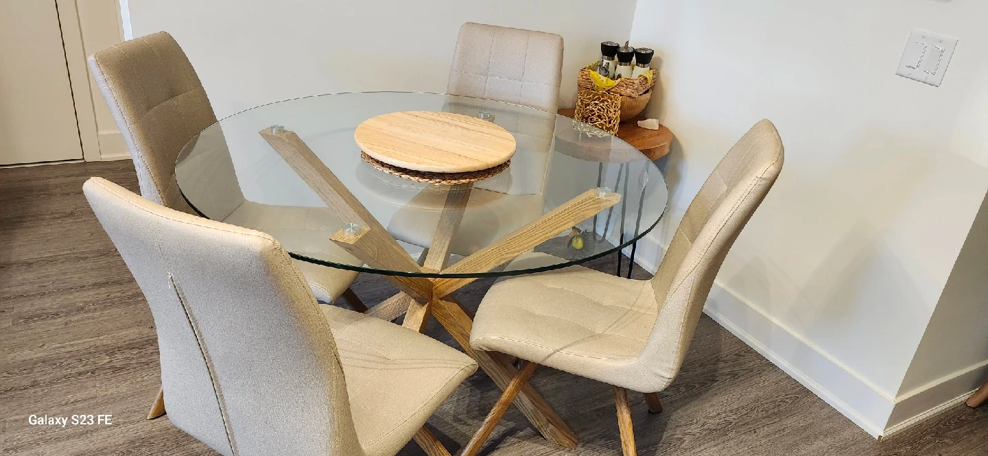 15Selling a lovely round glass dining table that comes with four matching chairs! The table has a clear glass top and a unique wooden base. The chairs are upholstered in a neutral, light beige fabric that would fit in with any decor. Perfect for a smaller dining space or kitchen nook