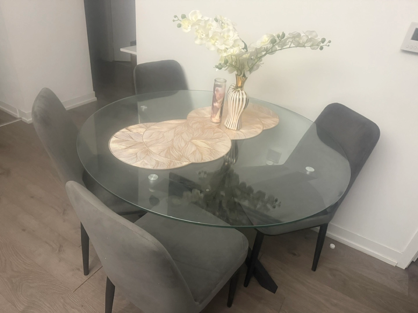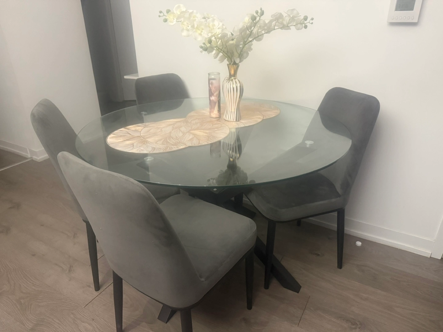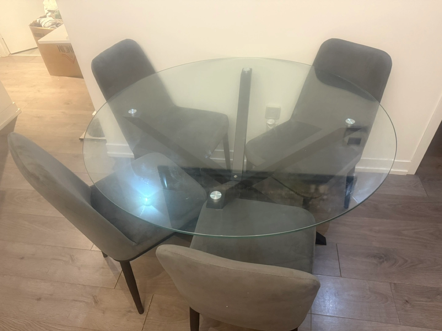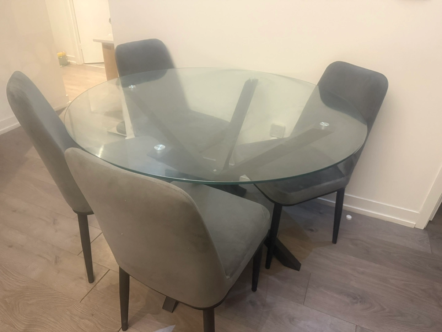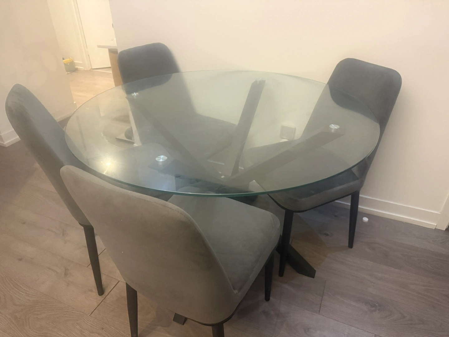 65Selling a round glass dining table with four grey chairs. The set is in great condition and would be perfect for a small dining area or kitchen. The chairs are a comfortable velvet material.