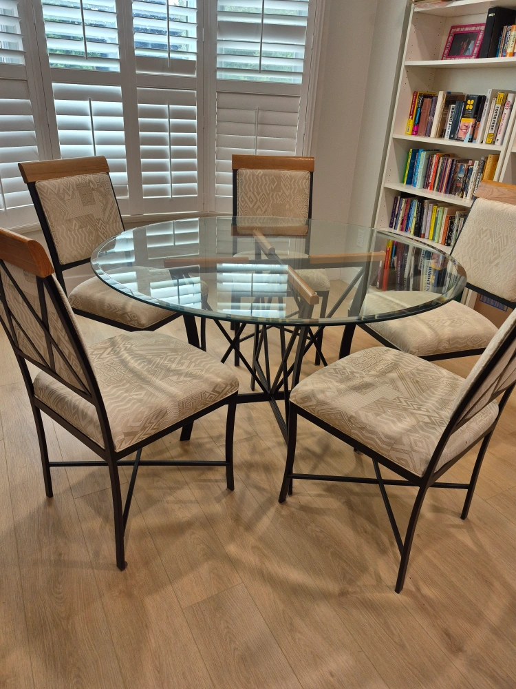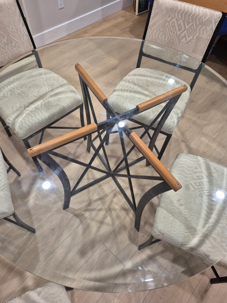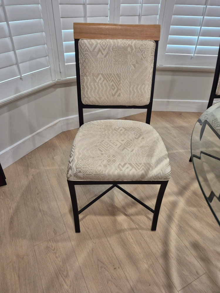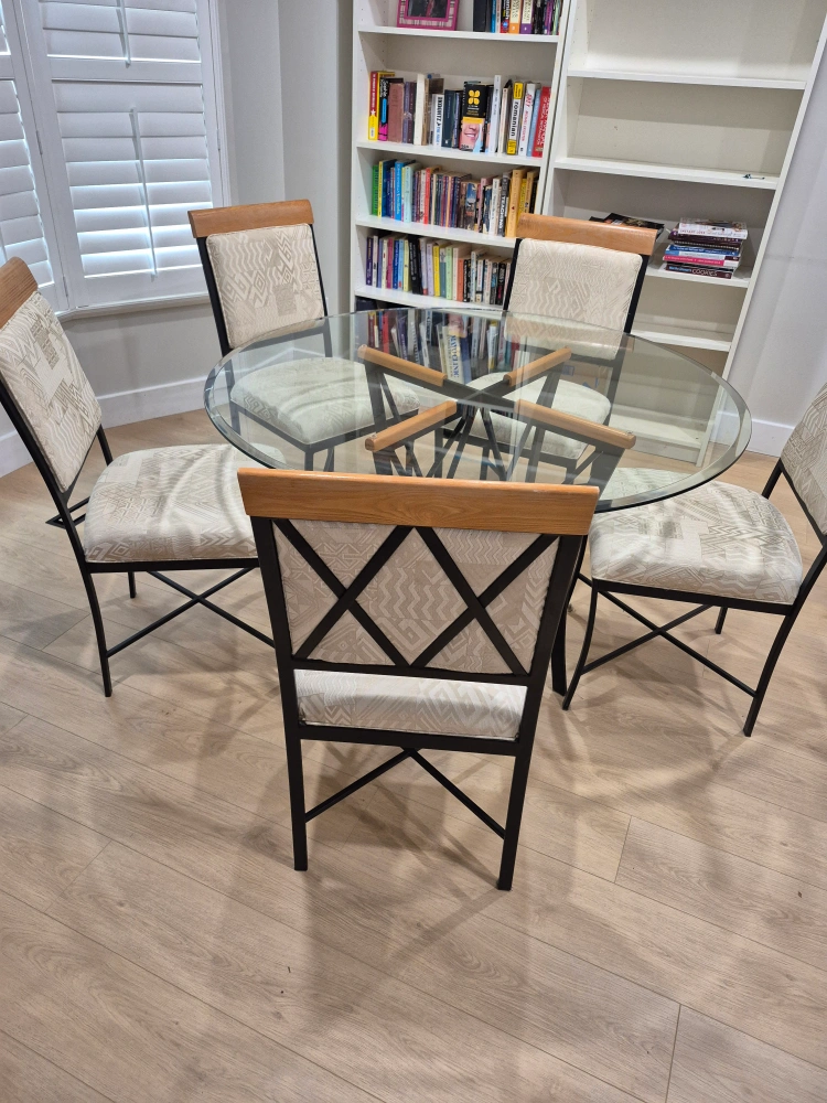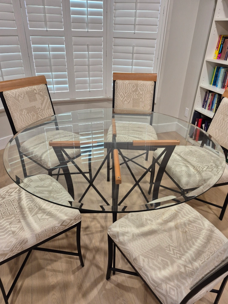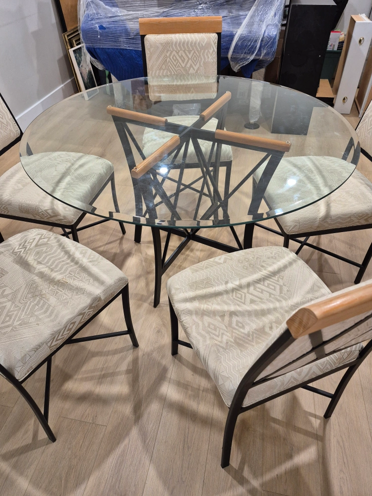 Selling a round glass dining table that comfortably seats six people. The chairs have a unique patterned fabric and sturdy black metal frames. The table features a modern design with a glass top and a geometric base. Perfect for a kitchen or dining room!