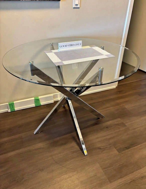 38Selling a stylish round glass dining table. It features a modern chrome base that adds a touch of elegance to any dining space. It's in great condition and ready to be the centerpiece of your dining area!