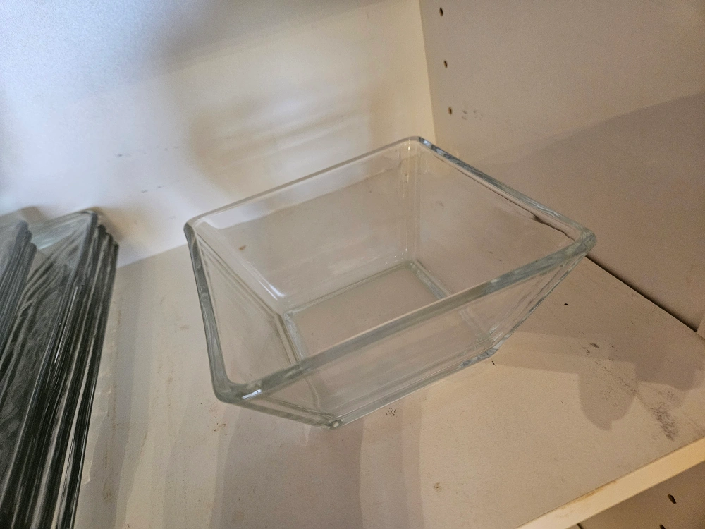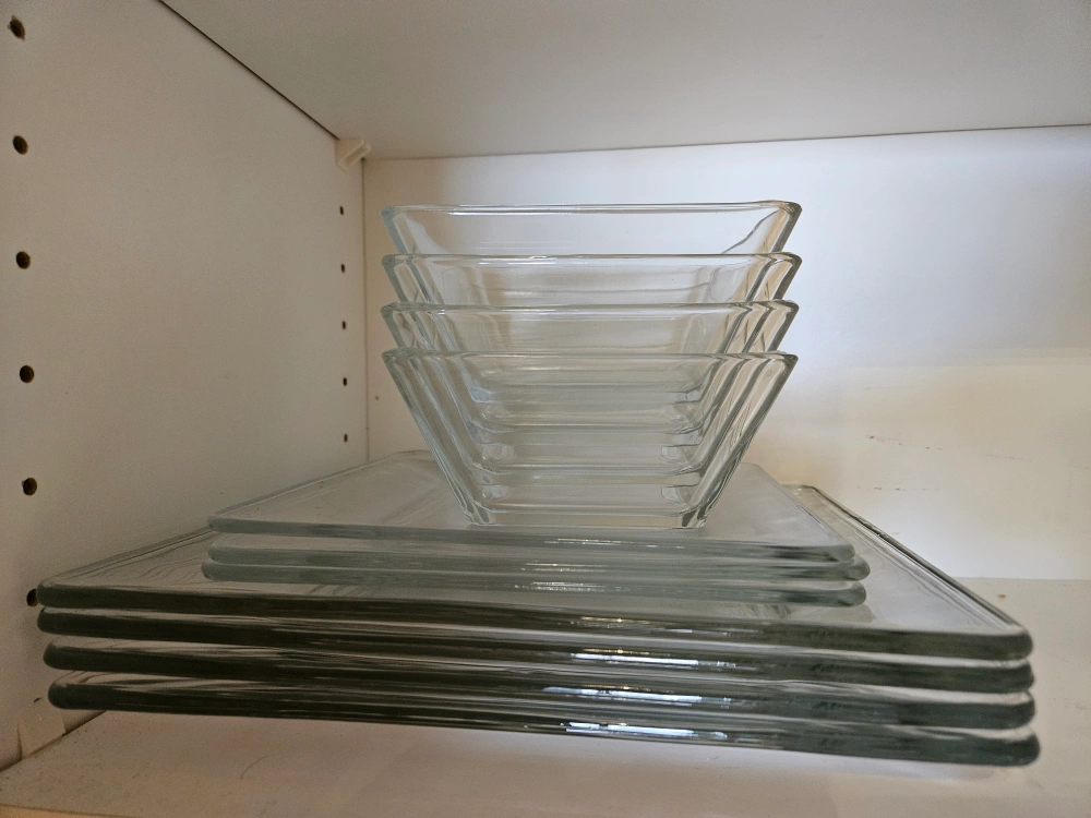 Selling a set of clear glass square plates and bowls. They are in great condition and perfect for everyday use or special occasions. Would love for them to go to a good home!