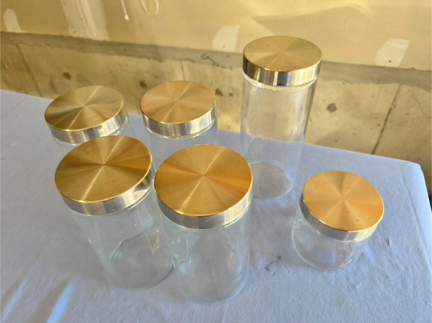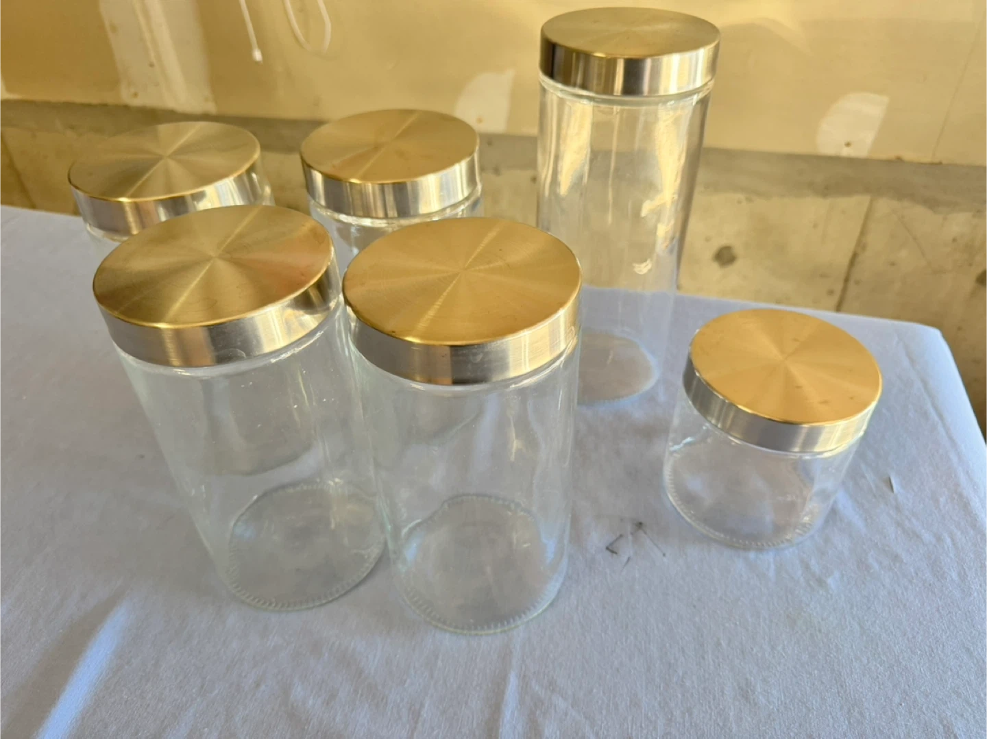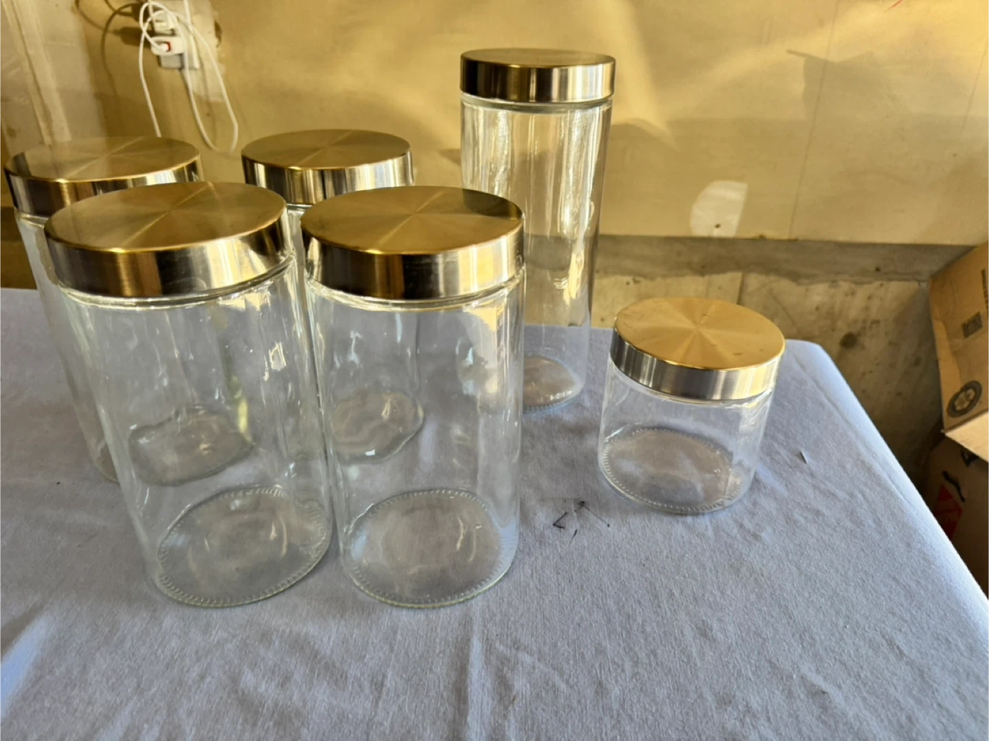 Selling a set of glass storage jars with shiny silver-colored lids. They come in various sizes, perfect for organizing your kitchen or pantry. These jars are great for storing everything from spices to snacks!