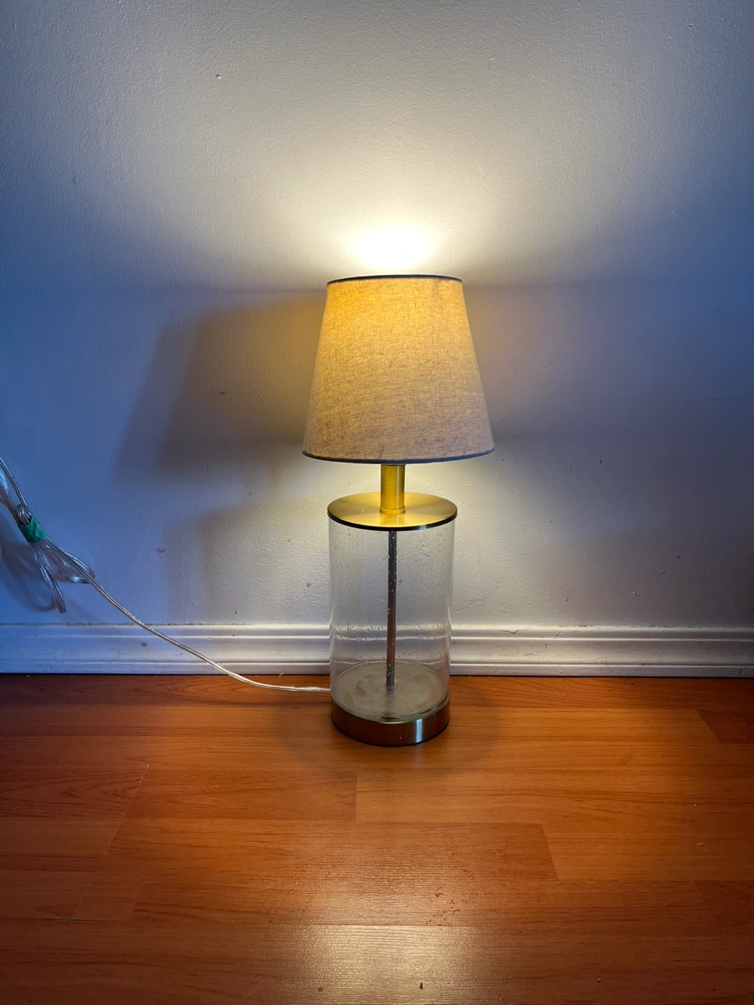 10Selling a stylish glass table lamp featuring a linen shade and gold accents. It adds a touch of elegance to any room! The lamp has a clear glass body with a gold base and top, complemented by a neutral-toned linen shade. There's also a convenient USB port on the base for charging your devices.