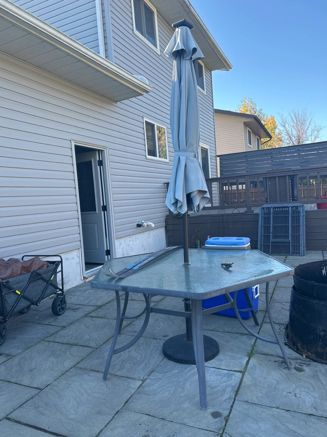 111Offering glass table with umbrella faded has lights inside and stand it’s cracked but still does it’s job Must be able to transport from Keswick