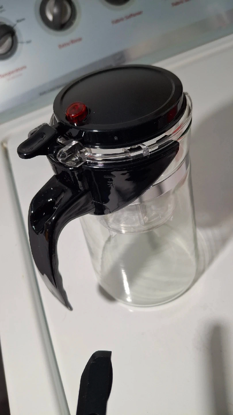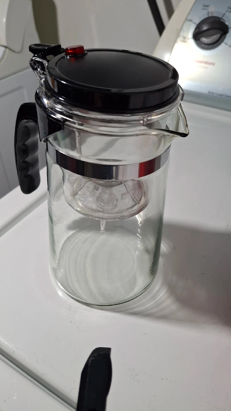 1000+Selling a glass tea infuser pitcher. It has a black lid and handle, and a clear glass body. Perfect for brewing loose leaf tea! pitcher 6" high diameter 3" at mouth diameter 4" bottom