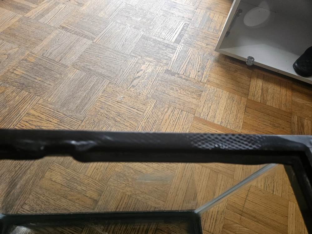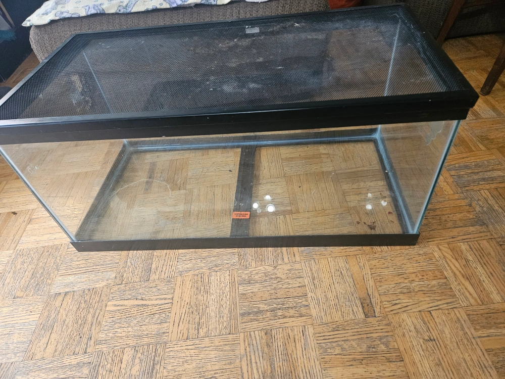 73Selling a used glass terrarium 40 gallon breeder tank. It comes with a mesh top. There are some signs of wear and tear on the black plastic trim.