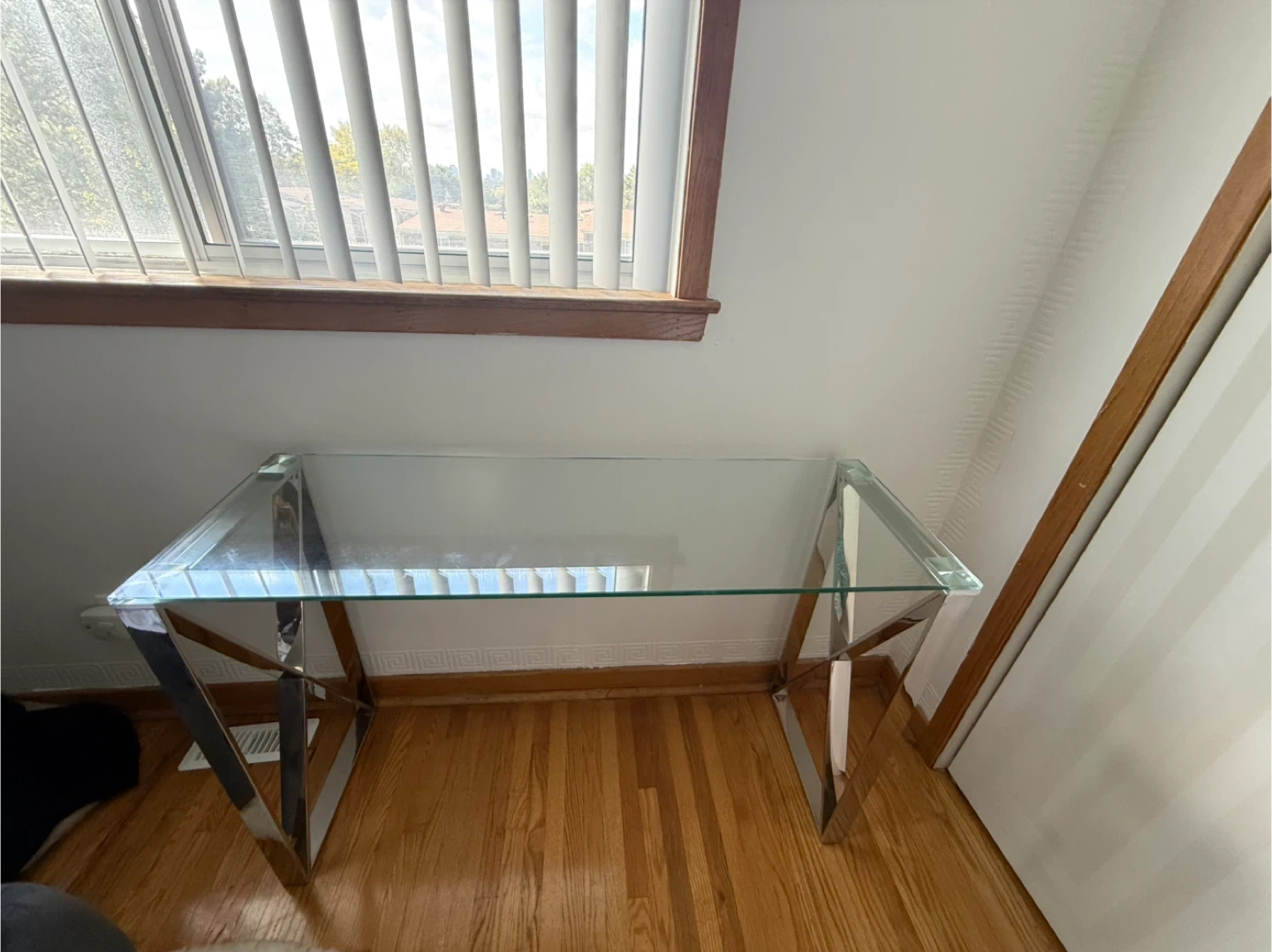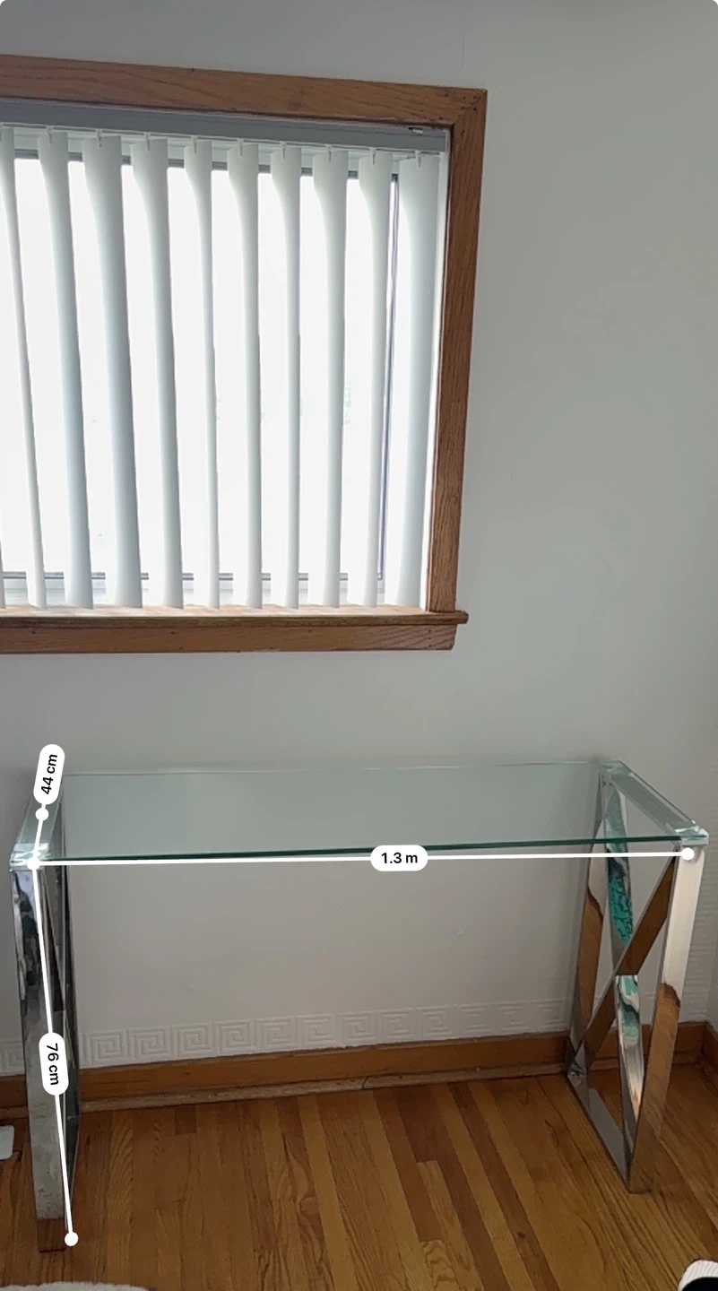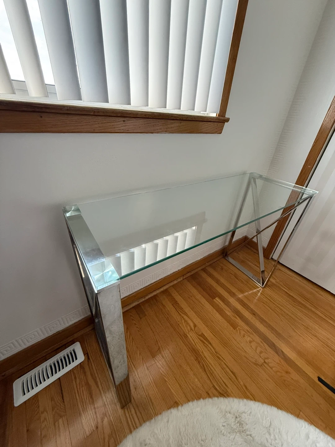 81Selling a console table with a glass top and chrome finish legs. It's 1.3m long, 44cm wide, and 76cm tall. It would be a great addition to any entryway or living room Use as an office desk as well