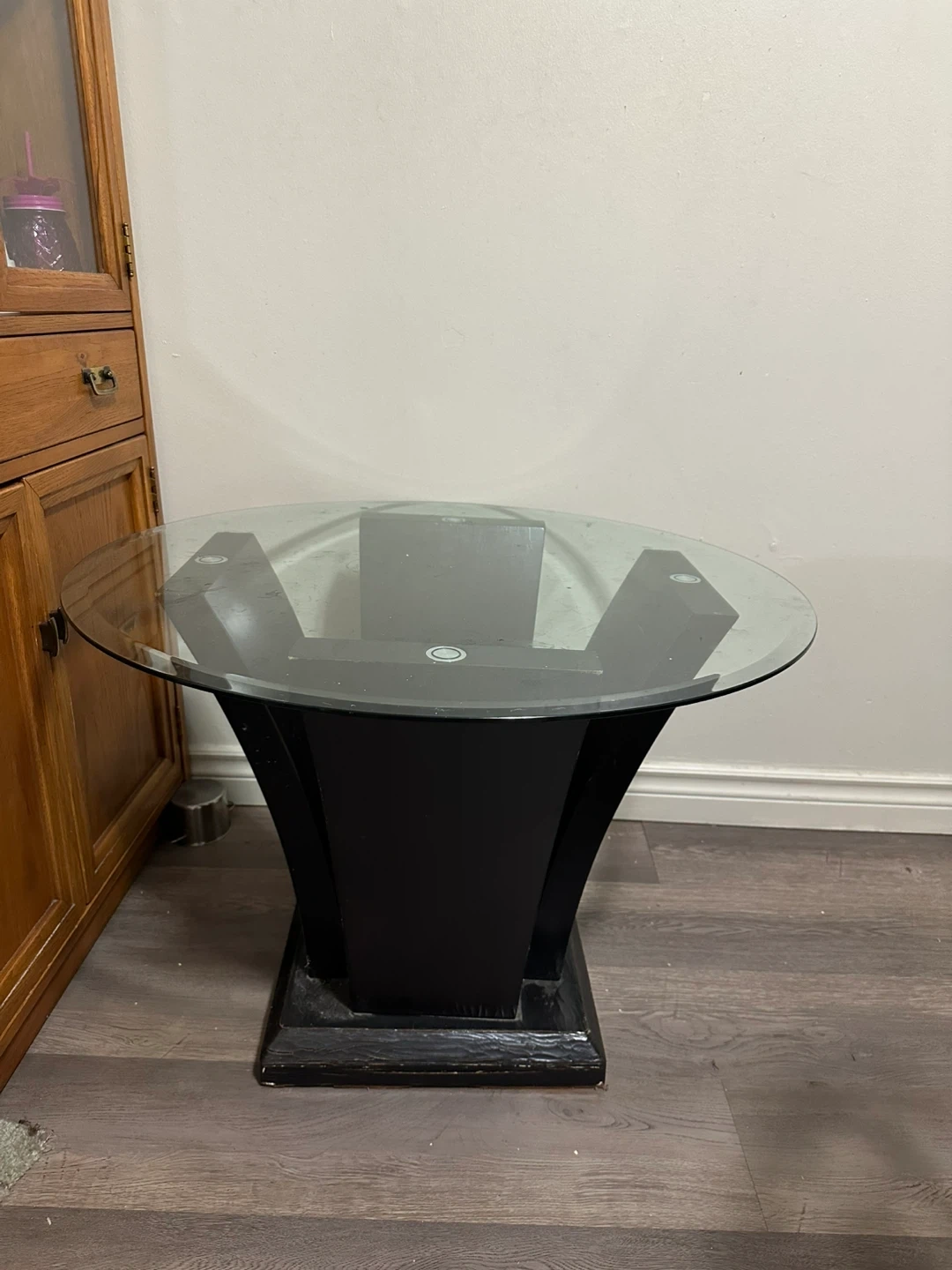 20Selling a glass top coffee table with a black base. It's in good condition and would be a great addition to any living room. The base has a unique design, adding a touch of elegance to your space