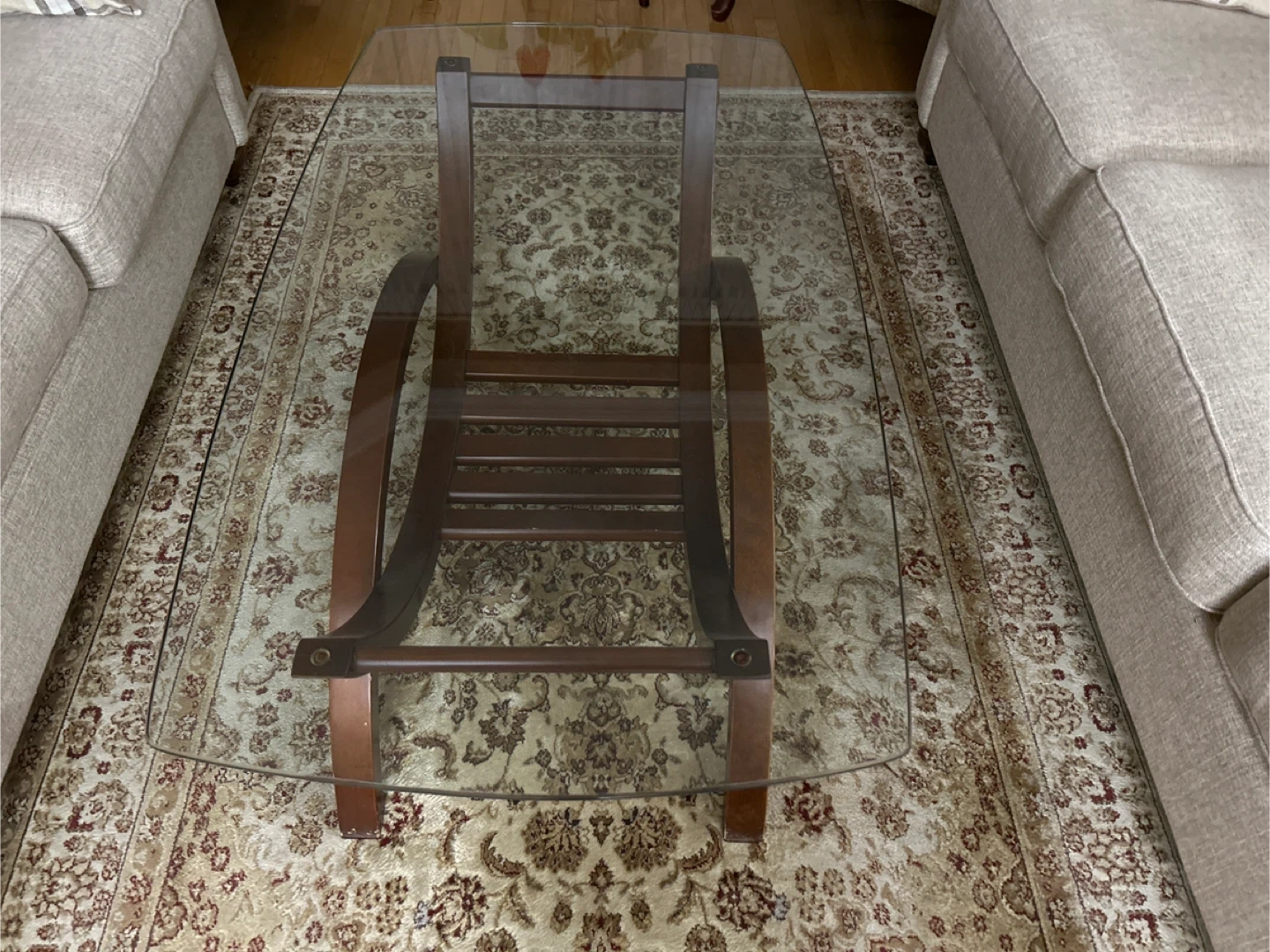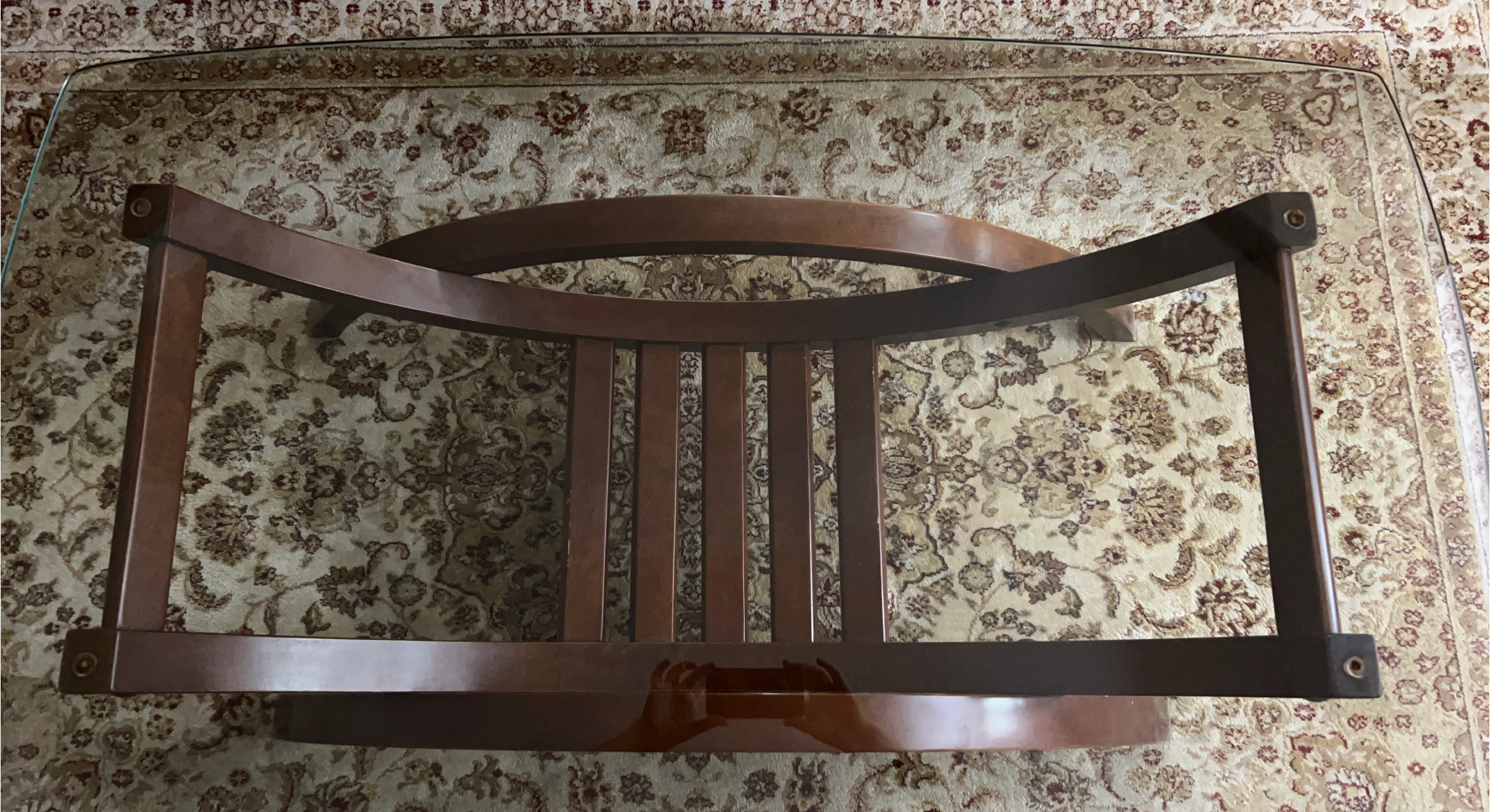Selling a glass top coffee table. It features a sturdy wooden base with a unique curved design. The glass top is in great condition and provides a sleek, modern look. Perfect for any living room!