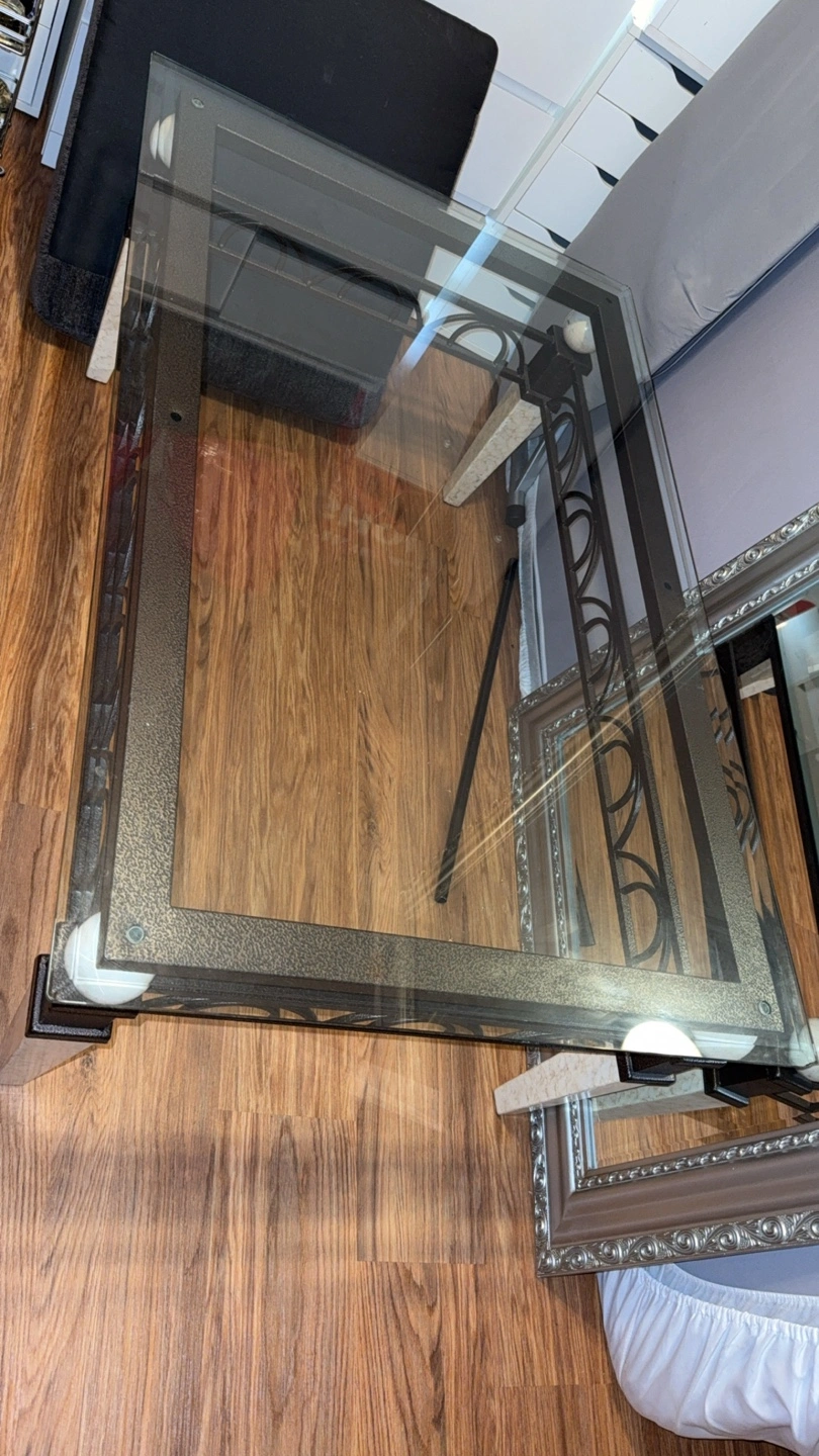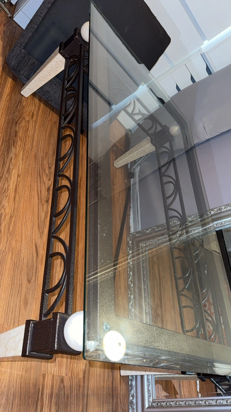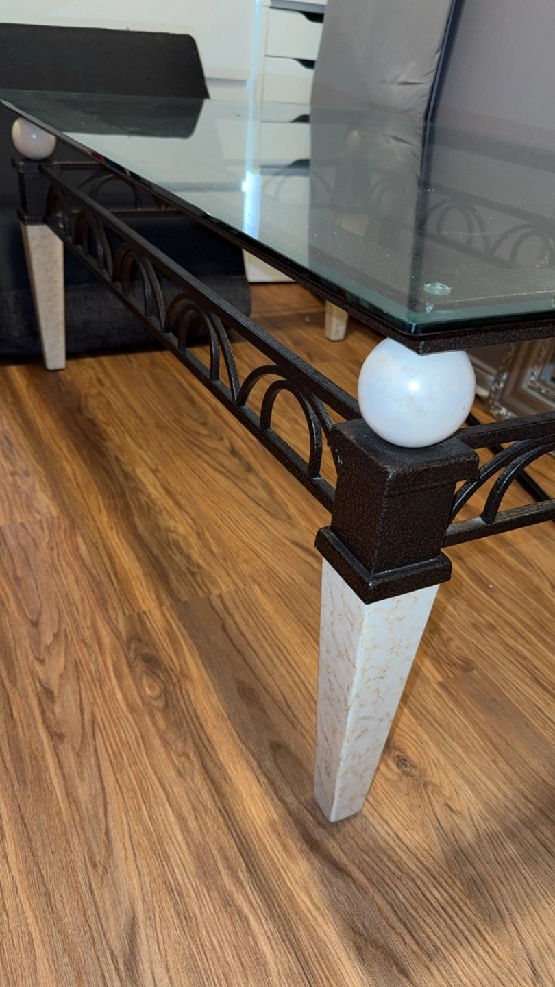 Selling a coffee table with a glass top and a decorative metal frame. The legs have a marbled look and round decorative accents. It measures approximately 47 inches in length.
