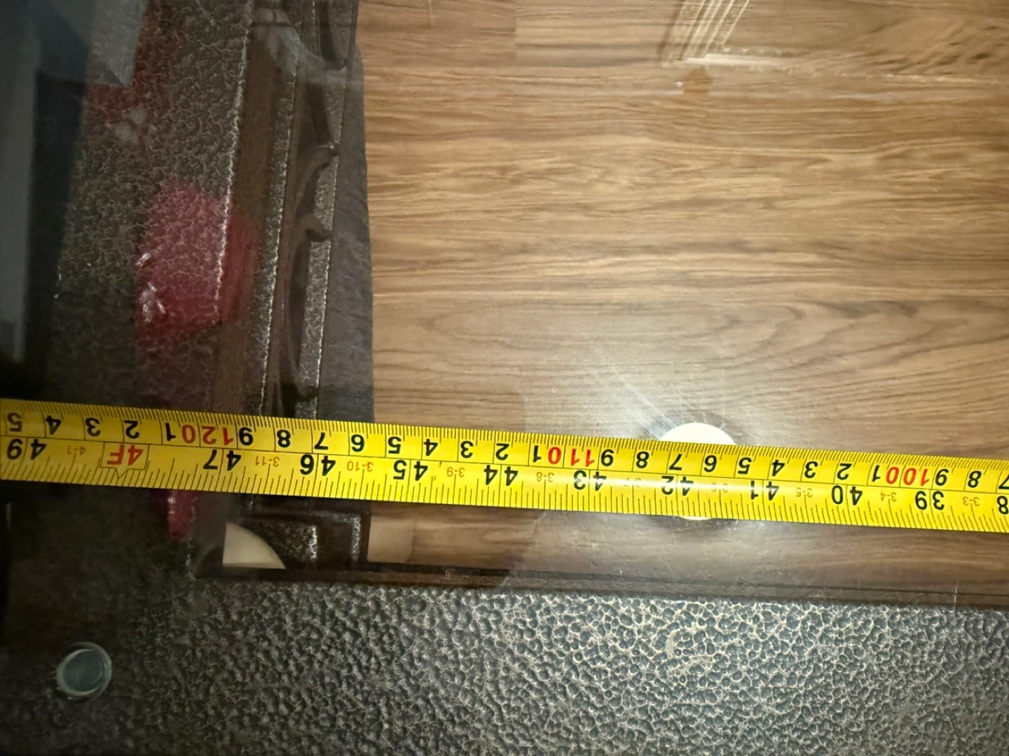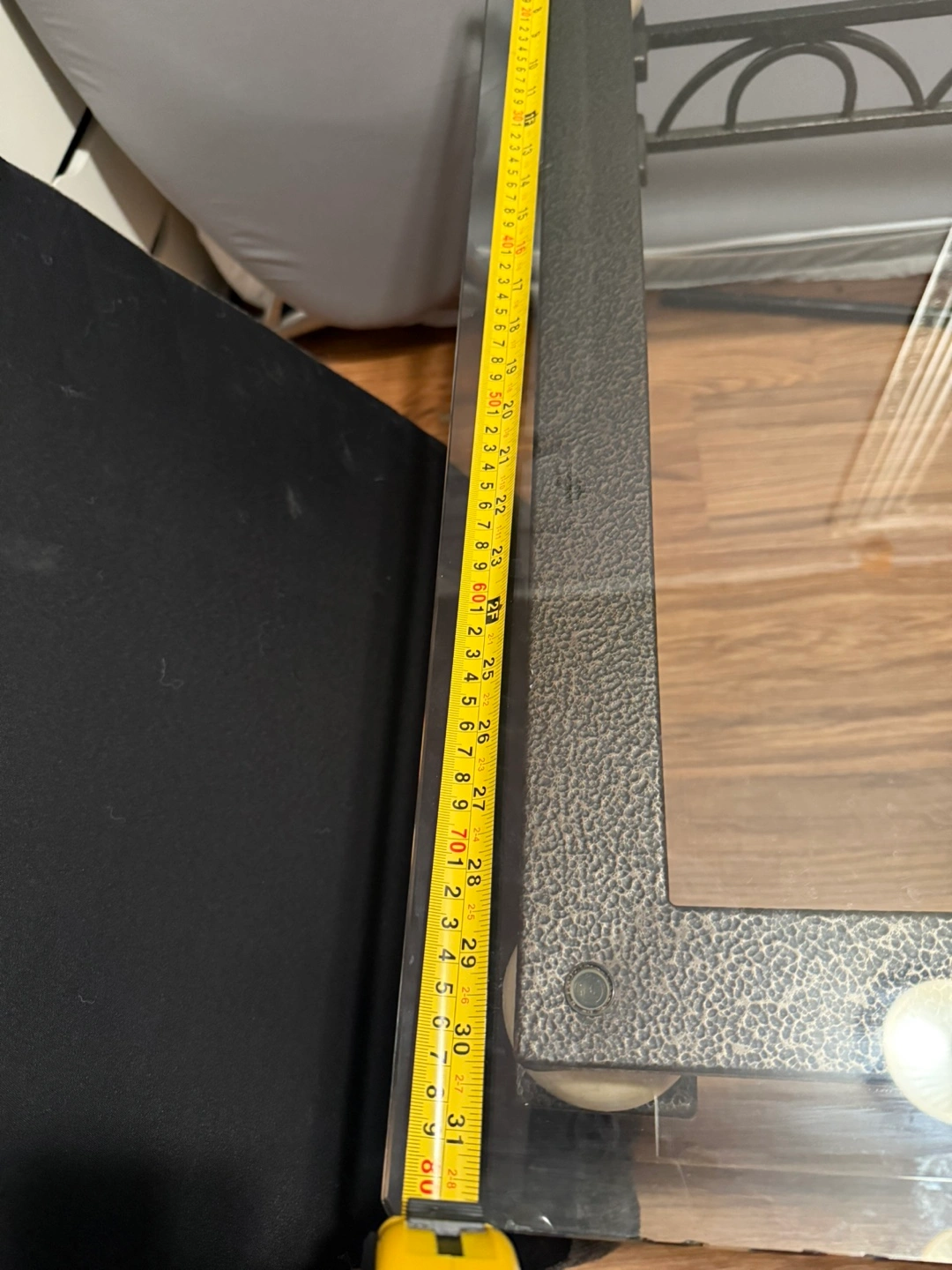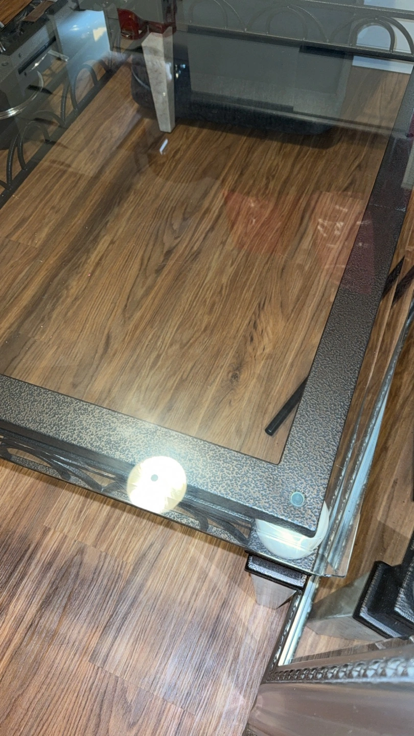 Selling a coffee table with a glass top and a decorative metal frame. The legs have a marbled look and round decorative accents. It measures approximately 47 inches in length.