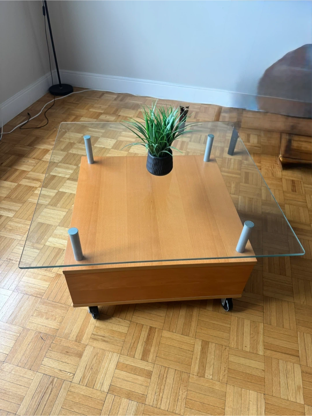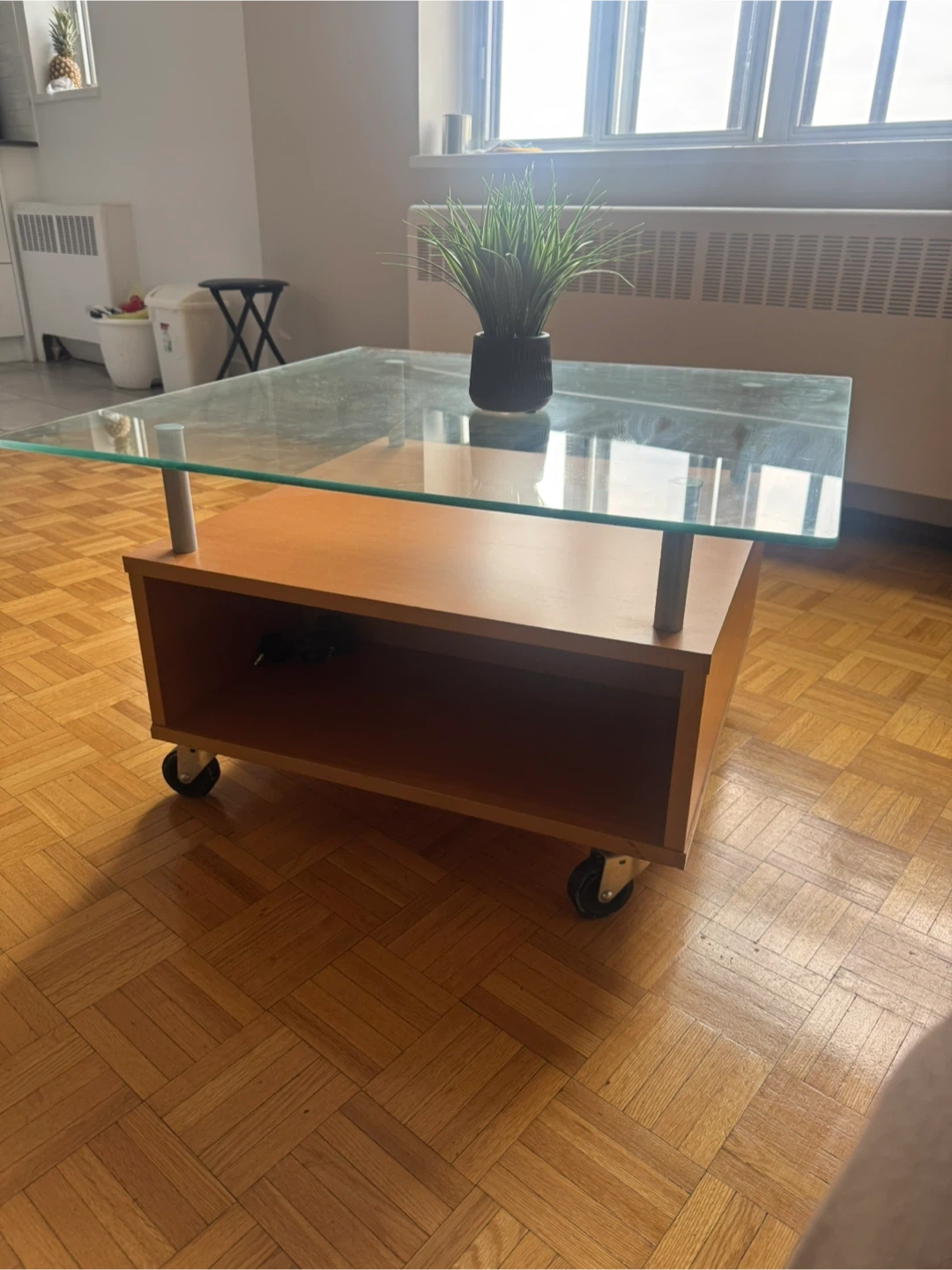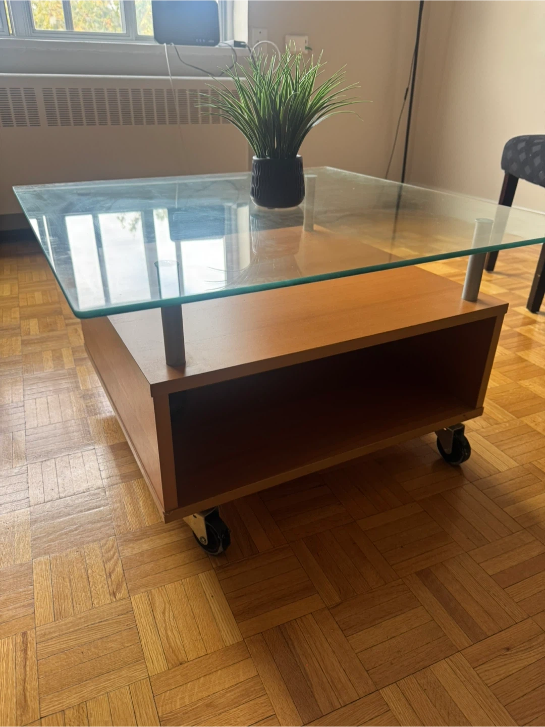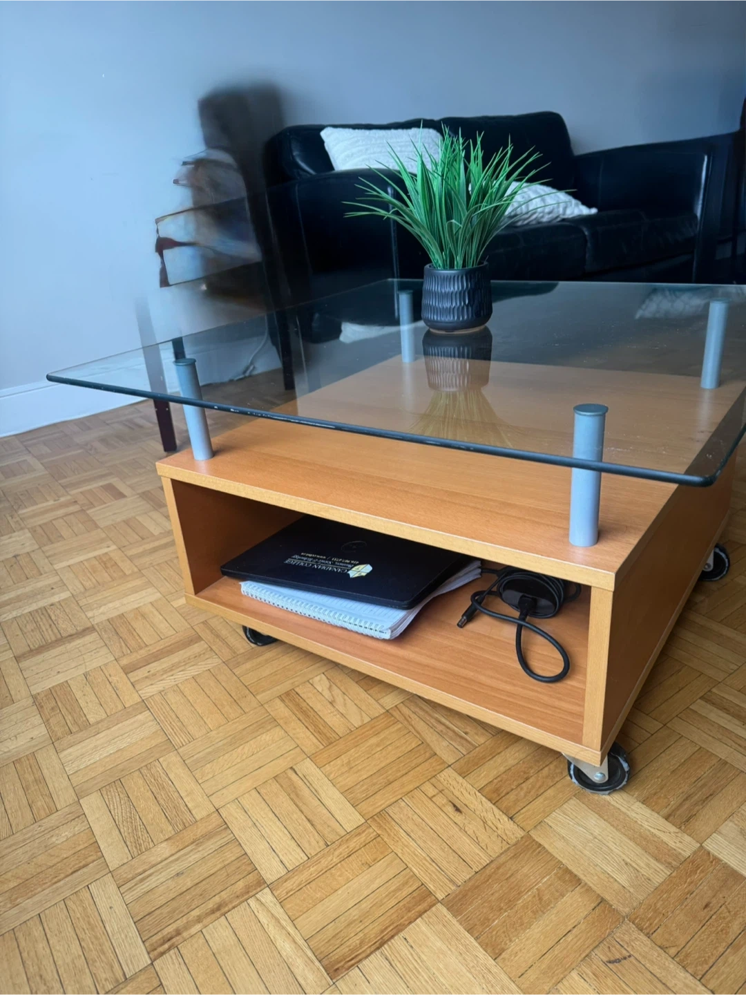 20Selling a coffee table with a glass top and a wooden base on wheels. It's perfect for adding a modern touch to your living room. The wheels make it easy to move around for cleaning or rearranging your space. It's in great shape and ready for a new home