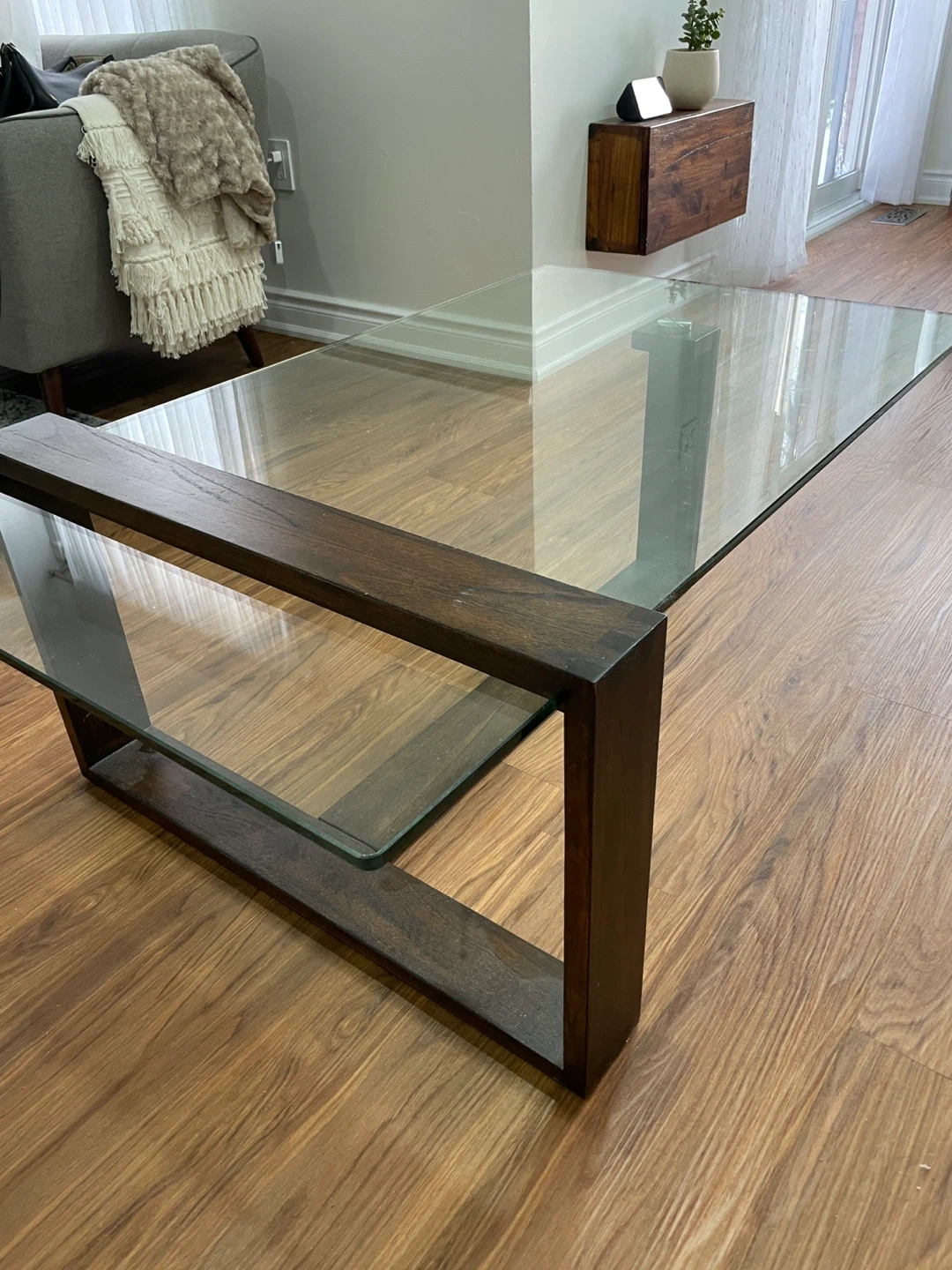 60Stylish modern coffee table featuring a thick tempered glass top and a solid wood base in a rich walnut finish. The sleek design blends beautifully with any contemporary or minimalist décor. • Sturdy and stable construction • Easy to clean glass surface • Perfect for living rooms or lounge spaces Condition: Gently used, in excellent condition (no cracks or chips).