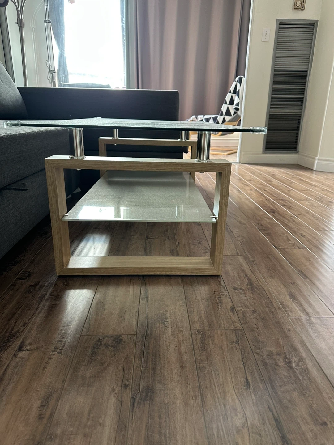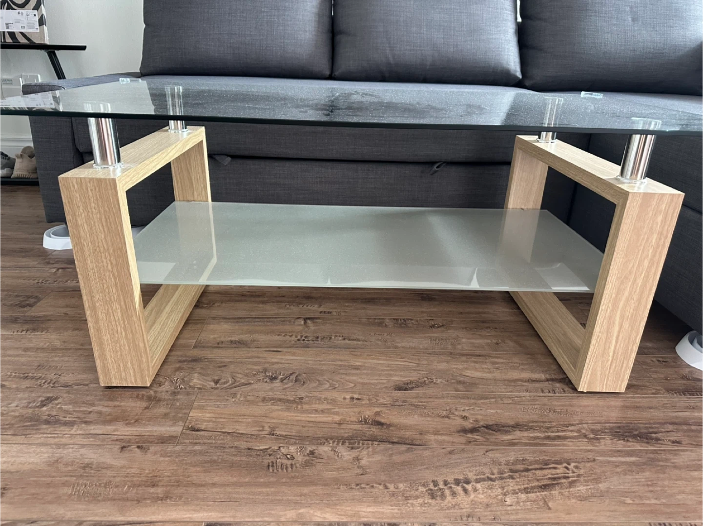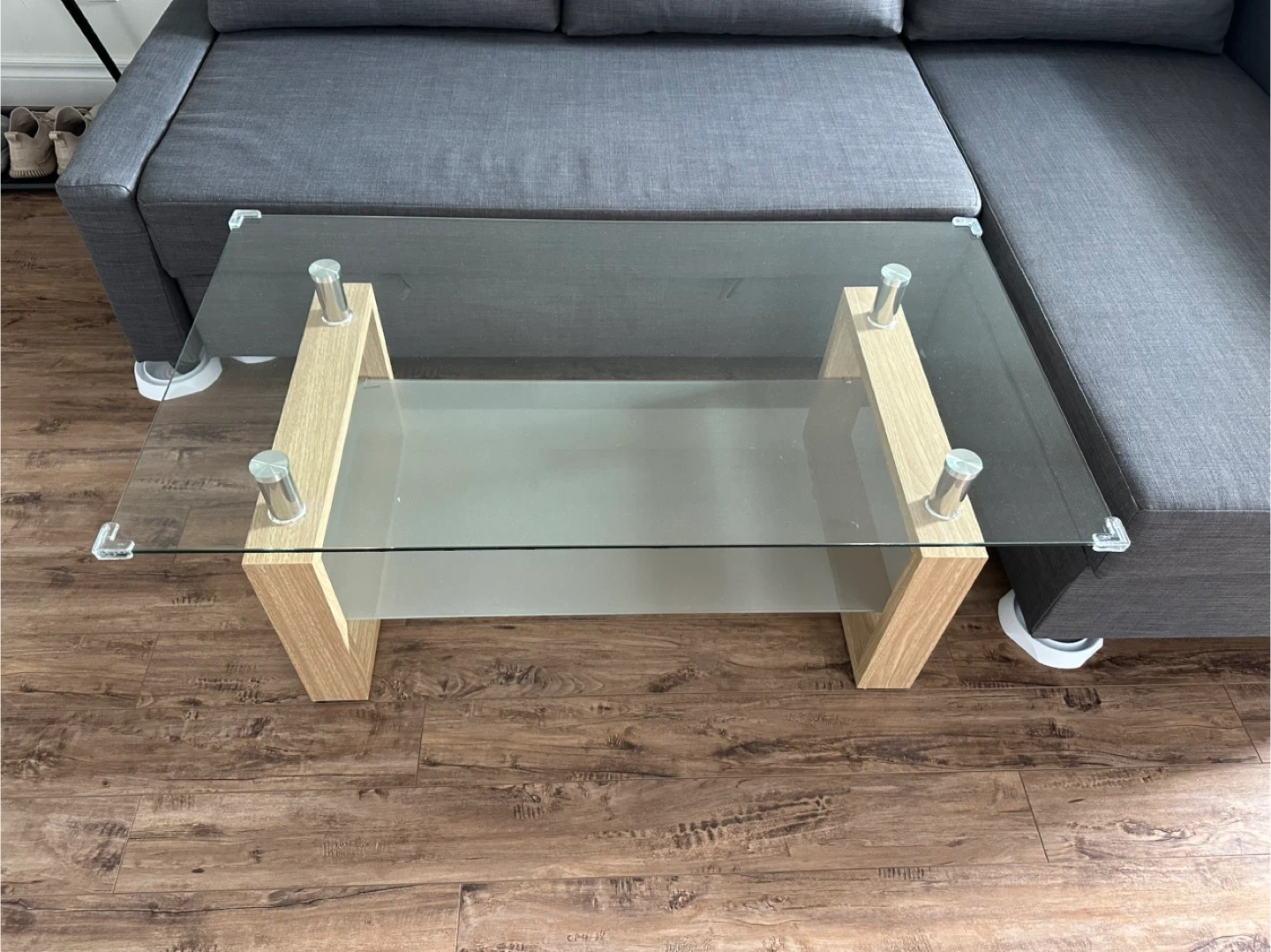 Selling a coffee table with a glass top and a light-coloured wooden base. It's in great shape and would be a stylish addition to any living room. The table also features a lower shelf, perfect for storing books or magazines! Length: 110 cm Width: 60 cm Almost new glass coffee table. Pick up only. No scratches or damage.