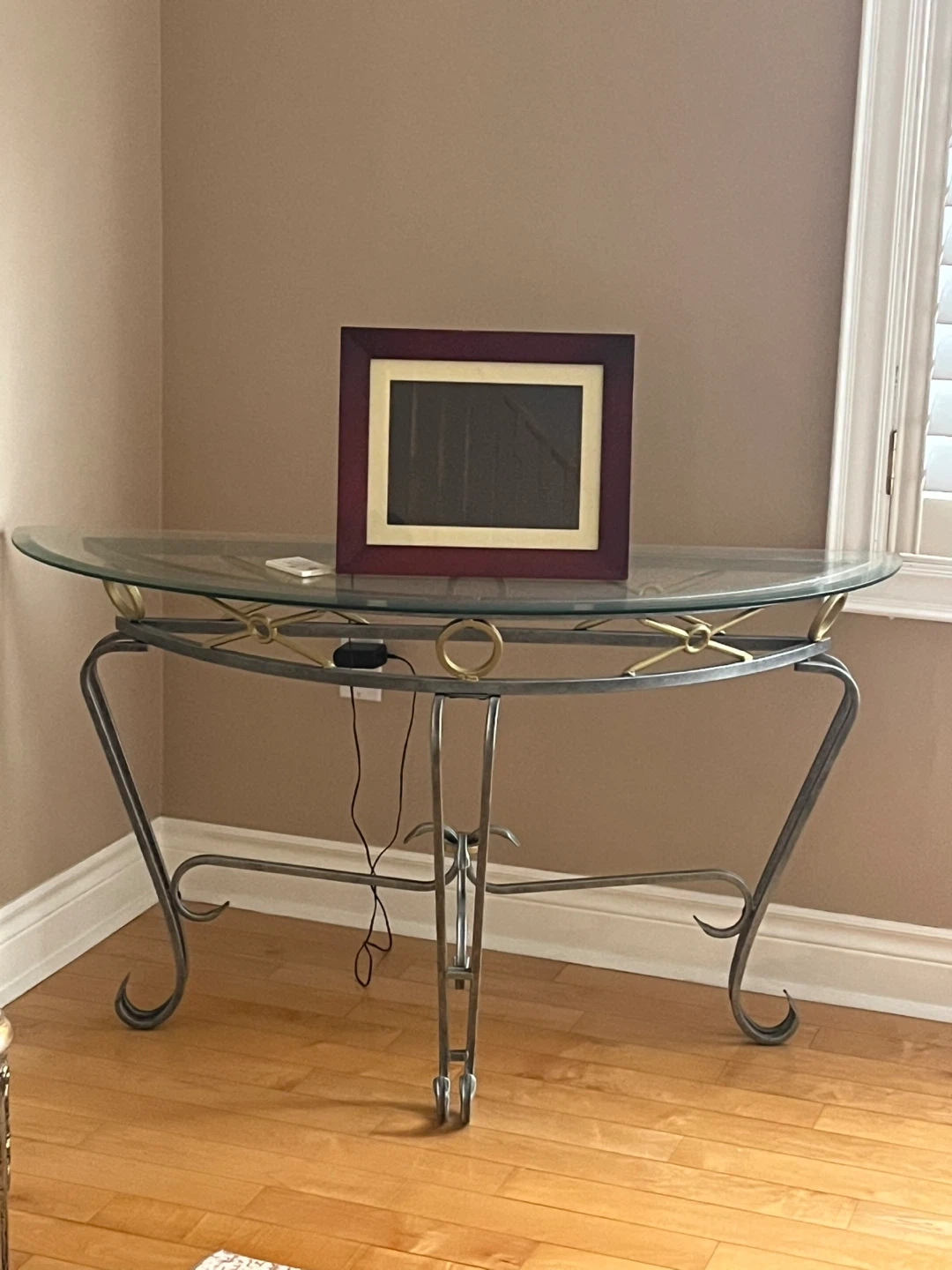 10Selling a stylish glass top console table with a metal base. It's in great condition and would look lovely in an entryway or living room. The table features a curved design and is perfect for displaying decorative items or holding everyday essentials.