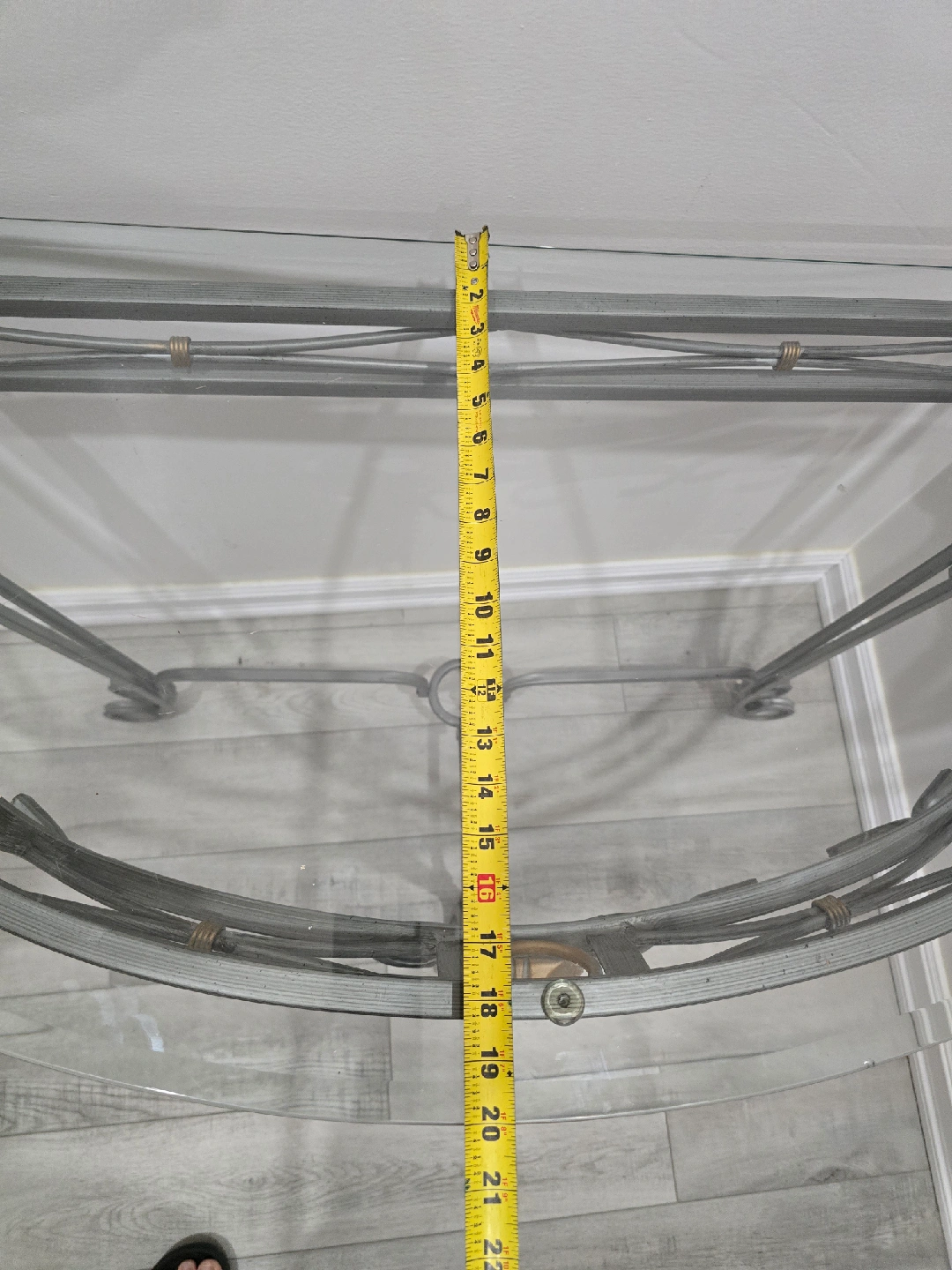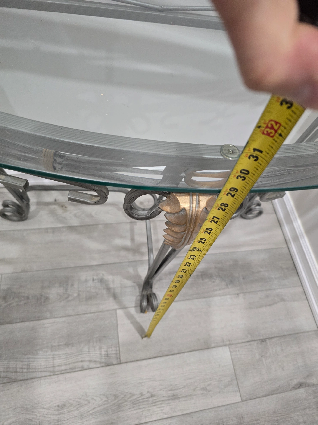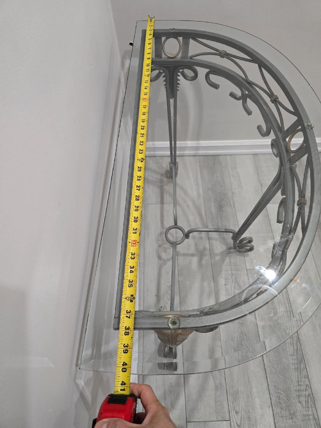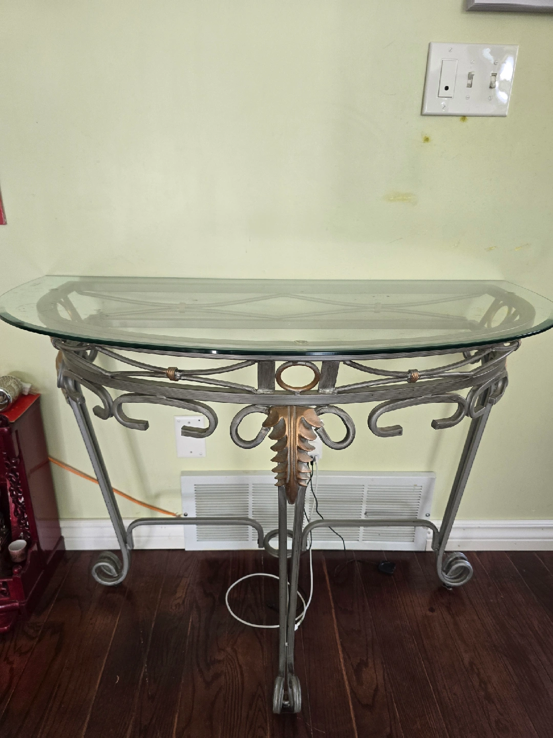 Selling a lovely glass top console table! It features a metal frame with decorative accents. The table measures approximately 41 inches in length and 32 inches in width. It would be a great addition to any entryway or living room