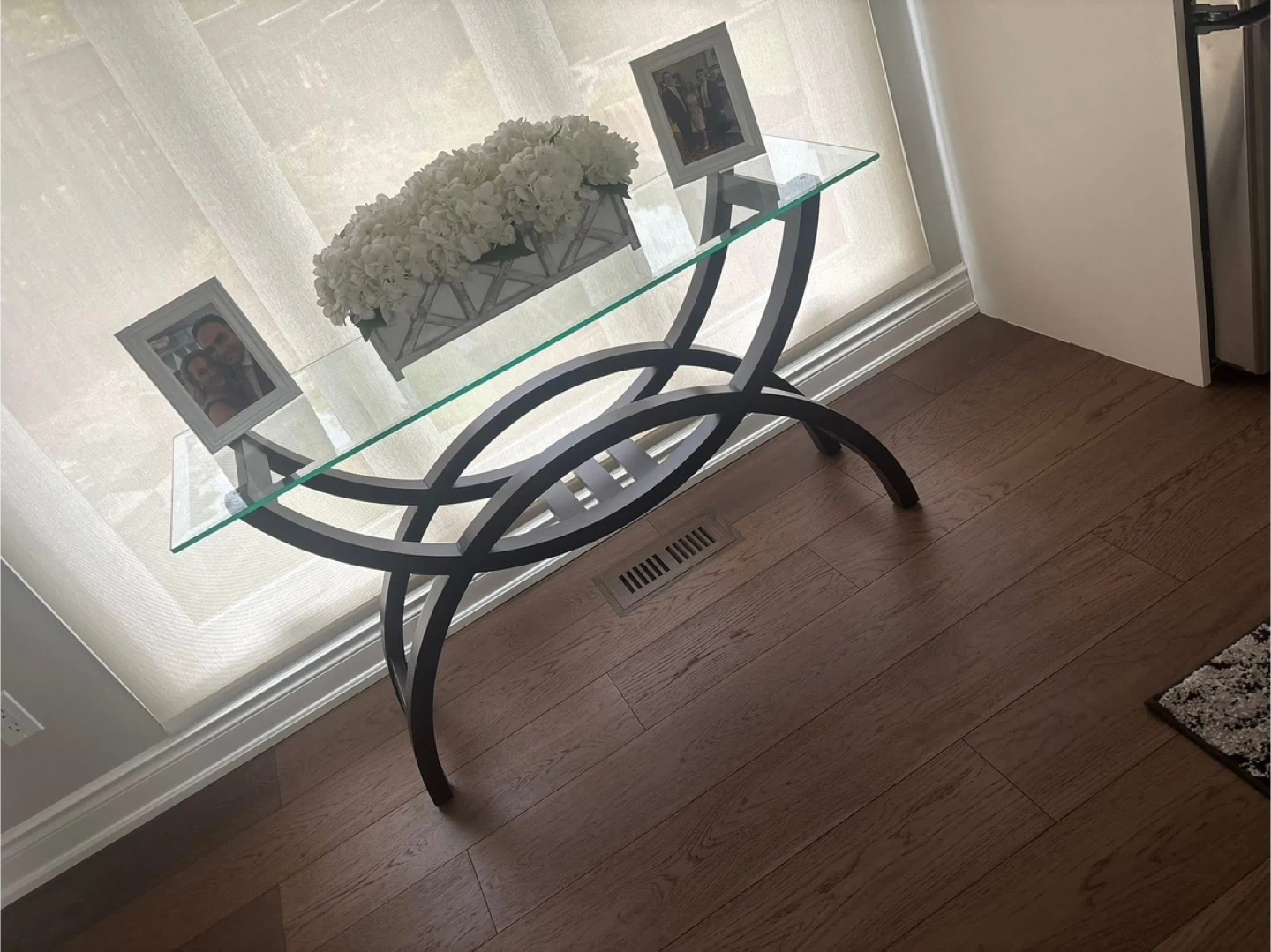 10Selling a stylish console table featuring a glass top and a wood base design. It's perfect for adding a modern touch to your entryway or living room. The table is in great condition and ready for a new home!