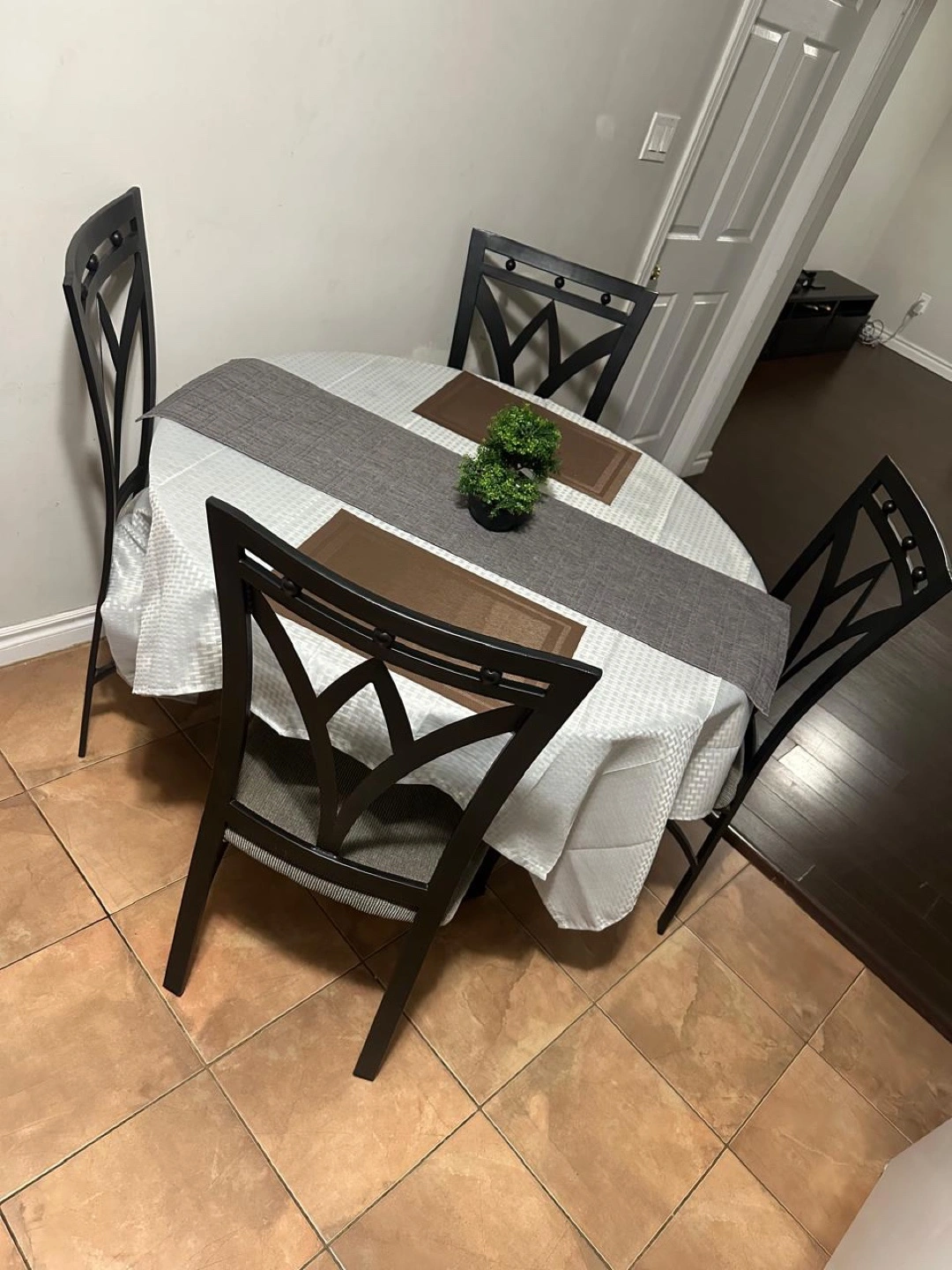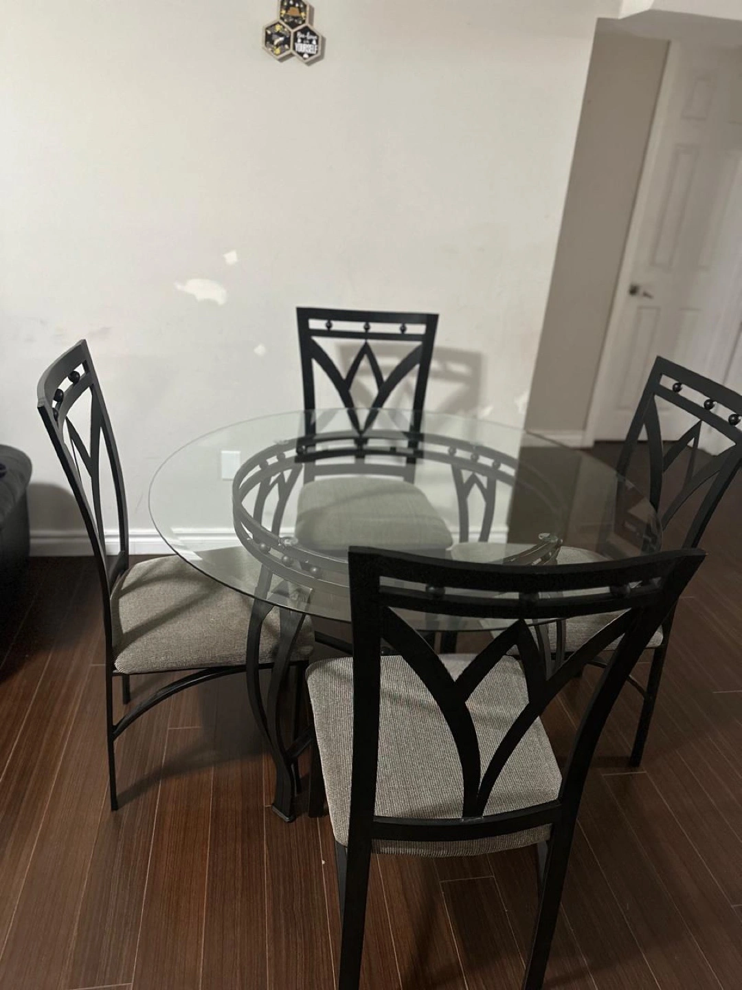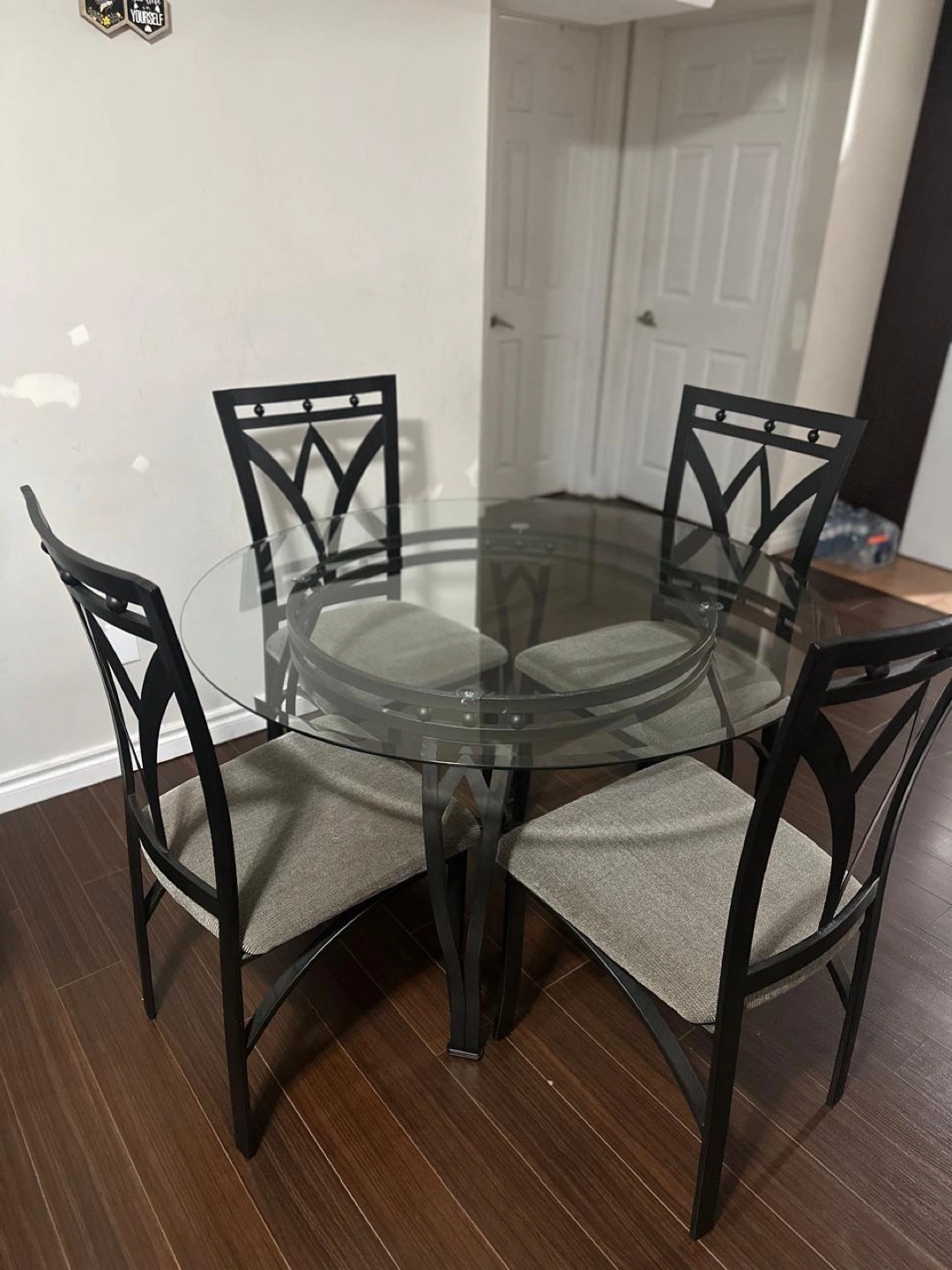 291Round glass table and four metal chairs. Grey fabric cushions. Elegant design. Perfect for small spaces. Like new . Almost never used for food or anything. Has been sitting mostly as decoration.
