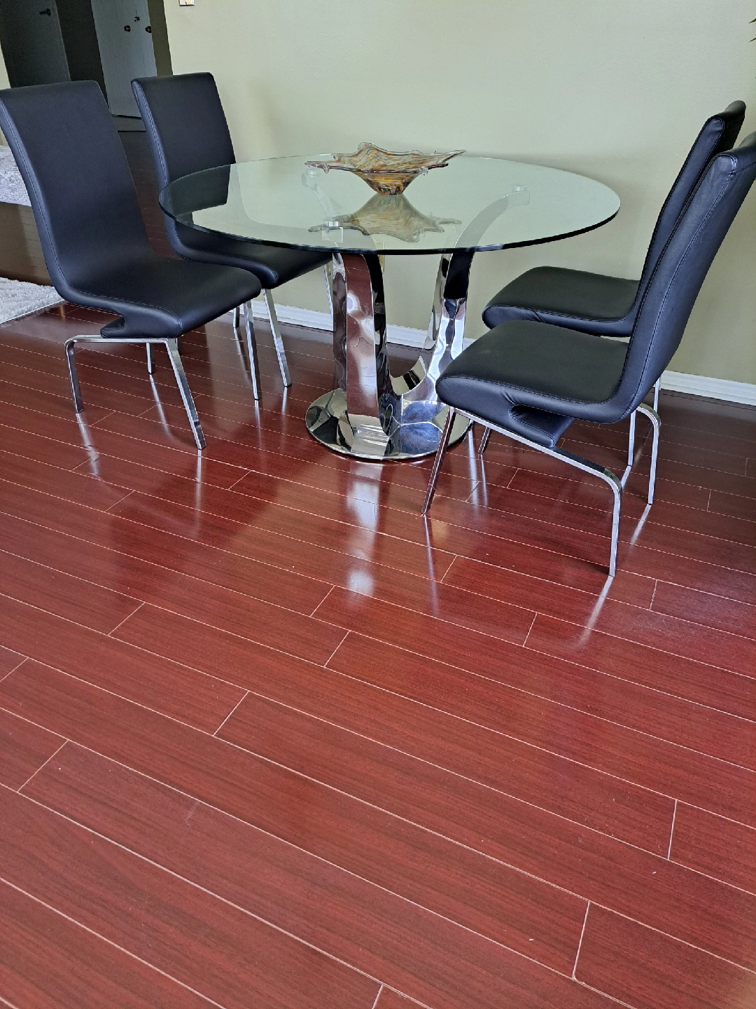 62Selling a stylish tempered glass top dining table complete with four sleek black chairs. This set would be a great addition to any dining space, adding a touch of modern elegance. The chairs are comfortable and the table is easy to clean, making it perfect for everyday use