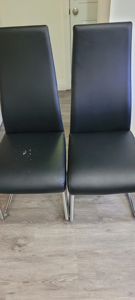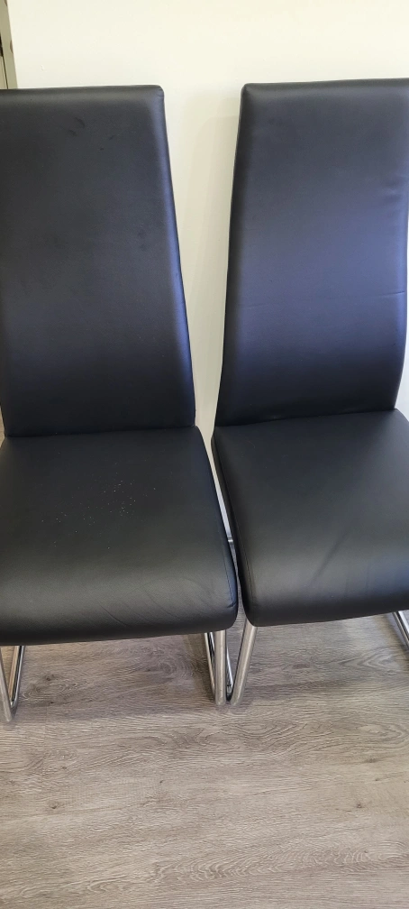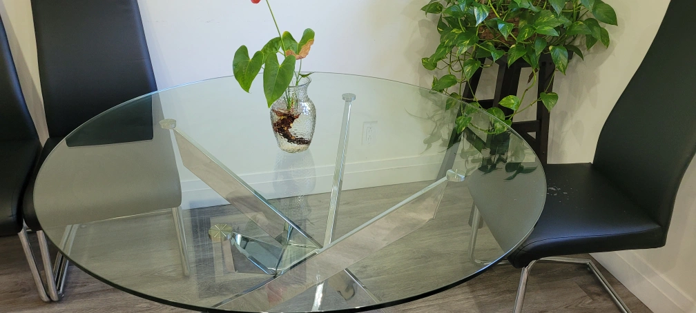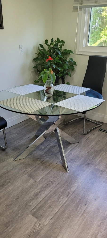 Selling a dining table with a glass top and a stylish, modern design. It comes with four black chairs that complement the table nicely. The chairs have a sleek, minimalist look with chrome legs. Perfect for a smaller dining space or kitchen!