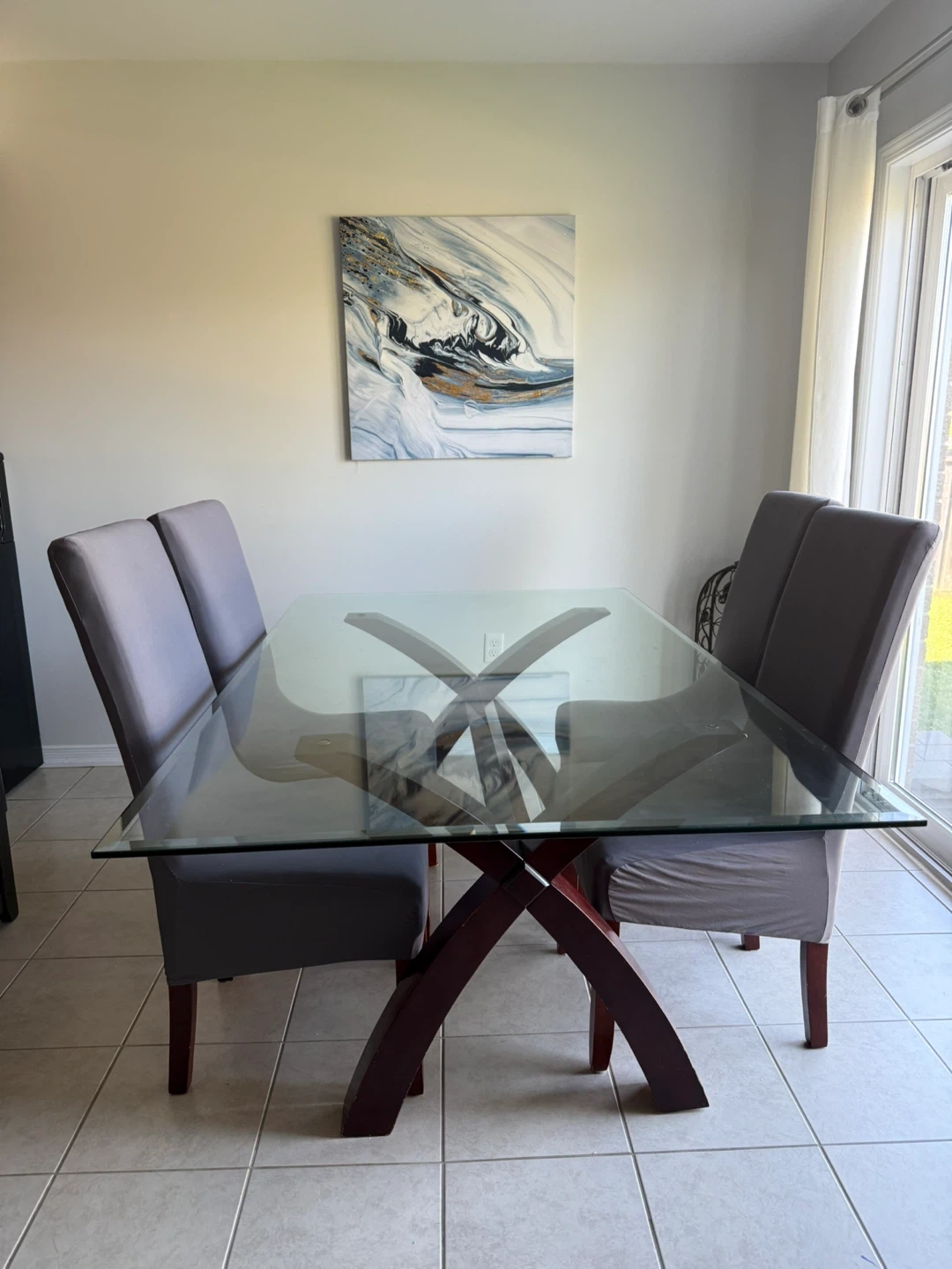 Selling a dining table with a glass top and four chairs. The table features a unique, modern design with a dark-coloured, cross-legged base. The chairs have grey covers Width - 42inches Length- 71 3/4 inches