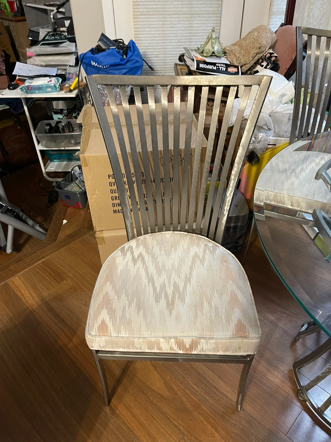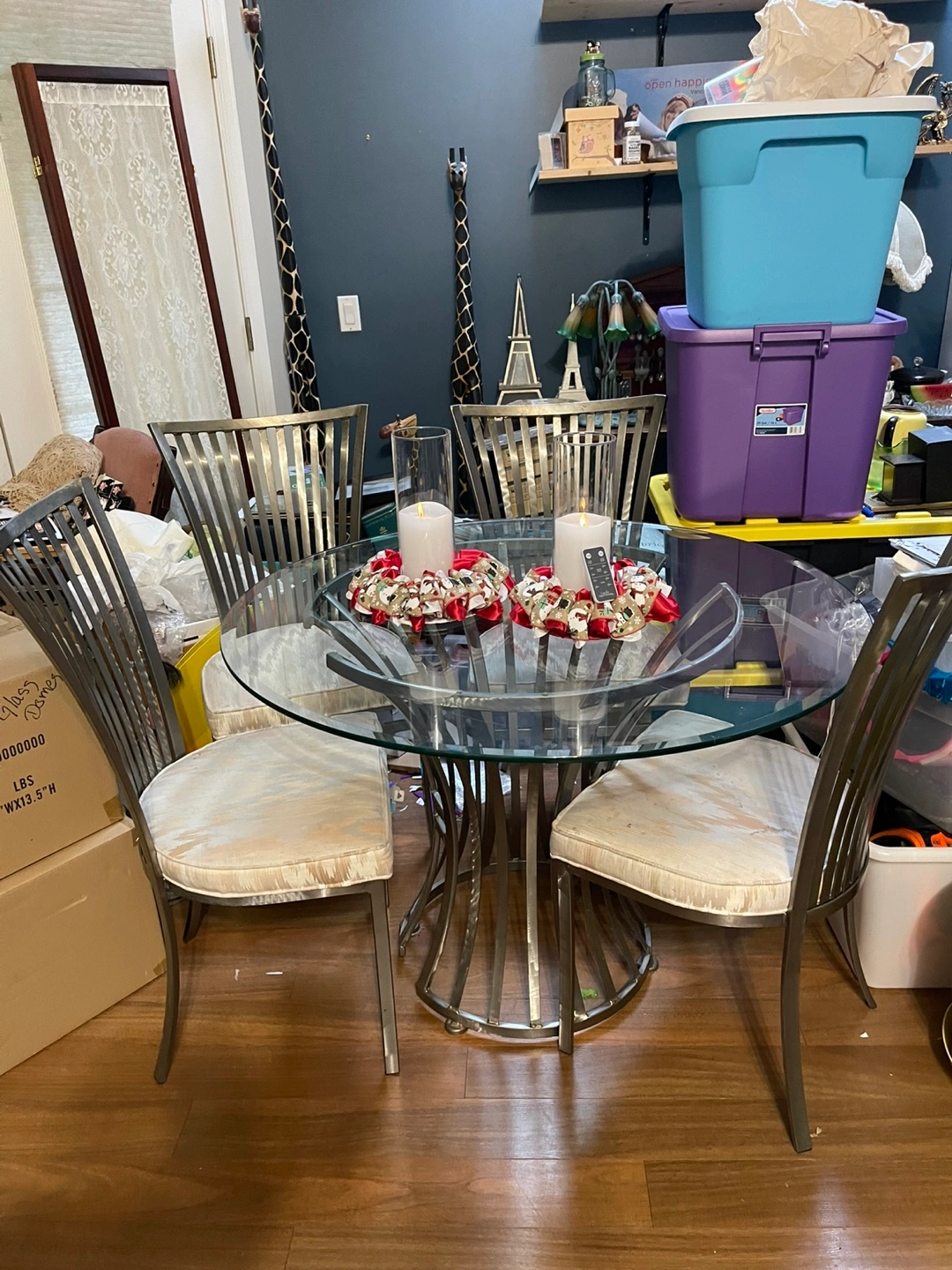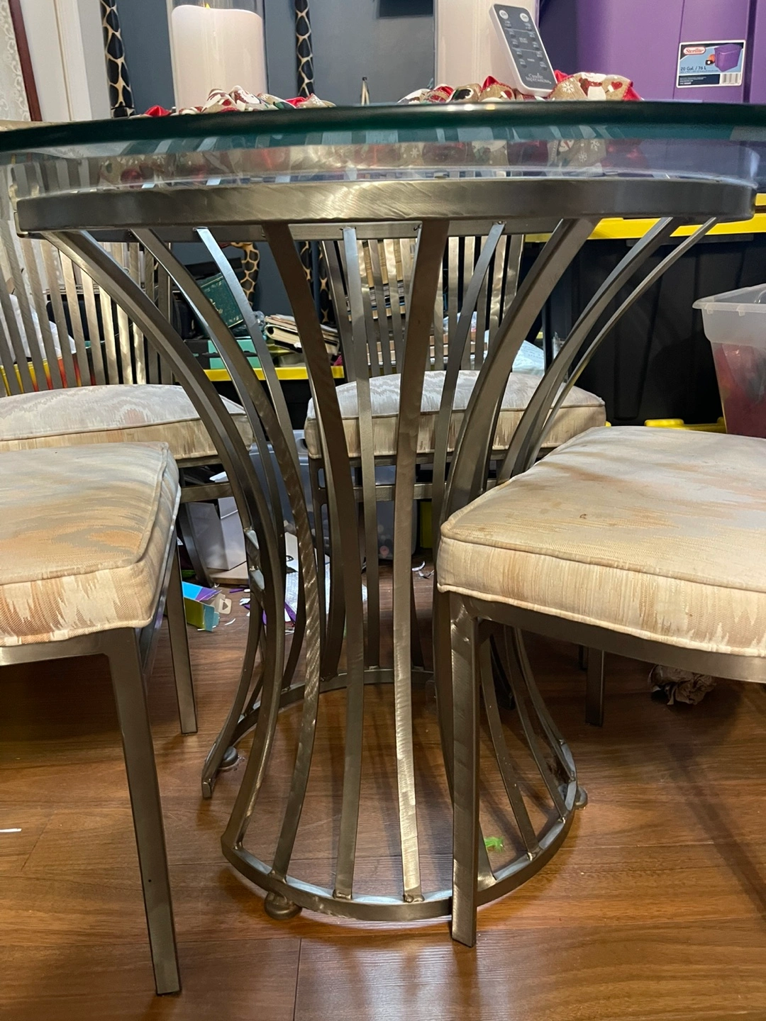 Selling a dining table with a glass top and four matching chairs. The table features a unique silver metal base. The chairs have padded seats with a patterned fabric. Perfect for a smaller dining space or kitchen!