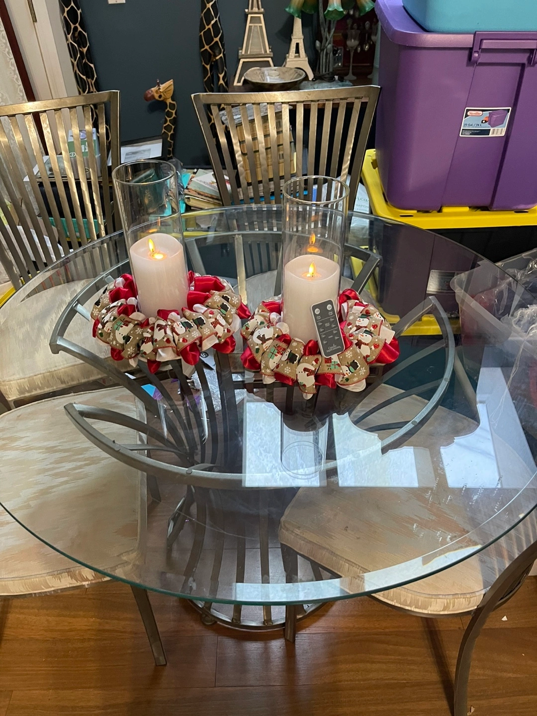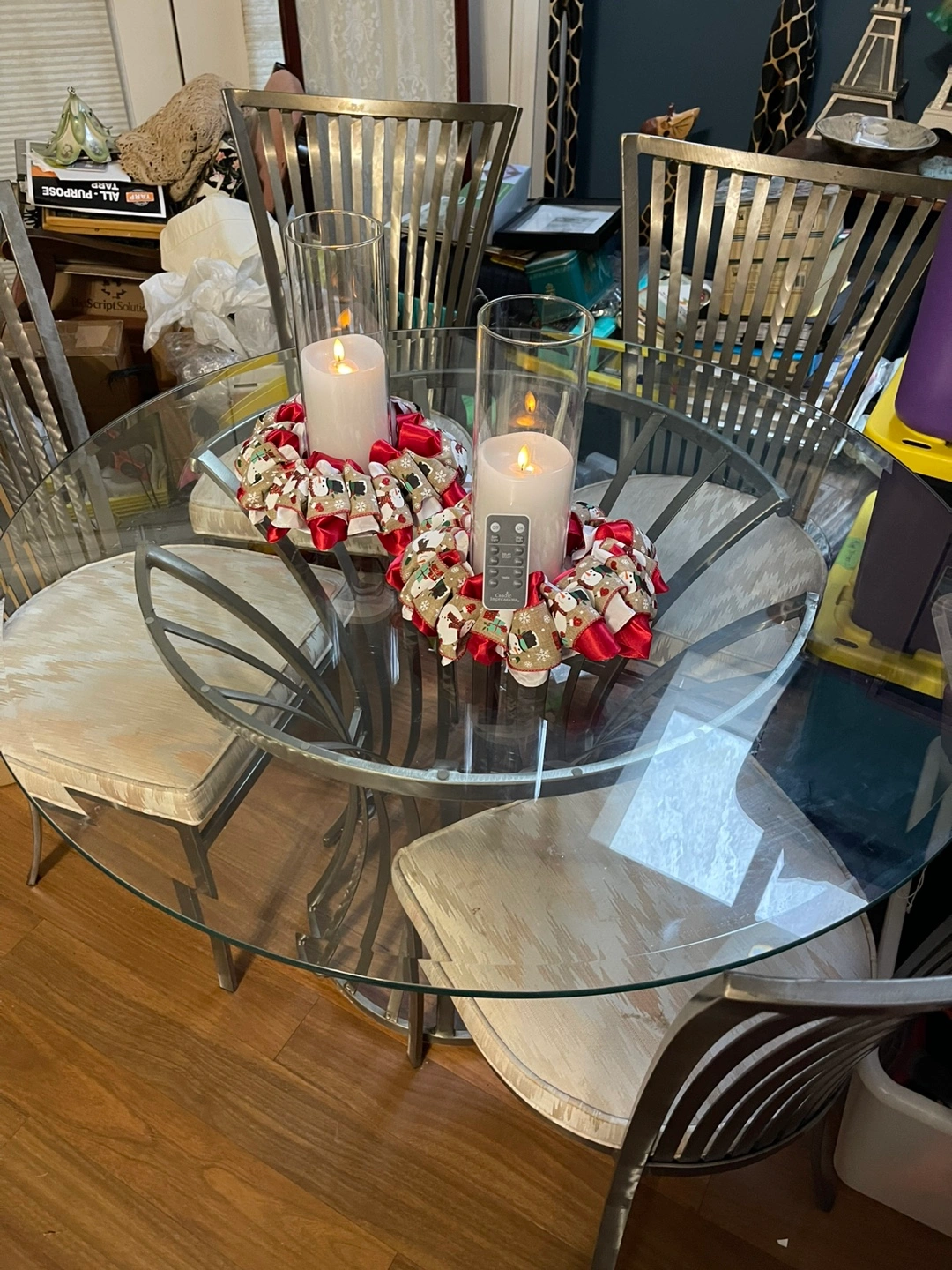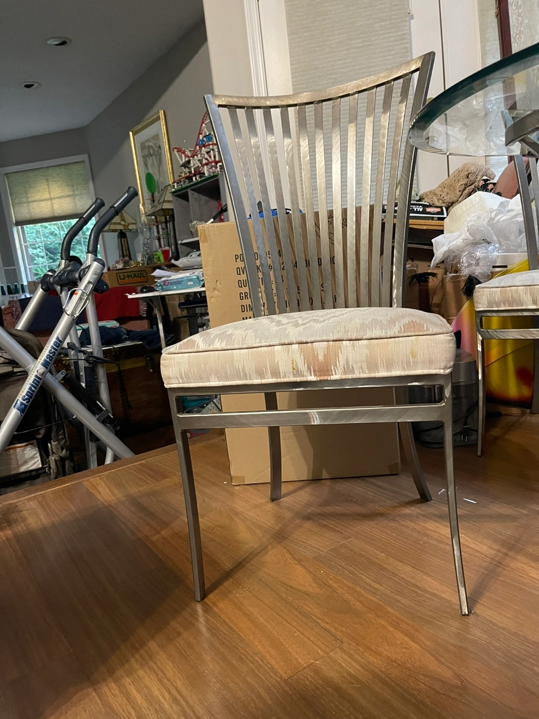 Selling a dining table with a glass top and four matching chairs. The table features a unique silver metal base. The chairs have padded seats with a patterned fabric. Perfect for a smaller dining space or kitchen!