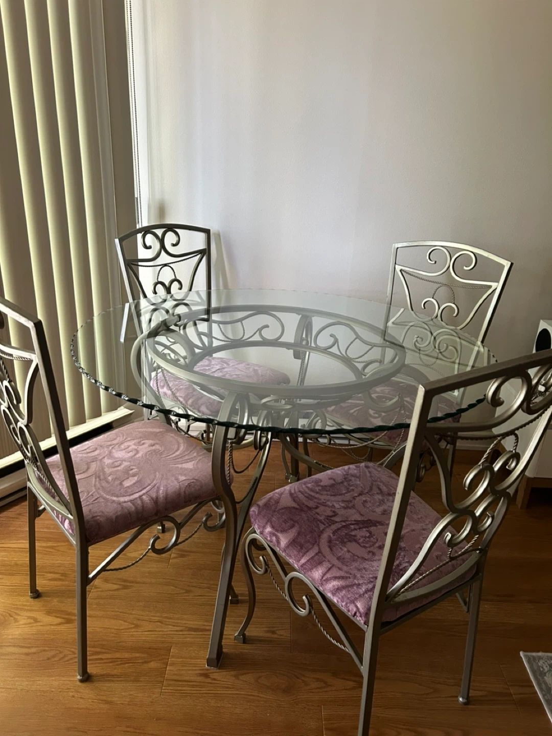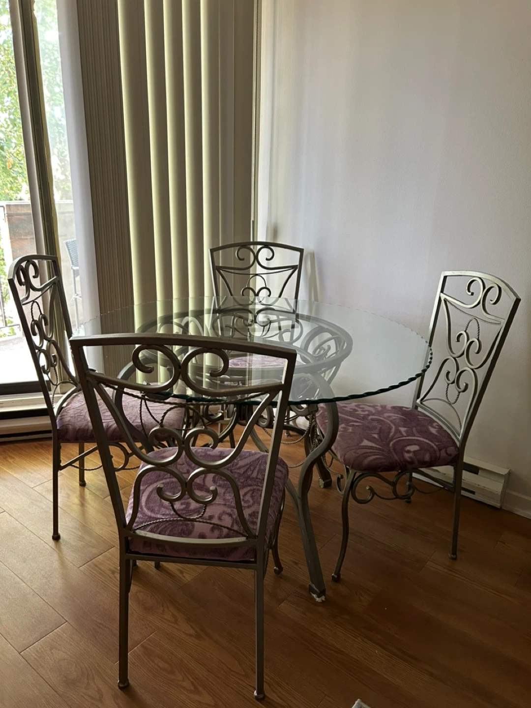 Selling a glass top dining table with four matching chairs. The set features an ornate metal frame and a round glass tabletop. The chairs have patterned purple cushions. It's a stylish set for any dining space!