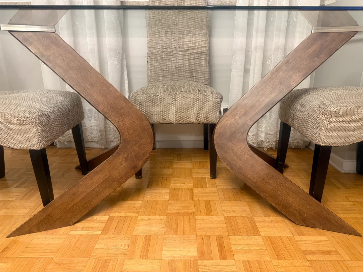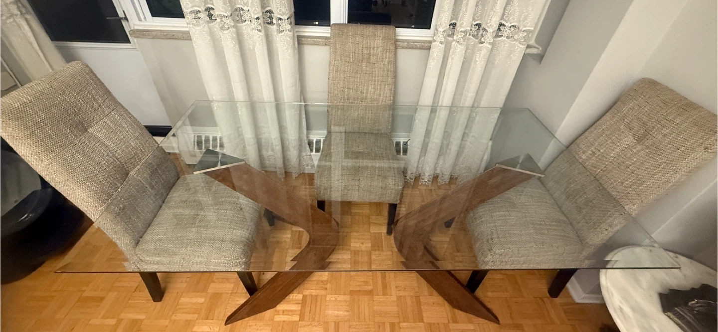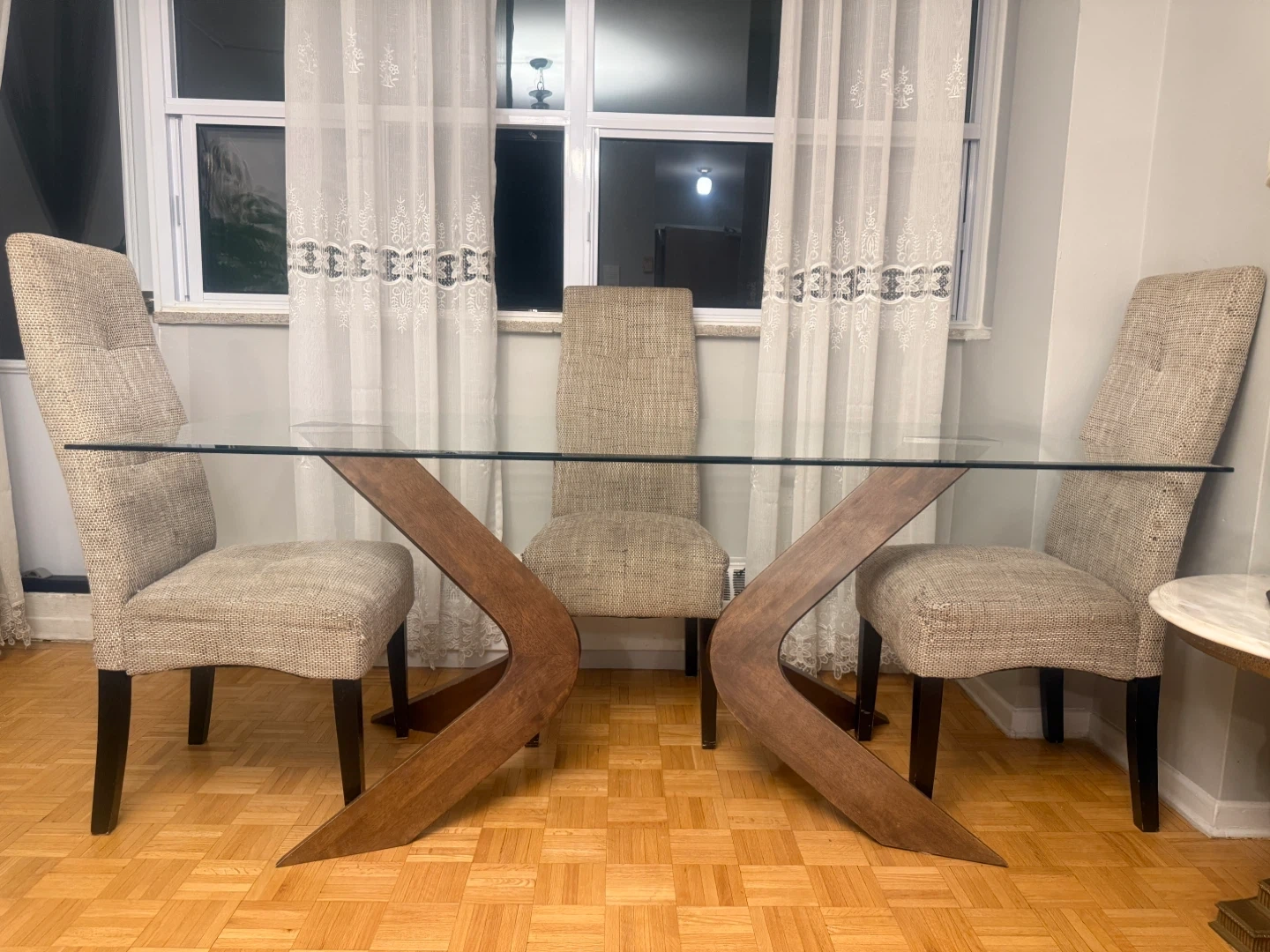 28Selling a glass top dining table with four chairs. The table has a unique wooden base and the chairs are upholstered with a neutral-toned fabric. Perfect for a dining room or kitchen space!