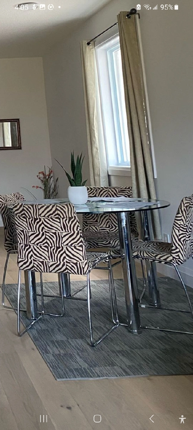 Selling a dining table with a glass top and four chairs. The chairs have a unique zebra print design. Perfect for a small dining area or kitchen!