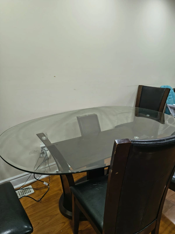 10Selling a glass top dining table that comes with six chairs. The chairs are brown with a dark brown wood finish. The table has a unique oval shape. Perfect for a small dining area!