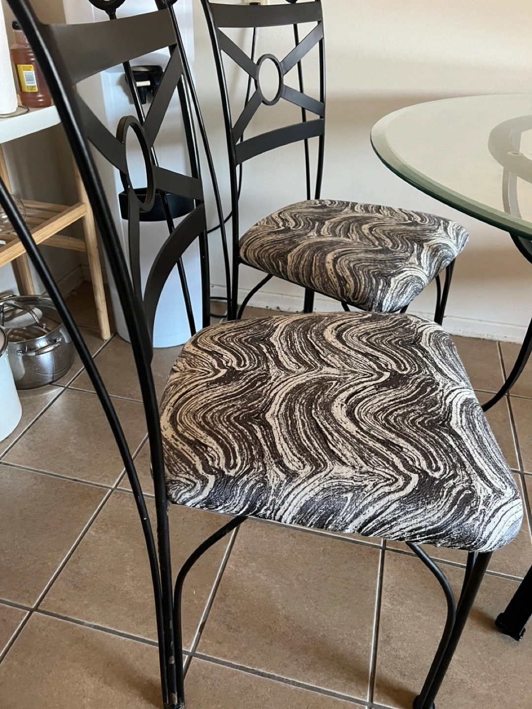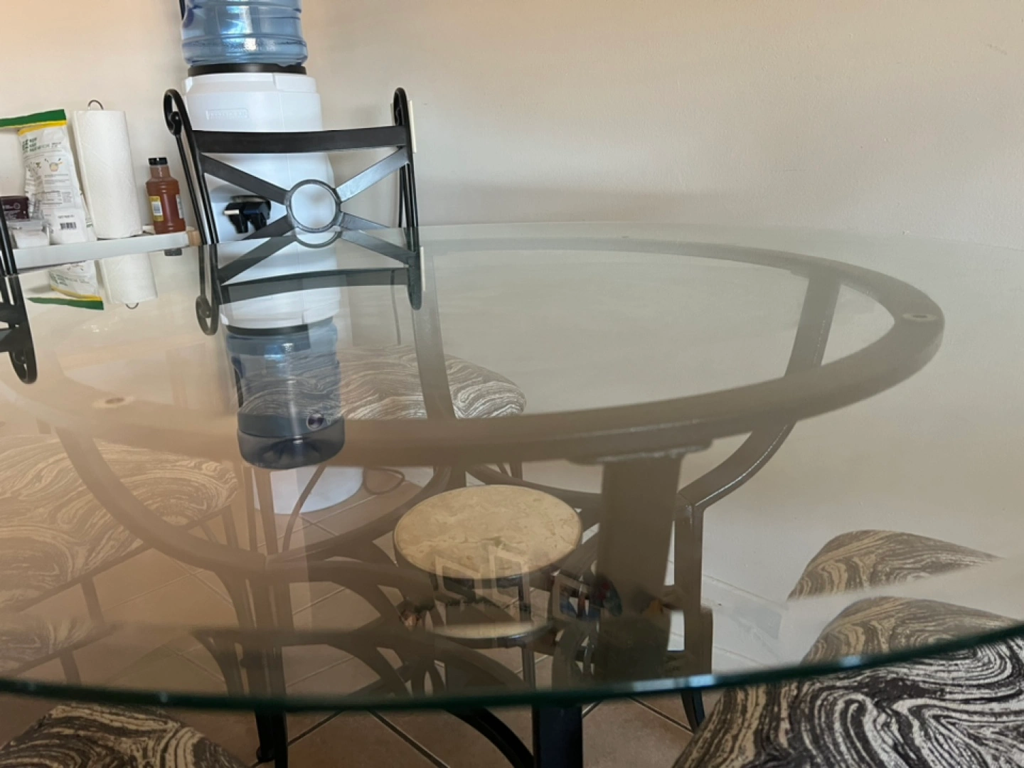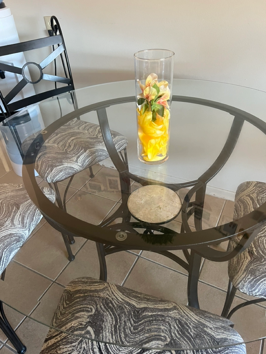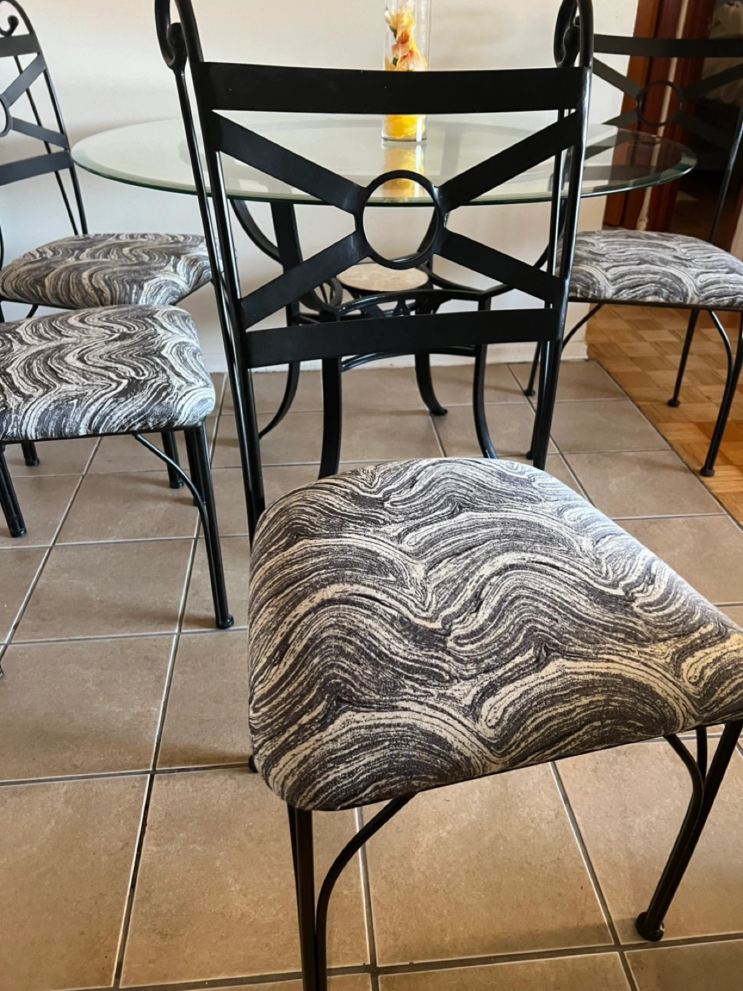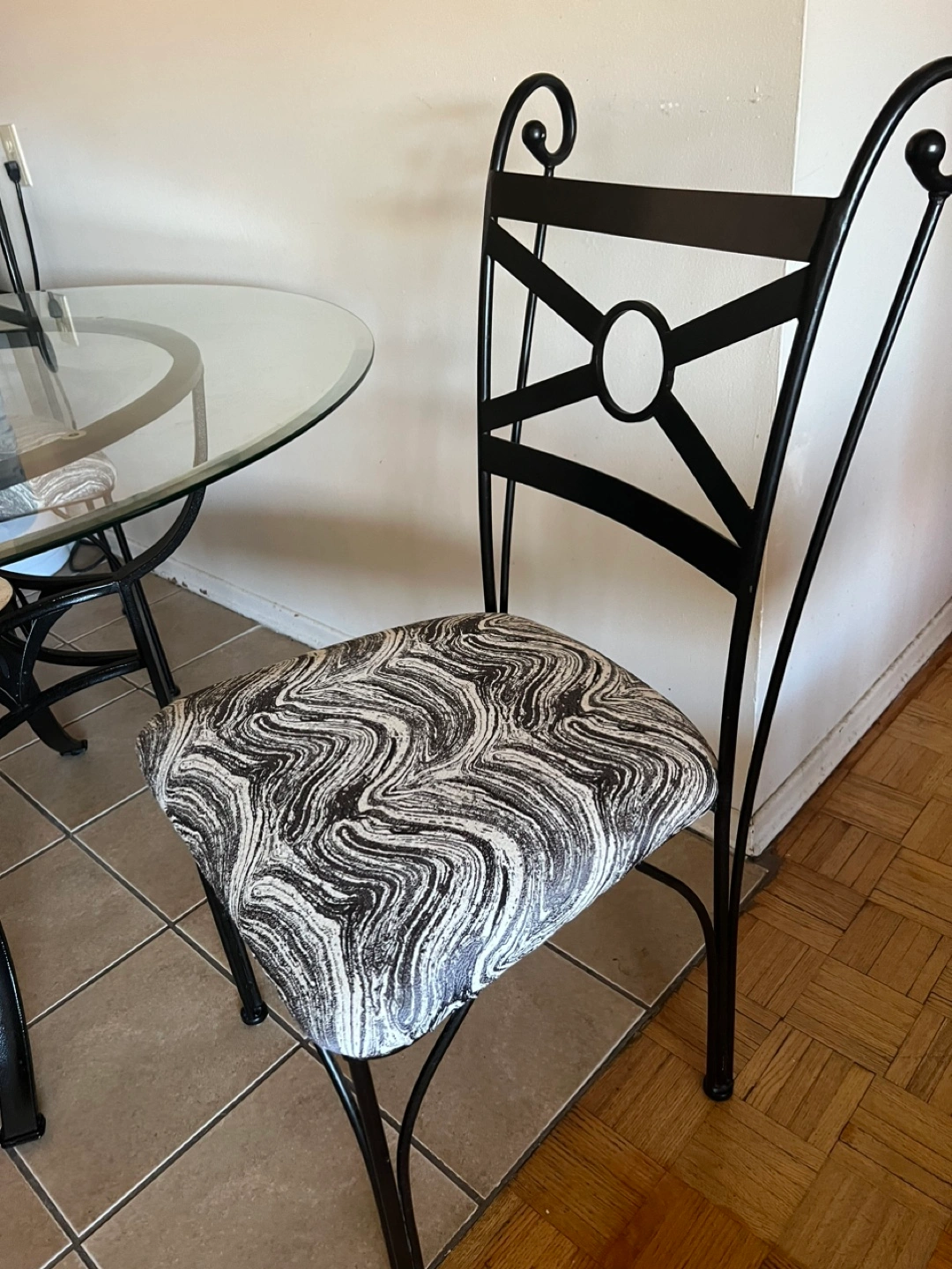 5Round glass table. Black metal frame. Four chairs included. Seats feature a grey and white swirl pattern. Minimalist style. Glass - 45” Height - 29.5” Wonderful Strong Dinning Table Set!(4 chairs included) They are strong since it is a metal frame and even 5 people can use (large glass) They have been taken care of well!(Pet free house) But there are some minor scratches/one rusted area of one of the chairs( check pictures ) Other than that, it is a mint condition! The glass is thick and strong and there is a marble underneath so it looks gorgeous! The price is firm and I am sorry I cannot deliver (moving needs a large car/truck : please measure your car trunk size before you come pick up! ) Please message me if you are interested! Thanks!
